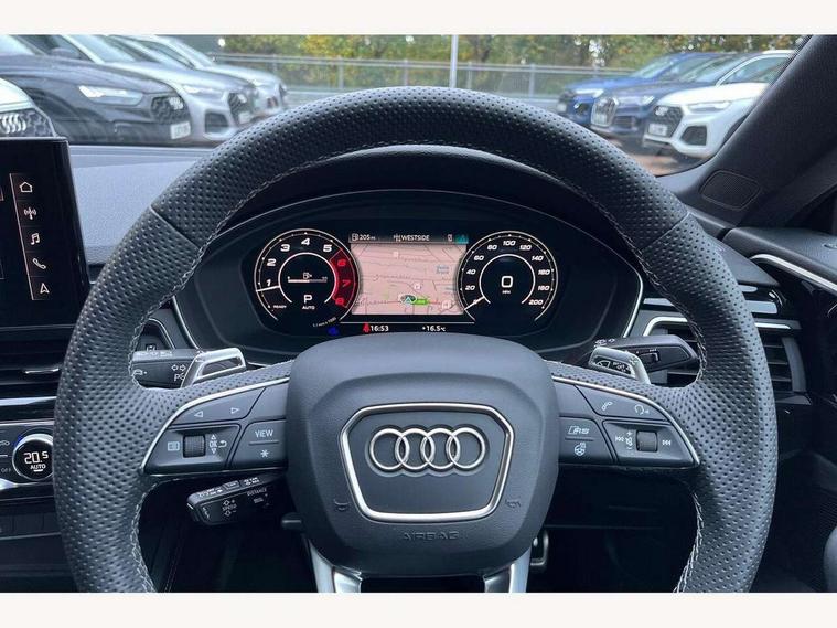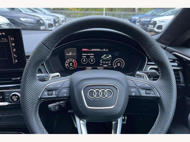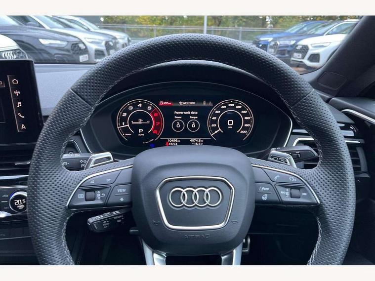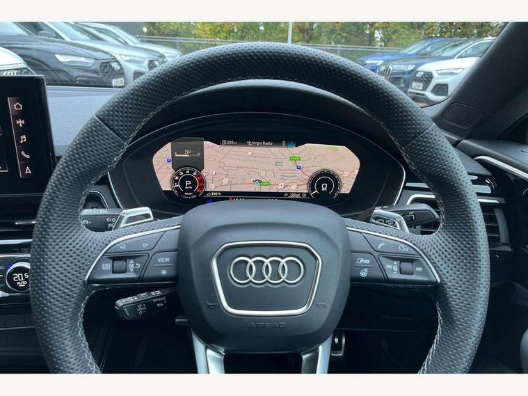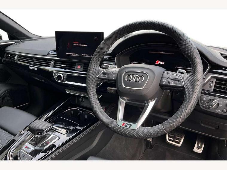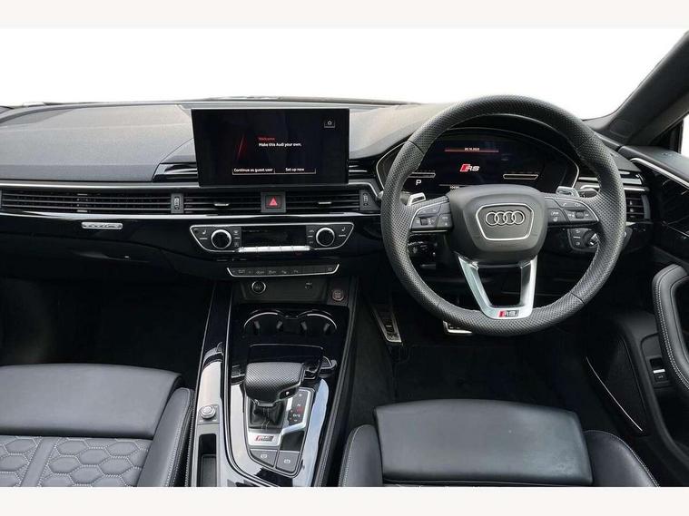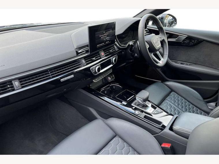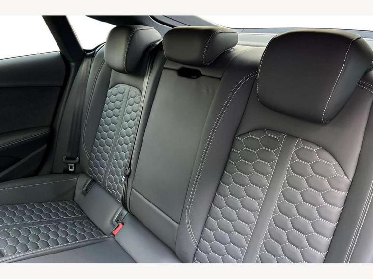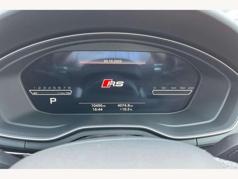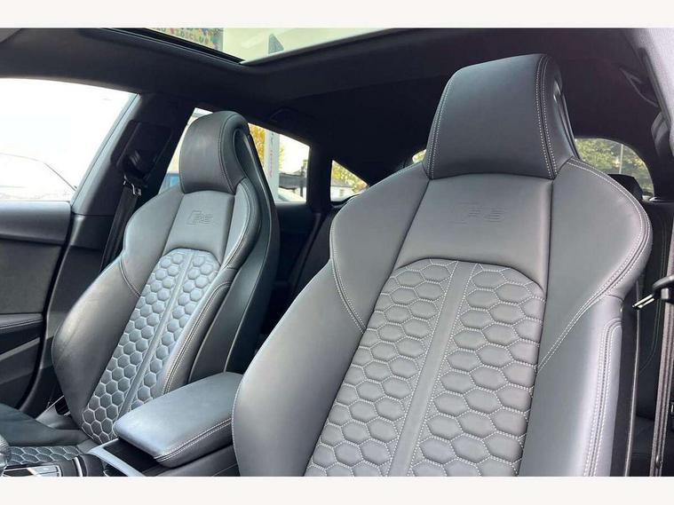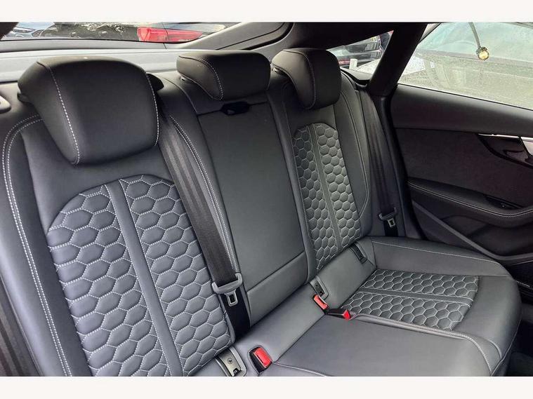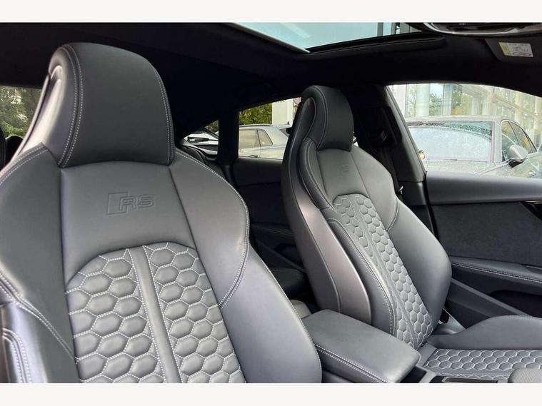 360 degree camera, Advanced key with electric hands free boot opening system, Audi connect safety and service (e-call), Audi side assist, Audi smartphone interface, Audi Virtual Cockpit with RS specific design and 12.3" display, Automatic start-stop system with coasting functionality and efficiency programme, Bluetooth interface, Camera based traffic sign recognition, Email, calendar and text messages displayed via MMI, Head up Display, Lane departure warning, MMI Navigation plus with MMI touch includes 10.1" high resolution colour MMI display, 3D map, Park assist with parking aid plus, Progressive steering, RS Audi drive select, RS drive modes on steering wheel, Service interval indicator, Voice control system, Increased top speed to 174mph, Quattro sports differential, RS sport suspension plus with dynamic ride control, 2 x USB charging port with aux input socket, Bang + Olufsen 3D sound system, DAB digital radio reception, Audi Beam uses LEDs to project the RS logo, Audi rings and lettering glossy black, Auto dimming rear view mirror, Body colour door handles, Electric front windows, Electric rear windows, Electrically folding, adjustable and heated door mirrors with integrated LED side indicators and kerb view function for passenger side, Exterior mirror housing in high gloss black, High beam assistant, Larger singleframe grill, LED 3rd brake light, LED daytime running lights, Matrix LED headlights with Audi laser light, dynamic light sequencing and dynamic indicator, Panoramic glass sunroof, Privacy glass with rear acoustic glazing, Rain and light sensors, Rear side wing doors, RS bumper with quattro lettering, RS sport exhaust system, RS5 badges on grille, the front wing panels and rear, RS5 dual branch chrome tailpipes with left and right oval pipes, Windscreen with acoustic glazing, 40:20:40 split folding 3 rear bench seat in 2nd row with rear centre armrest, Aluminium shift paddles, Black cloth headlining, Deluxe 3 zone electronic climate control, Electrically adjustable front seats, Front centre armrest, Front head restraints, Front knee pads in Leatherette, Front/rear floor mats, Heated front and outer rear seats, Illuminated door sill trims with RS5 logo, ISOFIX child seat mounting and top tether, Pneumatic massage function, Rear head restraints, RS Super Sports seats with contrast honeycomb stitching, Single front passenger seat, Stainless steel pedals, Black styling pack - RS5, Driver assistance tour pack - RS5, Extended LED Interior multi-coloured lighting pack - A5/RS5, 3x3 point rear seatbelts, 6 airbags - Driver, front passenger, curtain and side airbags, Attention and drowsiness assist, Child locks on rear doors, Electromechanical parking brake, Electronic Stabilisation Control (ESC) including ABS, ASR and EDL, Front passenger airbag deactivation, Height adjustable front seatbelts, Hill hold assist, Multi collision brake assist, Pop-up bonnet for pedestrian protection, Pre sense city, RS Model enhanced braking system, Seatbelt monitoring, Tyre pressure warning, Warning triangle and first aid kit, Anti theft alarm system, Anti theft wheel bolts, Immobiliser, Keyless Go, Remote control key with RS emblem, Piano black finish inlay, 20" 5 Segment spoke Evo style design audi sport alloy wheels in matt grey look high sheen finish, Tool kit, Tyre repair kit,