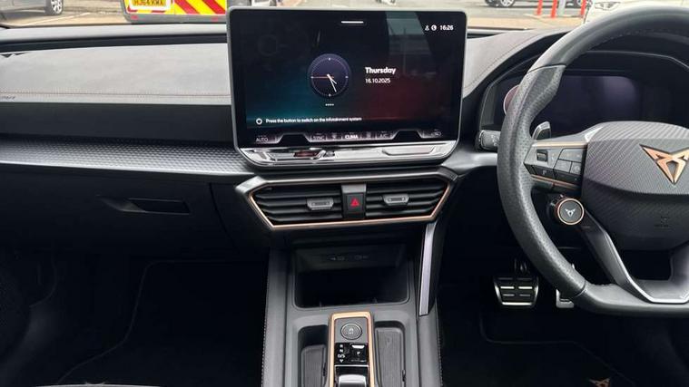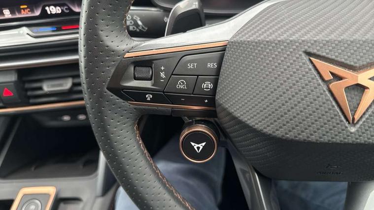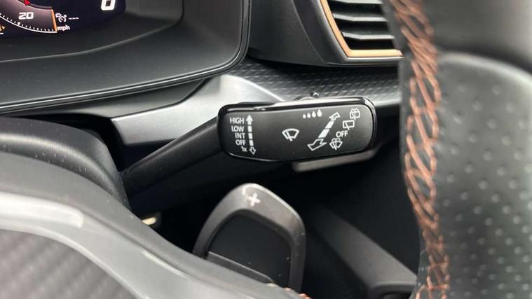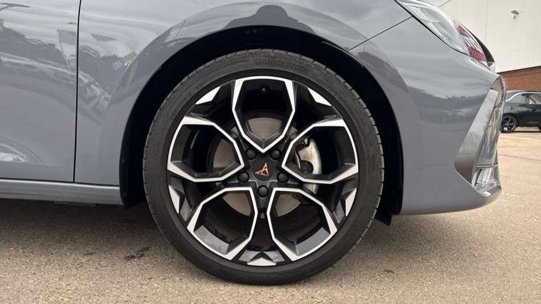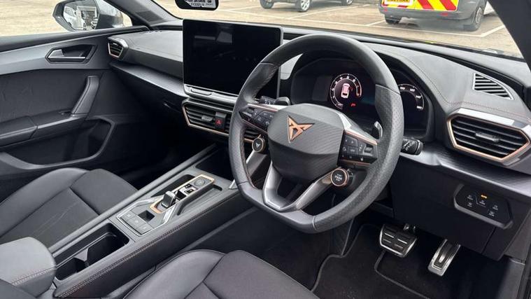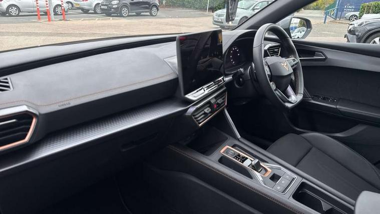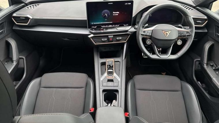 Adaptive cruise control with follow-to-stop and speed limiter, CUPRA drive profile selection with (Comfort/Sport/Individual), throttle response and gearshift mode, Digital cockpit, Dynamic road sign display, E-call, Four x USB Type C ports (2 in front and 2 in rear), Front and rear parking sensors, Front assist with forward collision warning braking reaction to vehicles, pedestrians and cyclists, Full link smartphone integration with Mirror Link, wireless Apple CarPlay and wired Google Android Auto, Lane assist, Lockable tailgate, PAS, RPM, trip computer, outside temp gauge, instrument light brightness, low fuel warning light, lights on reminder, gearshift indicator, Service interval indicator, Start/stop system with regenerative braking, Virtual pedal with electric tailgate, Wireless phone charger, 7 speakers, Auxiliary input socket, Auto dimming rear view mirror, Body colour door handles, Body coloured bumpers, Cupra sports bumpers, Dark tinted rear windows, Electric front/rear windows, Electrically adjustable, heated and folding door mirrors, Gloss black roof rails, High beam assist, LED front fog lamps with cornering function, LED headlights with dynamic turn signals, tail lights, rear fog lights with rear coast to coast lighting, LED rear fog lamp, Rain sensing wipers, Rear side wing doors, Rear wash/wipe, Separate daytime running light with automatic headlight control and coming home feature, Third brake light, Welcome light with logo projector in door mirrors, 12v power supply in centre console, 3 seat bench in 2nd row, 5 headrests, 60/40 split rear bench seat with armrest, Ambient lighting with glovebox, footwell and single monocolour, Black headlining, Cloth/PVC upholstery, Cupra sports pedals, CUPRA Supersports, heated steering wheel with satellite buttons, Driver and passenger seat with manual height and lumbar adjustment, Front and rear reading lights X 4, Front centre armrest, Height/reach adjust steering wheel, Illuminated interior front door sills, ISOFIX points in outer rear seats with top tether anchorage points, Single front passenger seat, Sliding boot cover, Storage pockets on rear of front seats, Sunvisors with illuminated mirror, Three zone climate control, Media system plus with 12.9" display + navigation pack - Leon Cupra, 3 point seatbelts on all rear seats, ABS, Brake control system - ESC and brake booster, Child proof door locks, Cupra black brake calipers, Driver and front passenger airbags with front passenger airbag de-activation, front side and curtain airbags, Electronic parking brake, Hill hold control, Rear disc brakes, Seat belt reminder for front and rear seats, Tiredness recognition system, Tyre pressure monitoring system, Anti theft alarm system with interior monitoring in cab, backup horn and towing protection, Central locking system Keyless Go, Locking wheel bolts, Chrome and copper interior detailing, 18" Windstorm machined sport black matt and silver alloy wheel with 92Y XL tyres, Tool kit,