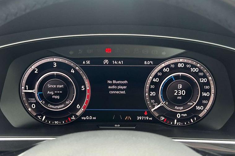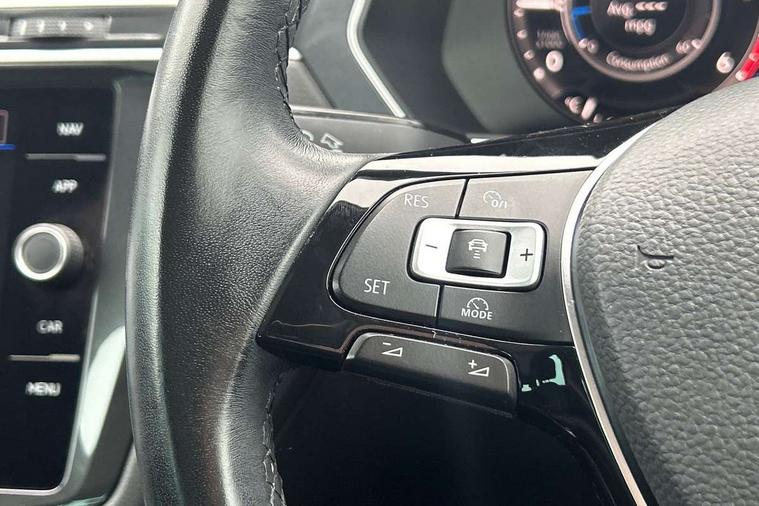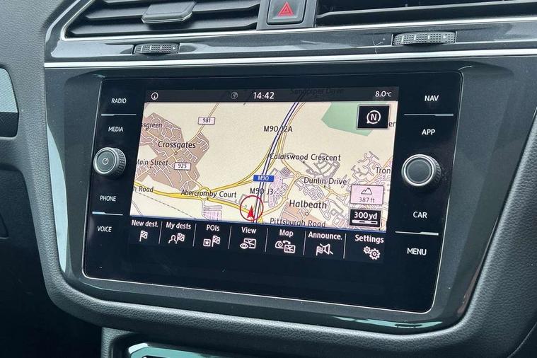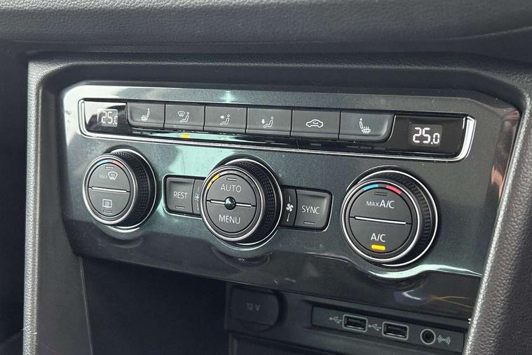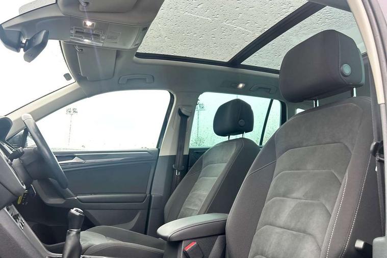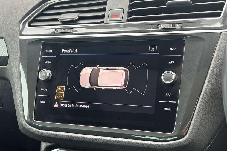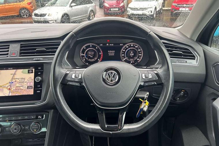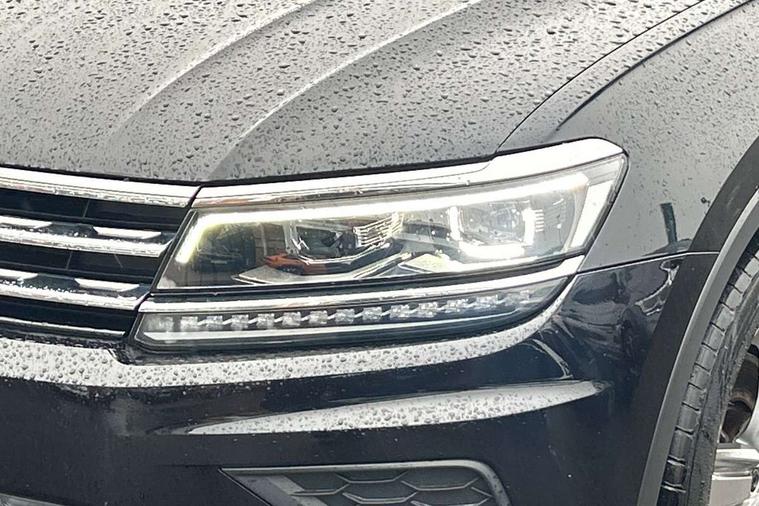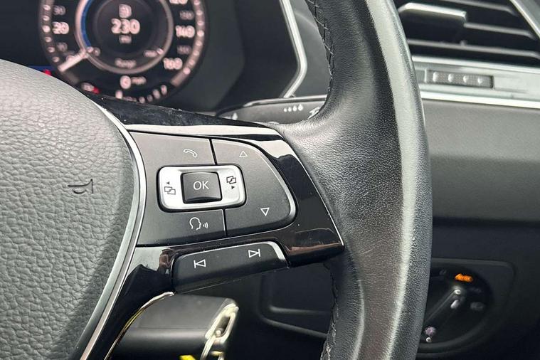 Active information display, Adaptive cruise control, App-Connect, Bluetooth phone integration system, Distance control assist, Fatigue detection system, Instrument cluster, Lane assist, Low washer fluid warning light, Outside temperature display, Service interval indicator, Speed limiter, Warning lights, Diesel particulate filter, XDS electronic differential lock, 2x USB sockets in front, Aux-in socket, DAB Digital radio, MP3 compatible single CD player, SD card slot, Auto dimming interior mirror, Automatic activation of hazard warning lights, Black door protector with chrome inserts, Body colour door handles, Body colour door mirrors, Body coloured bumpers, Chrome side body trim, Chrome side window surrounds, Chrome trimmed radiator grille, Coming/leaving home lighting function, Dusk sensor + auto driving lights, Electric folding door mirrors, Electric heated + adjustable door mirrors, Electric panoramic sunroof with sunblind, Front and rear electric windows, Heated rear window, LED headlights with dynamic light assist daytime running lights and cornering front fog lights, LED rear lights, Rain sensor windscreen wipers, Rear windscreen washer and wiper with interval delay, Silver rear diffuser trim, Silver roof rails, Silver under body guard, Tinted windows (B pillar backwards), Windscreen wipers/ intermittent wipe + 4 position delay, 12V Accessory socket in centre console, 3 rear headrests, 3 zone climate control, 4 load lashing points, 40:20:40 split folding rear seats, Bag hook in luggage compartment, Driver + front passenger lumbar support, Foldable passenger seatback, Front + rear carpet mats, Front centre armrest with 12v socket, Front centre armrest with storage + rear 2 air vents + cupholders, Front seatback folding tables, Height/reach adjust steering wheel, Illuminated driver/passenger vanity mirrors, Illuminated scuff plates, Interior light with delay, Isofix Preparation 2 Rear child seats, Leather gear knob, Load through provision with 2 cupholders when folded, Lockable cooled glovebox, Luggage compartment lighting, Luggage compartment side storage, Map pockets on front seats, Passenger seat height adjuster, Passenger underseat drawer, Rear cupholders, Removable luggage cover, Sliding/reclining rear seats, Storage compartment in driver's door, Storage compartment in passenger's door, Storage compartment in rear doors, Storage tray on dashboard, Sunglasses storage, Variable boot floor, Ambient lighting pack - Tiguan, 3 rear 3 point seatbelts, ABS+EBD+Brake assist, Active bonnet, Active pedestrian safety system, Curtain airbags, Driver/Front Passenger airbags, Driver/Passenger whiplash optimised head restraints, Drivers knee airbag, DTC - Drag torque control, Electronic parking brake with auto hold, ESP with EDL + ASR, First aid kit, Front assist including city emergency braking, Front side airbags, Head airbag system, Height adjustable front 3 point seatbelts + pretensioners, Hill hold control, Passenger airbag deactivate switch, Passenger knee airbag, Pre crash system, Rear side airbags, Seatbelt warning lamp and buzzer, Two tone horn, Warning triangle, Alarm with interior protection, Electronic engine immobiliser, Remote central locking with 2 remote folding keys, Chrome door trim inserts, Piano black interior trim, Steel space saver spare wheel,