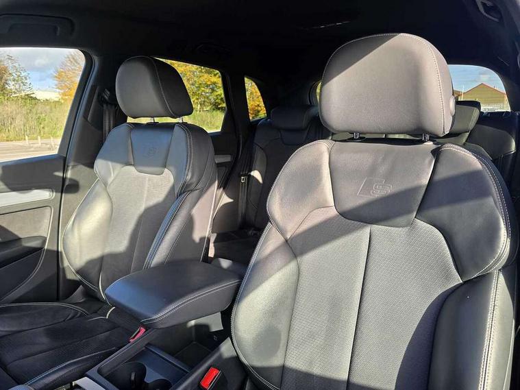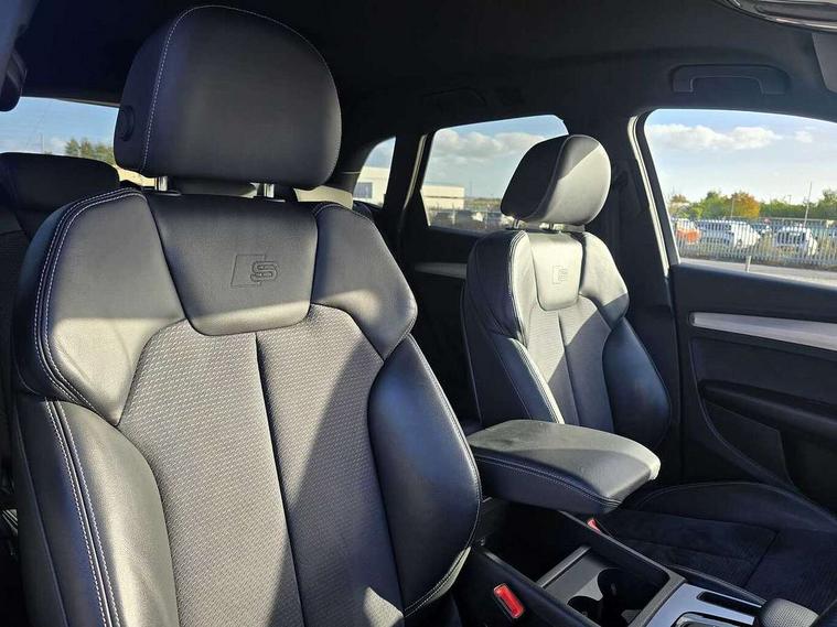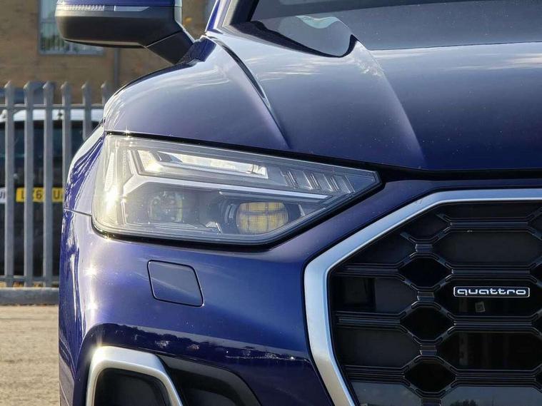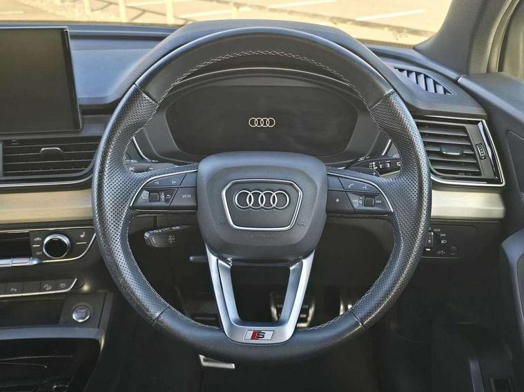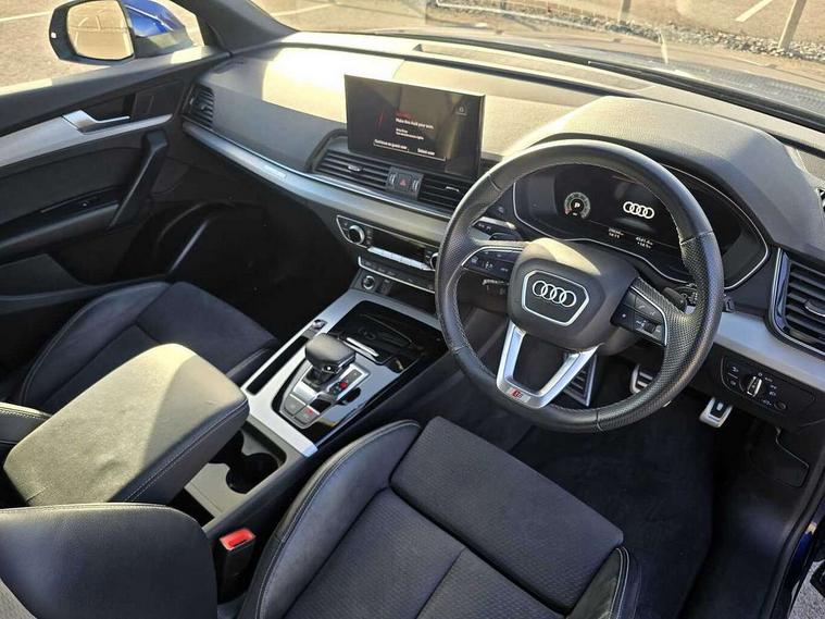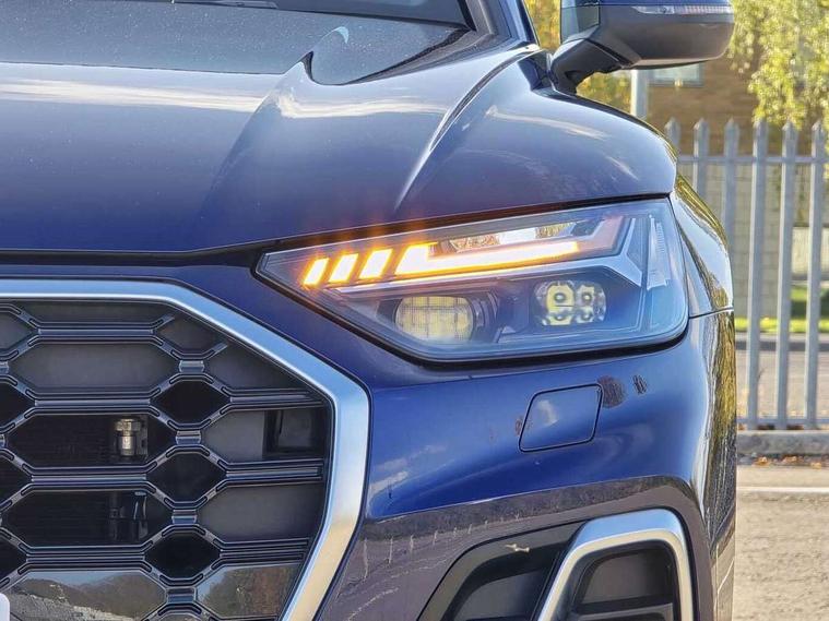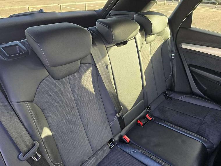 Acoustic front and rear parking sensor, Audi connect safety and service (e-call), Audi connect with Amazon Alexa Integration, Audi drive select, Audi virtual cockpit plus with 12.3" screen and three different layout designs, Audi wireless smartphone interface, Automatic start-stop system with coasting functionality and efficiency programme, Bluetooth interface, Electro - mechanical power assisted steering, MMI navigation plus with 10.1" touch screen, Power tailgate, Reversing camera, Service interval indicator, Voice control system with Audi hotword activation "Hey Audi", Diesel particulate filter, Quattro on demand, S line sports suspension, 2 x USB charging port with aux input socket, 8 loudspeakers, DAB Digital radio, Acoustic windscreen, Aluminium roof rails, Audi matrix LED headlights with dynamic front and rear indicators, Auto dimming door mirrors, Auto dimming frameless rear view mirror, Automatic headlight adjustment, Automatic headlights and windscreen wipers, Body colour bumpers, Body colour door mirrors, Body colour rear diffuser with matt aluminium silver surrounds, Body colour underbody protection, Chrome plated exhaust trims, Daytime running lights, Door sills in Selenite silver, Electric adjustable/heated/folding door mirrors, Front air inlet surrounds in aluminium, Front and rear electric windows, Front radiator grille in honeycomb design, Headlight washers, High level LED brake light, Lower bumpers painted in contrast Manhattan grey, Rear chrome trim strip below lights, Rear privacy glass and rear side windows, Rear side wing doors, Rear wiper, Roof bars, S Line badges on the front wings, S Line front and rear bumpers, S Line rear spoiler, S Line side skirts, 3 rear headrests, 3 spoke leather multifunction steering wheel with S badging perforated leather grips, 40:20:40 split folding 3 rear bench seat in 2nd row with rear centre armrest, Black cloth headlining, Comfort front centre armrest, Contrast stitching on seats, steering wheel and gear lever gaiter, Deluxe 3 zone electronic climate control, Front/rear floor mats, Gear lever in black leather, Heated front seats, Height adjustable front head restraints, Height/reach adjustable steering column, Illuminated door sill trims with S logo, Luggage compartment cover, Manual seat adjustment with 4-way electric lumbar support, Removable luggage compartment floor, Single front passenger seat, Stainless steel pedals, Sunvisors with vanity mirrors, High gloss pack - Q5, LED interior light pack - Q5, 3 point seatbelts on all seats, 6 airbags - Driver, front passenger, curtain and side airbags, Electrically operated child locks on rear doors, Electromechanical parking brake, Electronic stabilisation control including ABS, ASR and EDL, First aid kit with warning triangle and vests, Front passenger airbag deactivation, Hill descent control, Hill hold assist, ISOFIX child seat mounting for front passenger seat and ISOFIX child seat mounting with Top Tether for outer rear seats, Multi collision brake assist, Pop-up bonnet for pedestrian protection, Pre sense city, Seat belt force limiter, Seatbelt monitoring, Tyre pressure warning, Anti theft alarm, Anti-theft wheel bolts, Keyless Go access/ignition system, Remote central locking, Air vents inserts and centre console in gloss black, Matt brushed aluminium inlays,