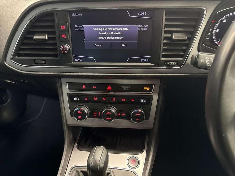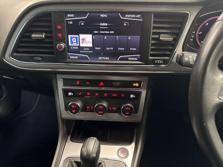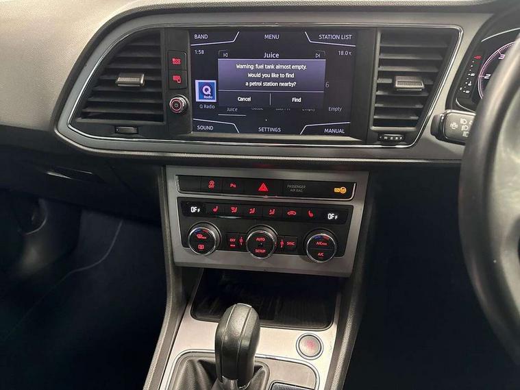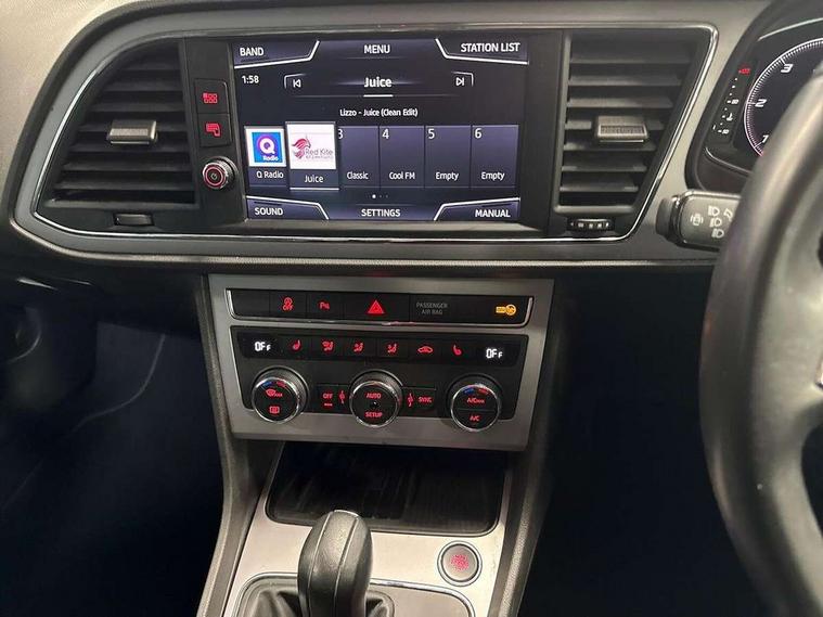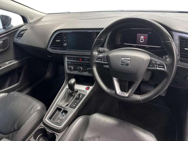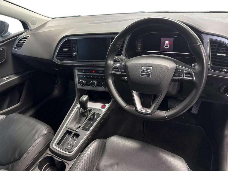 Digital cockpit, Electro-mechanical power steering, Front and rear parking sensors, Front assist with pedestrian protection, Full Link Smartphone Integration with Mirror Link, Apple Car Play, Google Android Auto with USB Type C cable for Apple and Android compatibility, Media system plus with 8" display, 4 USB, 8 speakers, CD, voice control, DAB, bluetooth and handsfree, steering wheel mounted audio and phone control, Navigation system 3D map display, high resolution colour driver display, two SD card slots, Rear view camera, RPM, trip computer, outside temp gauge, instrument light brightness, low fuel warning light, lights on reminder, gearshift indicator, SEAT logo boot release, Service interval indicator, Comfort suspension, XDS electronic differential lock, Auxiliary input socket, SEAT USB media cable, Body colour door handles, Body coloured bumpers, Body coloured exterior mirrors with integrated LED indicators, Chrome window trim, Dark tinted rear windows, Electric folding door mirrors, Electric front/rear windows, Electrically adjustable and heated door mirrors, Front grille frame in chrome, Front grille hot stamping, Full LED headlights with LED day time running lights + LED rear tail lights + LED licence plate lights and LED front and rear fog lights, High gloss black finish B and C pillars, Illuminated aluminium front door sill with XCELLENCE logo, Rear wash/wipe, Visible twin exhaust tailpipes, 12v power point in centre console, 60/40 split folding rear seat with armrest, Additional heating and ventilation outlet in rear of centre console, Boot storage net, Cargo rings in boot, Driver and passenger seat height adjust, Driver and passenger sun visor, covered and illuminated mirror, driver sun visor with card holder, Driver seat lumbar adjustment, Dual zone climate control, Dust/pollen filter, Front and rear head restraints, Front centre armrest with storage compartment, Front cupholders x 2, Front passenger seat lumbar adjustment, Front seatback storage pockets, Front sport seats in leather, Front/rear floor mats, Height adjustable front and rear headrests and third rear headrest, Height/reach adjust steering wheel, High centre console with integrated box & cup holder, rear air outlet, with armrest in front seats, ISOFIX points in outer rear seats with top tether anchorage points, Leather steering wheel with XCELLENCE logo and leather gear knob, Luggage tie-down hooks, Multi-colour ambient interior lighting, Storage box under drivers and passenger seat, Convenience pack+ - Leon, Driving assistance pack with adaptive cruise control - Leon, Safety pack - Leon, Winter pack - Leon, 3 point seatbelts on all rear seats, ABS, traction control system, electronic stability control, Child proof door locks, Driver and front passenger airbags with front passenger airbag de-activation, front side, curtain, driver knee airbags, EBA, Electric handbrake, Electronic parking brake with auto hold, Front seatbelt pretensioners, Front seatbelt reminder, Hill hold control, Multi-Collision braking, Tyre pressure monitoring system, 2 folding remote keys with window open/close function and boot opening/door mirror folding function, Central locking fuel filler cap, Engine immobiliser, Keyless entry and go with wireless phone charger, Locking wheel bolts, Remote central locking + deadlocks, Volumetric alarm with back up horn, Chrome interior detailing, 17" Dynamic machined atom grey alloy wheels 30/4,