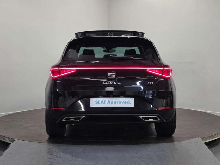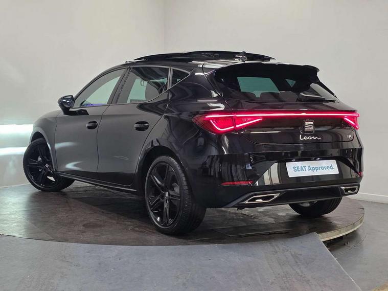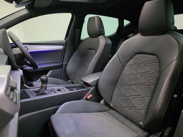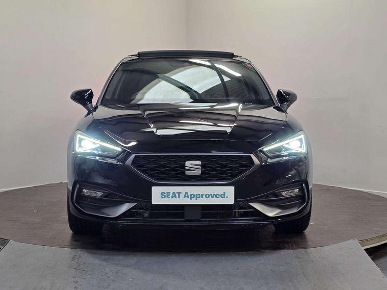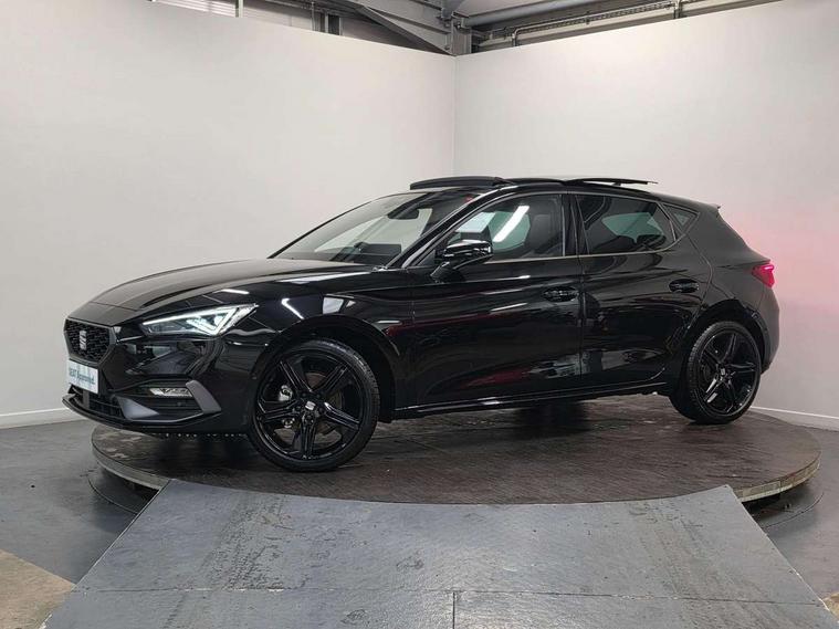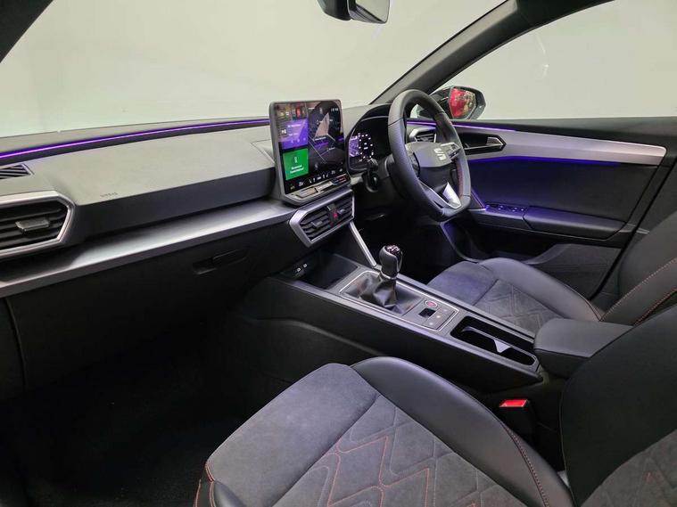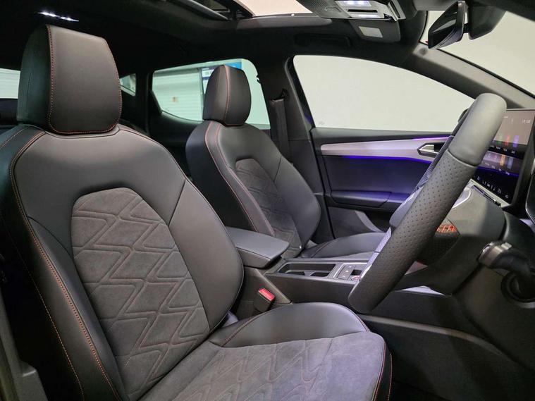 Digital cockpit with multifunction display, Driver attention alert with drowsiness warning, E-call, Front assist with forward collision warning braking reaction to vehicles, pedestrians and cyclists, Full link smartphone integration with Mirror Link, wireless Apple CarPlay and wired Google Android Auto, Intelligent speed assist, Lane assist, Lockable tailgate, Park assist (inc front/rear parking sensors), Power assisted speed sensitive electro-mechanical steering, Rear view camera, RPM, trip computer, outside temp gauge, instrument light brightness, low fuel warning light, lights on reminder, gearshift indicator, SEAT drive profile with 4 modes (Eco/Normal/Sport/Individual), throttle response, Service interval indicator, Start/stop system with regenerative braking, Sports suspension, XDS electronic differential lock and dynamic traction support, 2 front and 2 rear USB-C ports, 7 speakers, Auxiliary input socket, Auto dimming rear view mirror, Black door mirror housings, Black roof spoiler, Black side skirts, Body colour door handles, Body coloured bumpers, Dark tinted rear windows, Door mirror LED indicator lights, Dynamic headlight range control, Electric adjustable/heated/folding door mirrors with memory, Electric front/rear windows, FR sports bumper, Illuminated front door sill, LED front fog lamps, LED rear fog lamp, Matrix LED headlights and beams with variable light distribution, LED rear light and dynamic turn signals, Panoramic sunroof, Rear side wing doors, Rear wash/wipe, Separate daytime running light with automatic headlight control and coming home feature, Third brake light, Welcome light silhouette from exterior mirrors, Windshield wiper intermittent control with light/rain sensor, 12v power point in centre console, 3 seat bench in 2nd row, 60/40 split rear bench seat with armrest, Ambient lighting with glovebox, footwell and single monocolour, Black headlining, Dust/pollen filter, Electric driver lumbar support + passenger manual lumbar support, Folding boot cover, Front and rear height adjustable headrests, Front and rear reading lights X 4, Front centre armrest, Front seatback storage pockets, Heated front seats, Heated leather steering wheel with leather gearstick, Height/reach adjust steering wheel, Interior wraparound lighting (FR), ISOFIX points in outer rear seats with top tether anchorage points, Luggage tie-down hooks, Microsuede cloth upholstery, Power driver seat with memory and manual height adjustable passenger seat, Single front passenger seat, Sunvisors with covered illuminated mirror, Three zone climate control, Media system plus with navigation - Leon, 3 point seatbelts on all rear seats, ABS, Brake control system - ESC and brake booster, Child proof door locks, Driver and front passenger airbags with front passenger airbag de-activation, front side and curtain airbags, Electronic parking brake, Extended safety system - seat belt tensioner, window closure and hazard lights, Hill hold control, Rear disc brakes, Seat belt reminder for front and rear seats, Tyre pressure monitoring system, Anti theft alarm system with interior monitoring in cab, backup horn and towing protection, KESSY Advanced - Keyless start, keyless entry, Locking wheel bolts, Wireless phone charging, Chrome interior detailing, 18" Black alloy wheels, Tool kit,