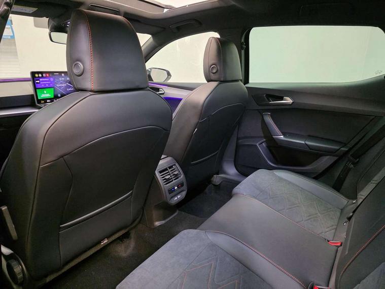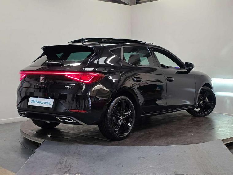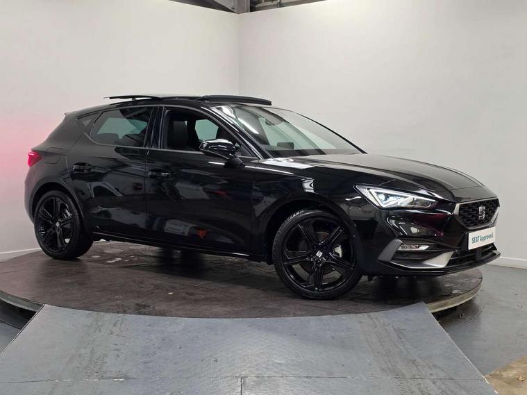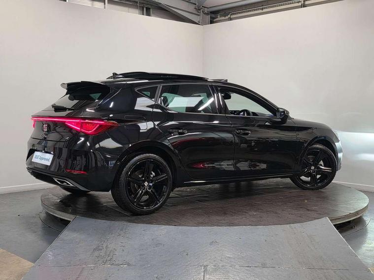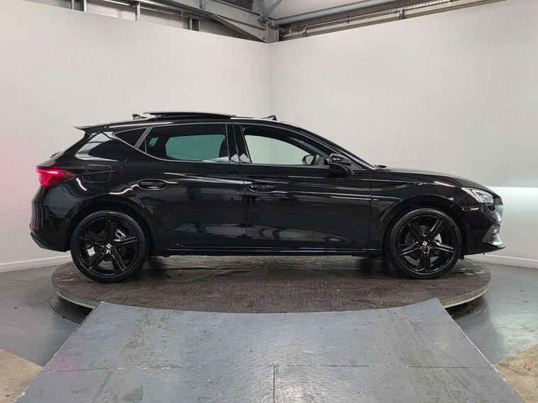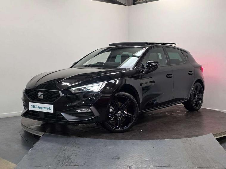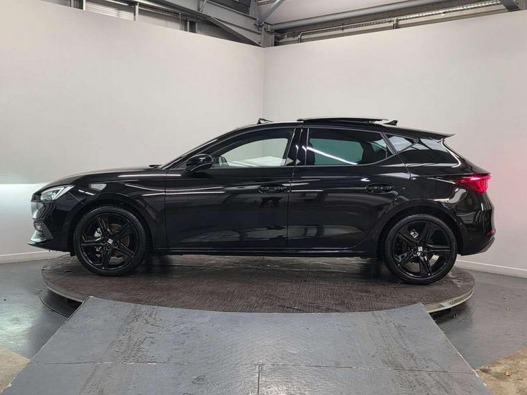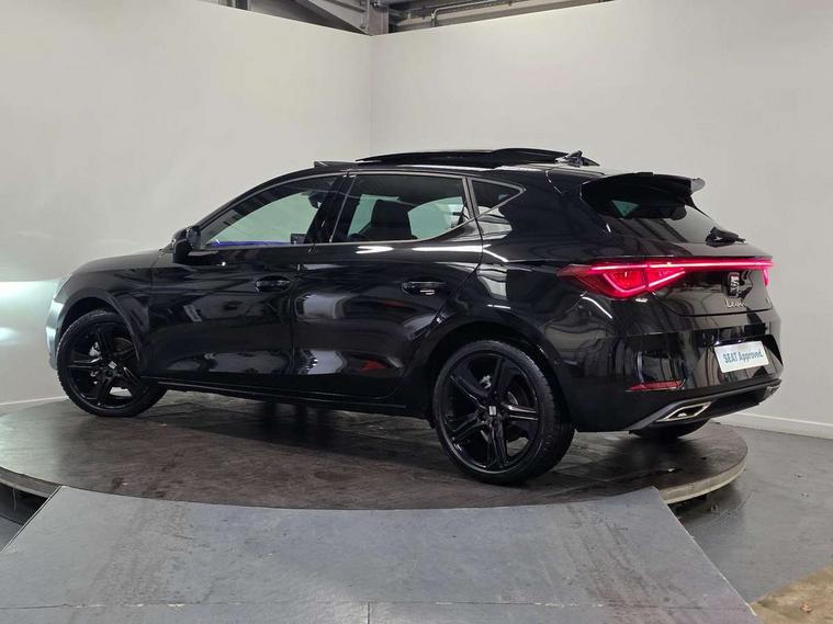 Digital cockpit with multifunction display, Driver attention alert with drowsiness warning, E-call, Front assist with forward collision warning braking reaction to vehicles, pedestrians and cyclists, Full link smartphone integration with Mirror Link, wireless Apple CarPlay and wired Google Android Auto, Intelligent speed assist, Lane assist, Lockable tailgate, Park assist (inc front/rear parking sensors), Power assisted speed sensitive electro-mechanical steering, Rear view camera, RPM, trip computer, outside temp gauge, instrument light brightness, low fuel warning light, lights on reminder, gearshift indicator, SEAT drive profile with 4 modes (Eco/Normal/Sport/Individual), throttle response, Service interval indicator, Start/stop system with regenerative braking, Sports suspension, XDS electronic differential lock and dynamic traction support, 2 front and 2 rear USB-C ports, 7 speakers, Auxiliary input socket, Auto dimming rear view mirror, Black door mirror housings, Black roof spoiler, Black side skirts, Body colour door handles, Body coloured bumpers, Dark tinted rear windows, Door mirror LED indicator lights, Dynamic headlight range control, Electric adjustable/heated/folding door mirrors with memory, Electric front/rear windows, FR sports bumper, Illuminated front door sill, LED front fog lamps, LED rear fog lamp, Matrix LED headlights and beams with variable light distribution, LED rear light and dynamic turn signals, Panoramic sunroof, Rear side wing doors, Rear wash/wipe, Separate daytime running light with automatic headlight control and coming home feature, Third brake light, Welcome light silhouette from exterior mirrors, Windshield wiper intermittent control with light/rain sensor, 12v power point in centre console, 3 seat bench in 2nd row, 60/40 split rear bench seat with armrest, Ambient lighting with glovebox, footwell and single monocolour, Black headlining, Dust/pollen filter, Electric driver lumbar support + passenger manual lumbar support, Folding boot cover, Front and rear height adjustable headrests, Front and rear reading lights X 4, Front centre armrest, Front seatback storage pockets, Heated front seats, Heated leather steering wheel with leather gearstick, Height/reach adjust steering wheel, Interior wraparound lighting (FR), ISOFIX points in outer rear seats with top tether anchorage points, Luggage tie-down hooks, Microsuede cloth upholstery, Power driver seat with memory and manual height adjustable passenger seat, Single front passenger seat, Sunvisors with covered illuminated mirror, Three zone climate control, Media system plus with navigation - Leon, 3 point seatbelts on all rear seats, ABS, Brake control system - ESC and brake booster, Child proof door locks, Driver and front passenger airbags with front passenger airbag de-activation, front side and curtain airbags, Electronic parking brake, Extended safety system - seat belt tensioner, window closure and hazard lights, Hill hold control, Rear disc brakes, Seat belt reminder for front and rear seats, Tyre pressure monitoring system, Anti theft alarm system with interior monitoring in cab, backup horn and towing protection, KESSY Advanced - Keyless start, keyless entry, Locking wheel bolts, Wireless phone charging, Chrome interior detailing, 18" Black alloy wheels, Tool kit,