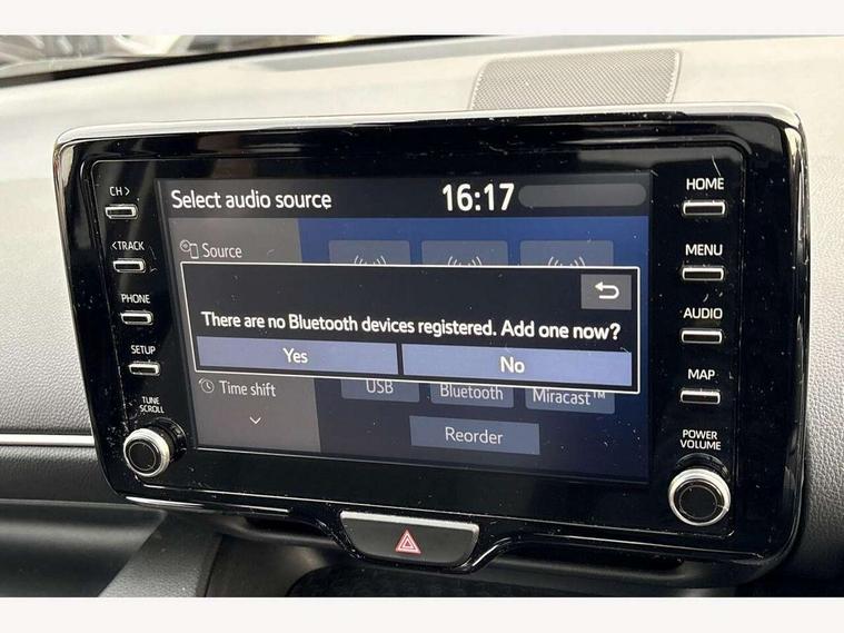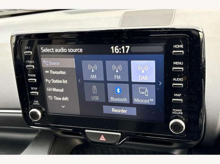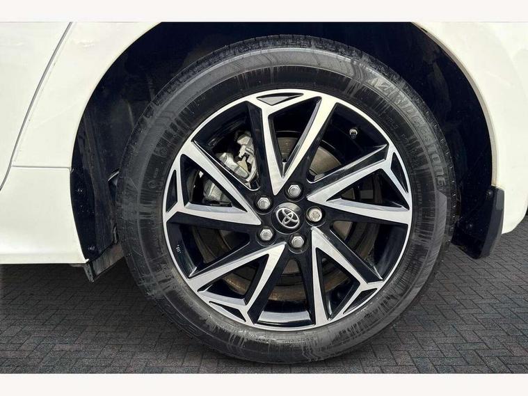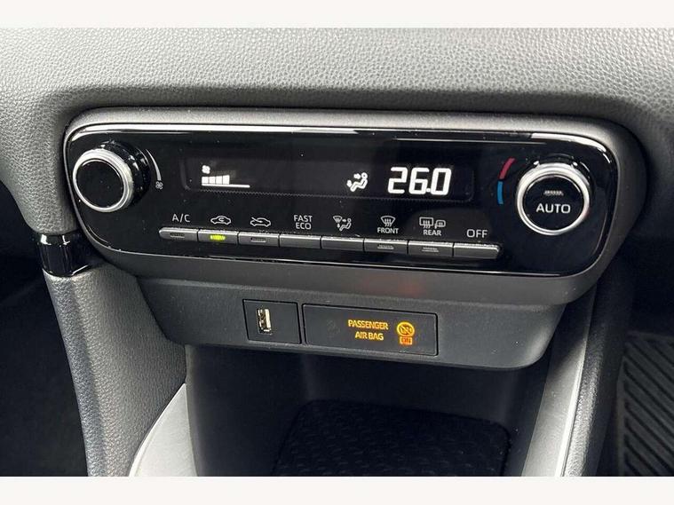 Adaptive cruise control, Adjustable speed limit with speed warning, Bluetooth connectivity, Colour binocular inspired displays with digital speedometer, E-call, Electric power steering, Hybrid energy display, Multi information display switches on steering wheel, Reversing camera, Smartphone integration with Apple CarPlay and Android auto, Tailgate, Voice recognition, Vehicle Stability Control (VSC), 4 speakers, 8" Multimedia display touch screen, USB connection, Acoustic windscreen glass, Auto windscreen wipers, Automatic headlights, Body coloured door mirrors, Electric adjustable heated door mirrors, Follow me home headlights, Front auto power windows with anti jam protection, Full LED rear lights, LED daytime running lights, LED front fog lights, LED front light guide, LED Headlights, LED High mounted stop lamp, LED Indicators, LED rear light guide, Manual headlight levelling, Painted chequered front grille, Rain sensor, Rear auto power windows with anti jam protection, Rear privacy glass, Rear side wing doors, Rear spoiler, Rear wiper, Shark fin antenna, Turning signal integrated indicators in door mirrors, Variable front intermittent wipers, 3 adjustable rear headrests, 3 spoke leather steering wheel, 60/40 split folding rear seat, Active headrests, Adjustable boot height, Auto air conditioning, Coat hooks in rear grab handles, Cup holders (2 front & door), Data Communication Module (DCM) connected services, Fabric upholstery, Front armrest, Glovebox, Grey roof lining, Height adjustable driver's seat, Isofix seat fixing, Leather gearshift, Pollen filter, Shopping bag hooks, Single front passenger seat, Tilt/telescopic steering column, 3 point seatbelts on all rear seats, ABS+EBD+Brake assist, Electronic parking brake, Emergency brake light system (EBS), Front passenger airbag on/off switch, Front seatbelt reminder, Hill start assist control (HAC), Rear child proof door locks, Rear seat belt reminder, Supplemental Restraint System (SRS) 8 airbags: Driver & passenger's airbags, dual side curtain airbags, side impact airbags, front centre airbag, Toyota Safety Sense 2, Precollison + Night time Pedestrian & Cyclist Detection, Lane Trace Assist, Auto High Beam, Intelligent ACC & Road Sign Assist, Tyre pressure warning system, 2x Master key, Alarm/immobiliser, Remote powered central double locking doors, Soft touch instrument panel, Space saver spare wheel,