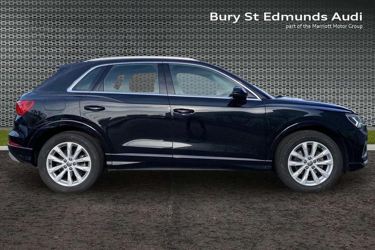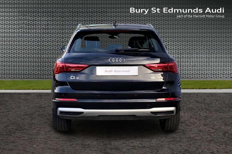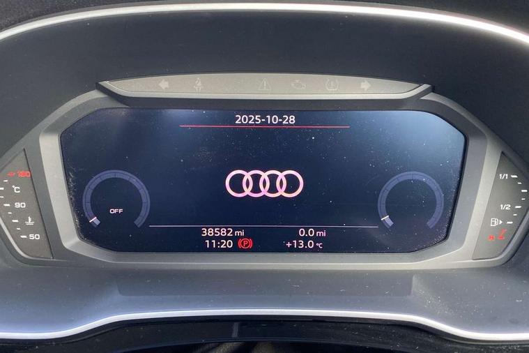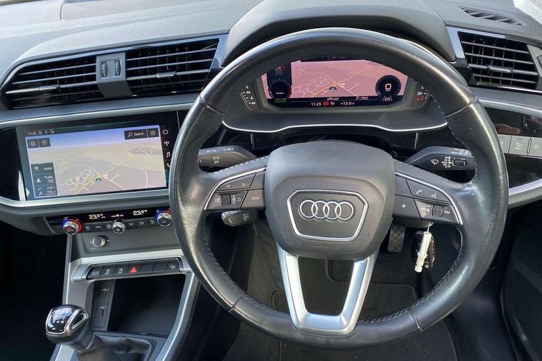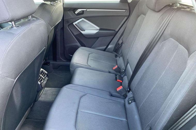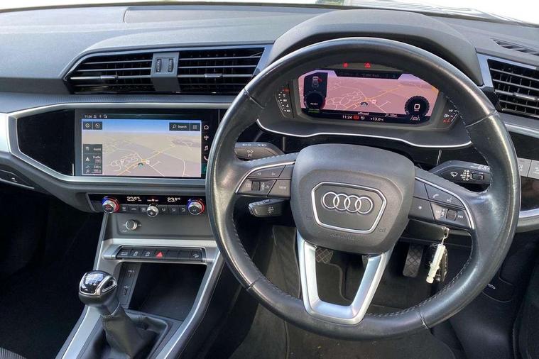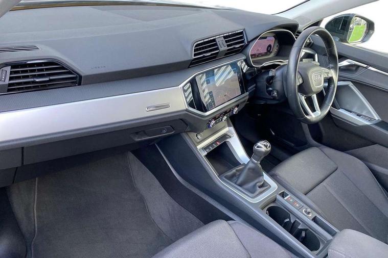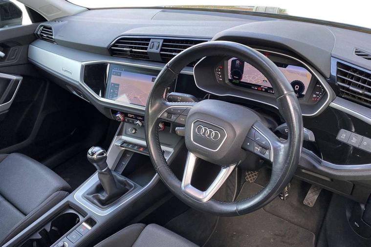 Audi connect safety and service (e-call), Audi drive select, Audi lane departure warning, Audi side assist, Audi smartphone interface, Audi Virtual Cockpit - 10.25" display, Bluetooth interface, Camera based traffic sign recognition, Cruise control + speed limiter, MMI Navigation Plus with high resolution 10.1 inch touchscreen colour display, Power operated tailgate, Progressive steering, Rear parking sensors, Service interval indicator, Start stop system with recuperation, Voice control system with natural language interaction, Sports suspension, 1 x USB type C and 1 USB type A charging points, 6 passive loudspeakers, DAB digital radio module, Acoustic windscreen, Aluminium window trim, Auto dimming frameless rear view mirror, Bumpers and underbody protection in contrasting manhattan grey paint finish, Diffuser grille in grained matt black, Diffuser trim in manhattan grey metallic, Door sill trims with illuminated aluminium inlay, Electrically folding, adjustable and heated door mirrors with integrated LED side indicators and kerb view function for passenger side, Front and rear electric windows, Front fog lights, Front side air inlets in Manhattan grey metallic, Grille surround in aluminium silver matt, High gloss black finish B and C pillars, Honeycomb design radiator grille in matt titanium black, LED headlights with LED daytime running lights and dynamic rear indicator, LED rear lights, Rain and light sensors, 12V socket in rear centre console, 40:20:40 folding with manual adjustment for 60:40 forwards/backwards position and backrest angle, Adjustable rear seat bench/backrest, Dual zone climate control, Front and rear floor mats, Front and rear headrests, Front and rear roof module including reading lights, Front centre armrest, Glove compartment lighting, ISOFIX child seat mounting and Top Tether with front passenger airbag deactivation, Luggage compartment light, Lunar silver cloth headlining, Manual front seats with height adjustment, Stainless steel luggage compartment sill finisher, Non smoking pack - Q3, 3x3 point rear seatbelts, 6 airbags - Driver, front passenger, curtain and side windows, Audi pre-sense front with pedestrain and cyclist recognition, Electrically operated child locks on rear doors, Electromechanical parking brake, Electronic stabilisation control including ABS, ASR and EDL, Hill descent control, Hill hold assist, Pre sense basic, Seatbelt monitoring, Tyre pressure warning, Warning triangle and first aid kit, Anti theft alarm, Anti theft wheel bolts, Remote central locking, Detail dashboard around MMI touch colour display in glass look, black with surround in aluminium look,