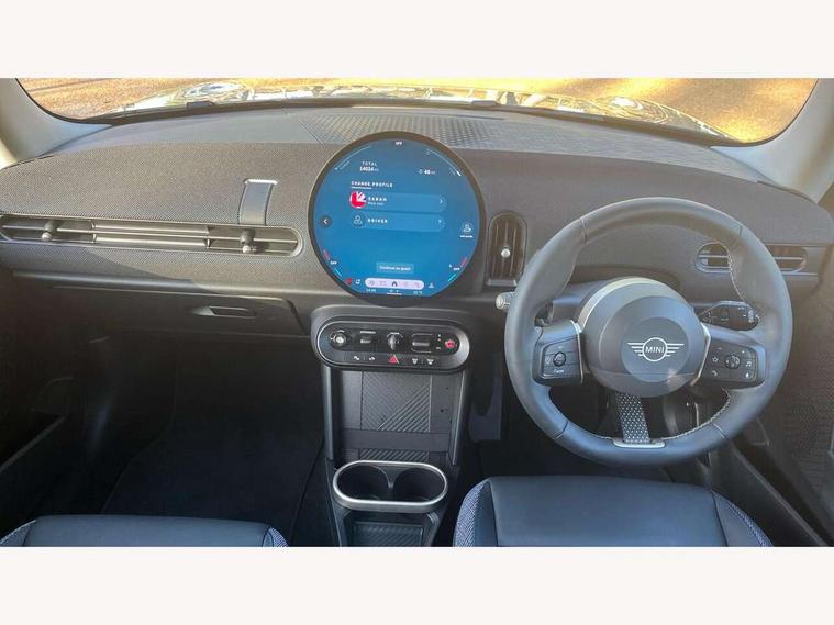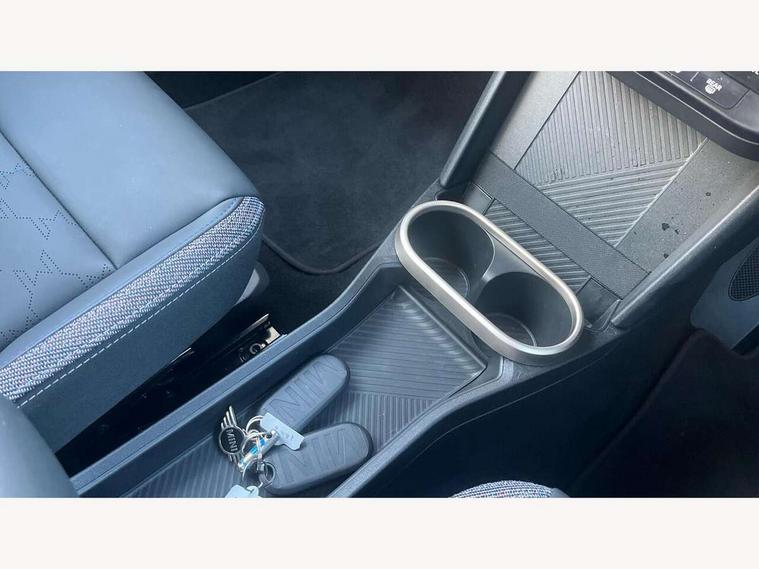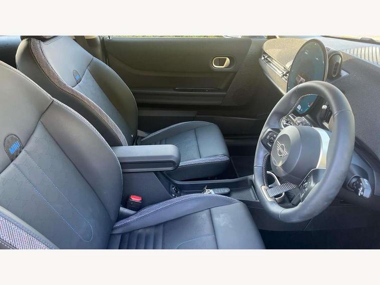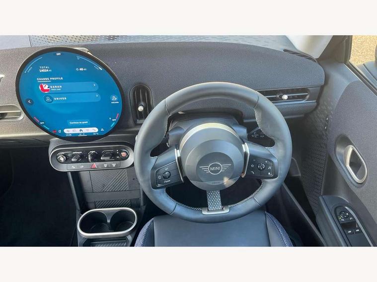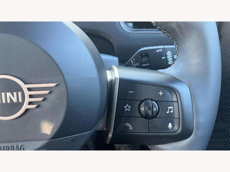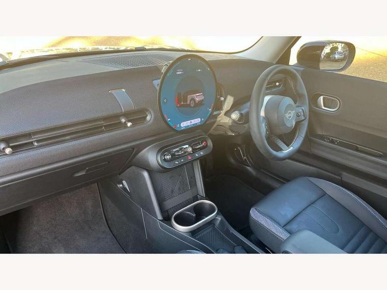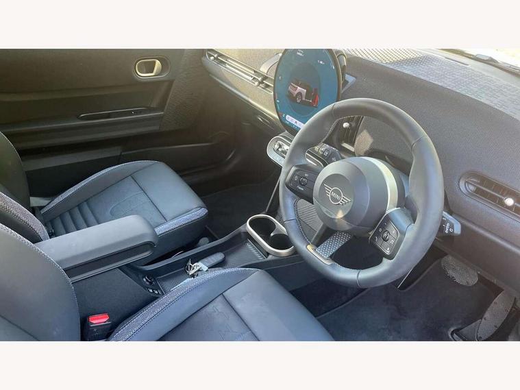 Central toggle bar, Circular OLED Screen, Compatible mobile phone bluetooth with audio streaming, Cruise control, Digital instrument cluster, Electro-mechanical speed dependant steering assistance, Emergency call service, MINI Experience Modes, Mini navigation system, On board computer, Service interval indicator, Tailgate, 7 speed steptronic transmission with double clutch, DAB Digital radio, Personal eSim, Auto headlights, Black grille surround, Electric adjustable heated door mirrors, Electric front windows, Heated rear window, Heated windscreen washer jets, LED 3rd brake light, LED daytime running lights, LED Headlights, LED indicator lights, LED rear lights, Rain sensor window wipers, Rear fog lights, Rear window wiper, 2 seat bench in second row, 2 zone automatic air conditioning, 60/40 rear seat bench, Ambient lighting, Cupholders, Floor mats, Front and rear head restraints, Front compact armrest, Heated steering wheel, Height adjustable passenger seat, Light headliner, Luggage compartment lighting, Single front passenger seat, Sport Vescin Steering Wheel black with vibrant silver accents, Sunvisors with vanity mirrors, Vescin/Cloth upholstery, Driving assistant pack - Cooper Hatchback, Park assistant pack - Cooper Hatchback, 3 point seatbelts on all four seats, 6 Airbags - front, side, head and seat belt tensioners, Acoustic pedestrian protection, Anti-lock braking system (ABS), DSC - Dynamic Stability Control, Electronic parking brake, Front and rear disc brakes, Front ISOFIX (iSize), Front passenger airbag deactivation, Traction control, Tyre pressure monitoring system, Alarm, Immobiliser, Remote central locking, Black/Blue dashboard knit, Tyre repair kit,