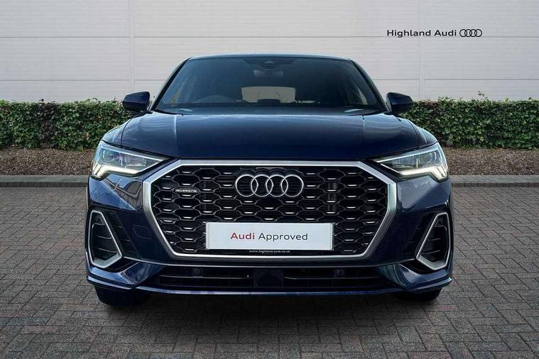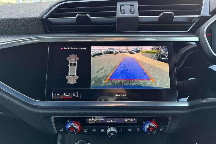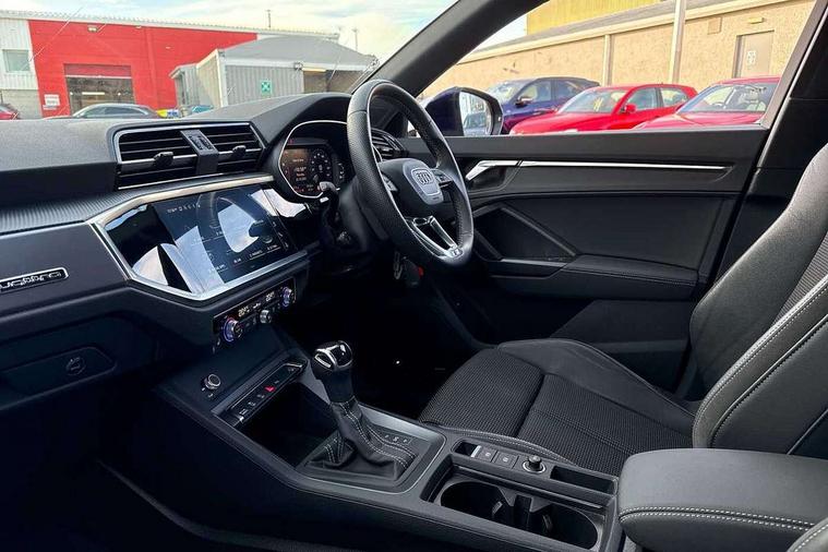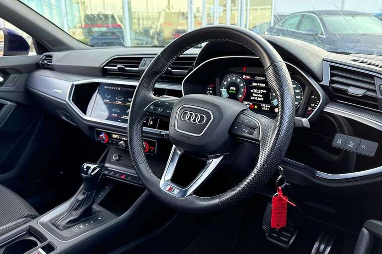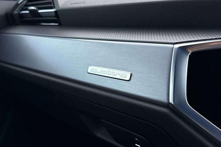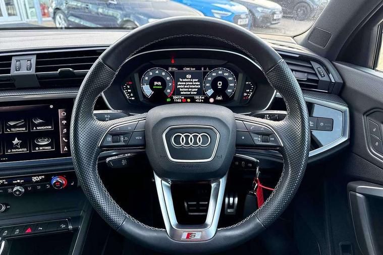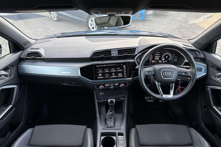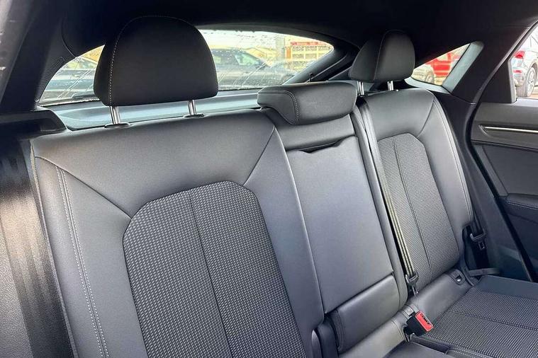 Audi connect safety and service (e-call), Audi drive select, Audi lane departure warning, Audi Virtual Cockpit - 10.25" display, Bluetooth interface, Camera based traffic sign recognition, MMI Navigation Plus with high resolution 10.1 inch touchscreen colour display, Power operated tailgate, Progressive steering, Service interval indicator, Smartphone interface includes wireless Apple carplay/Android Auto, Start stop system with recuperation, Voice control system with natural language interaction, Sports suspension, 2 USB-C ports with charge and data functions, 6 passive loudspeakers, DAB digital radio module, Acoustic windscreen, Aluminium window trim, Auto dimming frameless rear view mirror, Diffuser grille in grained matt black, Diffuser trim in selenite silver, Electrically folding, adjustable and heated door mirrors with integrated LED side indicators and kerb view function for passenger side, Front and rear electric windows, Front fog lights, Front side air inlets in selenite silver, Front underbody protection in manhattan grey paint finish, Grille surround in aluminium silver matt, High gloss black finish B and C pillars, LED headlights with LED daytime running lights, LED rear lights, LED third brake light, Privacy glass dark tinted rear and rear-side windows (from B-pillar backwards), Radiator grille in titanium black with inlay in matt aluminium silver, Rain and light sensors, Rear side wing doors, Rear underbody protection in matt black, Rear wiper, S line badges on front wings, Side skirt insert in matt Platinium grey, Variable front intermittent wipers, 12V socket in rear centre console, 3 seat bench in 2nd row, 40:20:40 folding with manual adjustment for 60:40 forwards/backwards position and backrest angle, Adjustable rear seat bench/backrest with centre armrest and cupholder, Black cloth headlining, Dual zone electronic climate control, Front and rear black floor mats with contrast stitching, Front and rear headrests, Front and rear roof module including reading lights, Front centre armrest, Glove compartment lighting, Height and reach adjustable steering wheel, Illuminated door sill trims with S logo, ISOFIX child seat mounting for front passenger with airbag deactivation and outer rear seat including top tether attachment point for outer rear seats, Luggage compartment light right in white, Luggage compartment sill protection in stainless steel, Manual front seats with height adjustment, Perforated leather gearknob, Single front passenger seat, Stainless steel pedals, Non smoking pack - Q3, 3x3 point rear seatbelts, 6 airbags - Driver, front passenger, curtain and side windows, Audi pre-sense front with pedestrain and cyclist recognition, Electromechanical parking brake, Electronic stabilisation control including ABS, ASR and EDL, Front seatbelt reminder, Hill descent control, Hill hold assist, Manual child lock in rear doors, Pre sense basic, Seatbelt monitoring, Tyre pressure warning, Warning triangle and first aid kit, Anti theft alarm, Anti theft wheel bolts, Immobiliser, Remote central locking, Black dashboard, Dark matt brushed aluminium inlay, Detail dashboard around MMI touch colour display in glass look, black with surround in aluminium look, Leatherette door armrest,