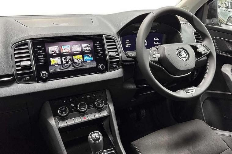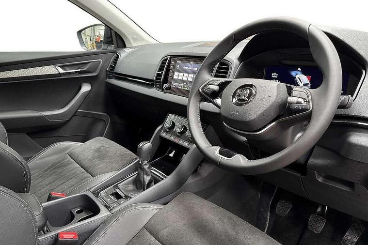 8" Digital display, Advanced driver attention and drowsiness monitor, Drive Mode Selection including ECO function, Electro-mechanical PAS, Emergency services call system, Outside temperature gauge, Sensor for driver assistance systems, Service interval indicator, SmartLink wireless for Apple and wired for Android, Start/stop system with regenerative braking, USB C Port x 2 in front centre console, Virtual Cockpit - 10.25" digital display, Wireless smartphone charging, DAB radio with Bluetooth, USB connection, Acoustic glass, Aero front windscreen wipers with intermittent function, Auto dimming rear view mirror with light and rain sensors, Black electric window control buttons, Body colour door mirrors and handles, Electric front and rear windows with child proof lock, Heated rear windscreen, LED daytime running lights, LED rear lights with high functionality welcome effect and dynamic indicators, Light assistant (coming/leaving home/tunnel light), Plastic scuff plates in door apertures, Privacy glass, Rear side wing doors, Rear spoiler, Rear window wiper with washer system and intermittent control, Safety reflectors on front doors, Third brake light, 1.5 litre bottle holders in driver and front passenger door panels, 12V socket in boot, 12v socket in front centre armrest with storage compartment and rear air vents, 2 spoke leather heated multifunction steering wheel, 2 x Tablet holder, 3 rear height adjustable headrests, 3 seat bench in 2nd row, 4 foldable roof handles with rear coat hooks, Black floor carpet, Chrome inner door handles, Foldable hooks in the boot, Front head restraints, Height adjustable front three point seats belts with tensioners, Height/reach adjust steering wheel, Ice scraper, Illuminated glovebox, Illuminated luggage compartment, Interior noise suppression, Isofix child seat preparation for front passenger seat, Isofix child seat preparation outer rear, Manual lumbar support for front seats, Pearl grey interior ceiling, Pen holder, Pollen filter, Rear boot cover, Rear reading lights, Rubbish bin door, Safety vest holder, Single front passenger seat, Storage box in upper central dashboard closed, Sunvisors with illuminated vanity mirrors, Textile floor mats, Ticket holder, Design Pack - Karoq, Non Smokers pack, Parking pack - Karoq, Automatic door unlocking in case of crash, Automatic fuel cut off in case of crash, Driver airbag, Electronic parking brake with auto hold function, Emergency rear braking signal, ESC (incl. ABS+MSR+ASR+EDS+HBA+DSR+RBS+MKB), Front side airbags, Head airbags, Hill hold control, Knee airbags, Passenger airbag with switch-off function, Pedestrian monitor, Seatbelt reminder signalisation and pretensioner for all seats, Three point seatbelts rear, Two tone horn, Tyre pressure monitor, Alarm with interior monitoring, back up horn and tilt sensor with safe function, Electronic engine immobiliser, Keyless entry and start/stop, Remote central locking with 2 remote folding keys, Black centre console, Chrome framed air vents, Satin black dashboard, Anti-theft wheel bolts protection, Breakdown and tool kit,