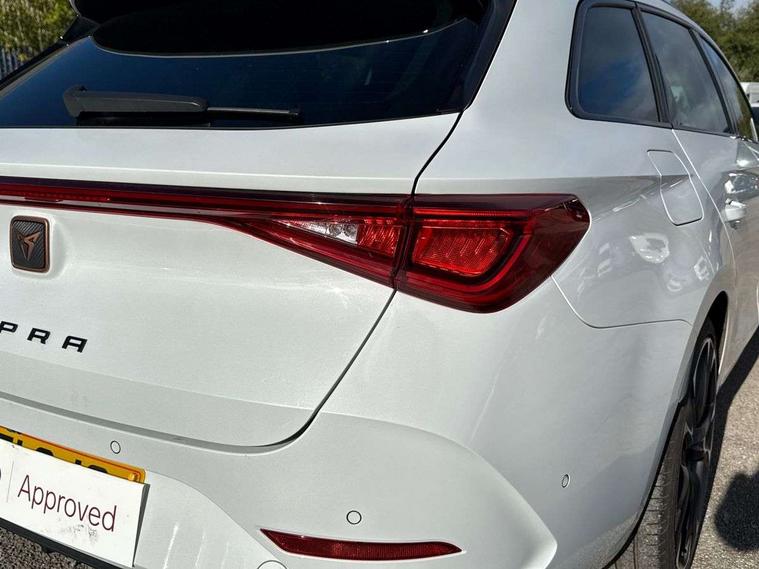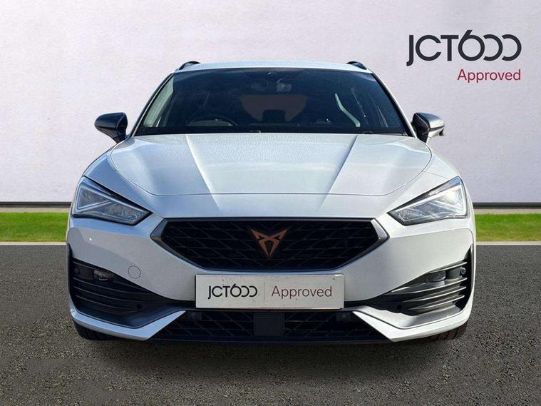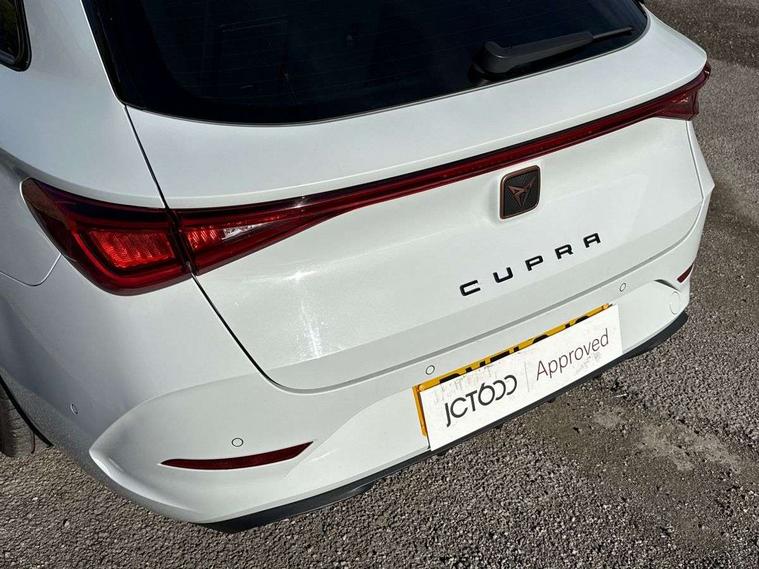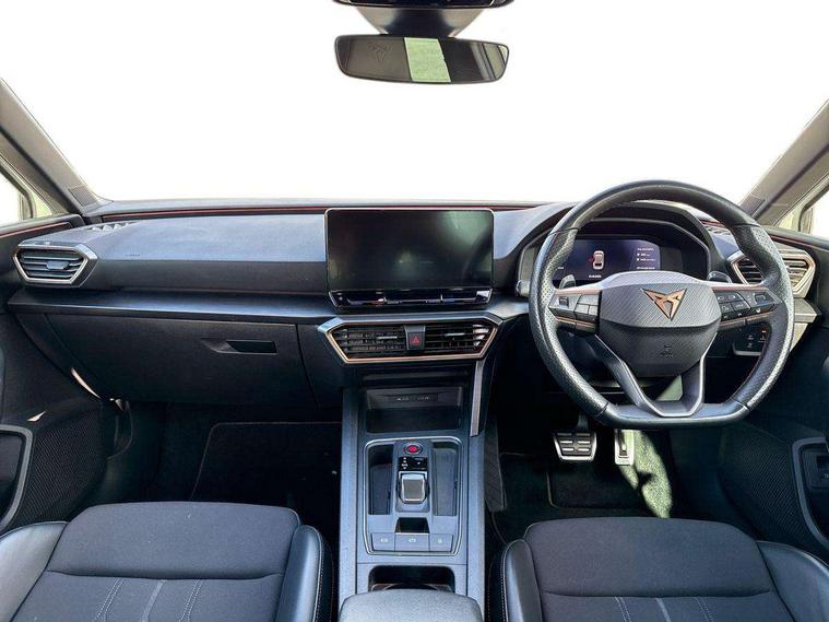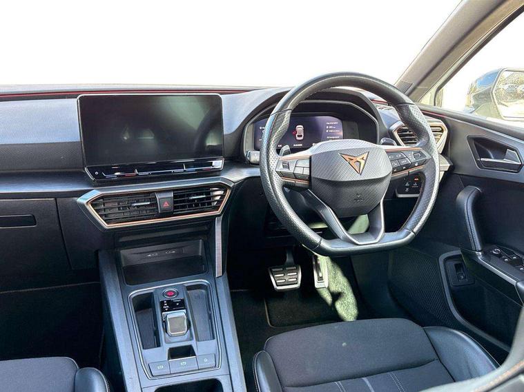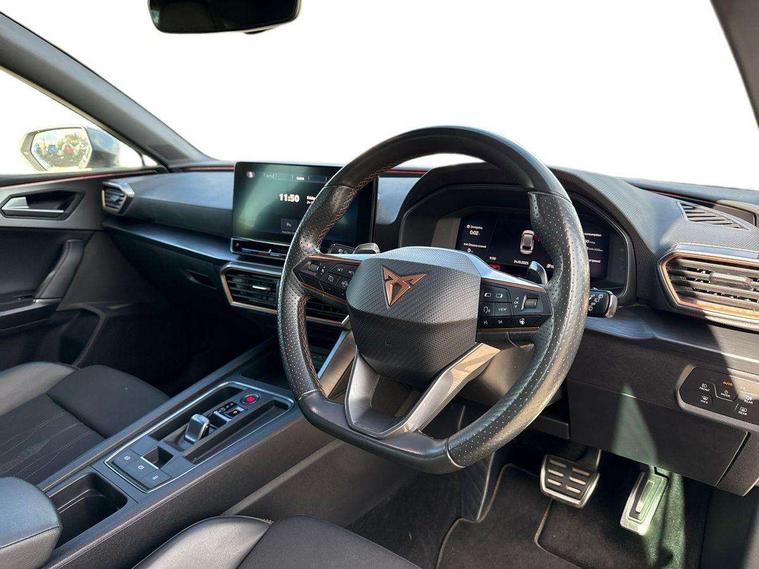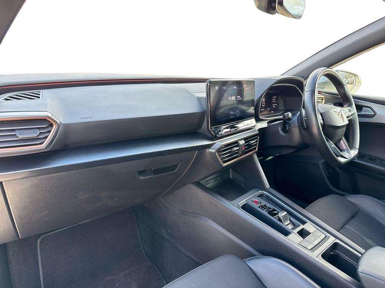 CUPRA drive profile selection with 4 modes (Comfort/Cupra/Sport/Individual), throttle response and gearshift mode, Digital cockpit, Four x USB Type C ports, Front assist with forward collision warning braking reaction to vehicles, pedestrians and cyclists, Full link smartphone integration with Mirror Link, wireless Apple CarPlay and wired Google Android Auto, Lane assist, Lockable tailgate, Park assist (inc front/rear parking sensors), Rear view camera, RPM, trip computer, outside temp gauge, instrument light brightness, low fuel warning light, lights on reminder, gearshift indicator, Service interval indicator, Start/stop system with regenerative braking, 10 amp mode 2 charging cable, 3.6 kw On-board charger, Mode 3 charging cable, Standard suspension, XDS electronic differential lock and dynamic traction support, 7 speakers, Auxiliary input socket, Auto dimming rear view mirror, Body colour door handles, Body coloured bumpers, Cupra sports bumpers, Dark tinted rear windows, Electric front/rear windows, Electrically adjustable, heated and folding door mirrors, Gloss black roof rails, LED front fog lamps with cornering function, LED headlights and tail lights with dynamic turn signals, welcome light silhouette from exterior mirrors and dynamic headlight range control, LED rear fog lamp, Rain sensing wipers, Rear coast to coast lighting, Rear diffuser with twin exhaust pipe on each side with simulated exhausts, Rear wash/wipe, Separate daytime running light with automatic headlight control and coming home feature, 12v power supply in centre console, 12v socket in loadspace, 5 headrests, 60/40 split rear bench seat with armrest, Ambient lighting (glovebox, footwell, ambient lighting multicoloured), Black headlining, CUPRA Leather flat bottomed, heated, perforated steering and gearshift paddles, Cupra sports pedals, Driver/passenger manual seat height adjustment, Dust/pollen filter, Front and rear reading lights X 4, Front centre armrest, Front seats manual lumbar adjustment, Height/reach adjust steering wheel, Illuminated interior front door sills, Interior wraparound lighting, ISOFIX points in outer rear seats with top tether anchorage points, Luggage tie-down hooks, PVC/Cloth upholstery with copper stitching + Cupra embossed logo on headrest, Sliding boot cover, Sports bucket seats, Storage pockets on rear of front seats, Sunvisors with illuminated mirror, Three zone climate control, Tool kit, Dynamic and comfort pack - Leon Cupra, Media system plus with navigation pack - Leon Cupra, 3 point seatbelts on all rear seats, ABS, Brake control system - ESC and brake booster, Child proof door locks, Cupra black brake calipers, Driver and front passenger airbags with front passenger airbag de-activation, front side and curtain airbags, Electronic parking brake, Extended safety system - seat belt tensioner, window closure and hazard lights, Hill hold control, Rear disc brakes, Seat belt reminder for front and rear seats, Tiredness recognition system, Tyre pressure monitoring system, Anti theft alarm system with interior monitoring in cab, backup horn and towing protection, KESSY Advanced - Keyless start, keyless entry, Locking wheel bolts, Chrome and copper interior detailing, 19" Machined black and silver alloy wheels with 91Y tyres, Breakdown kit,