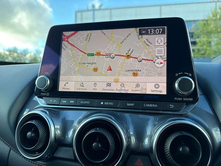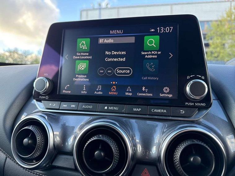 7" full colour TFT screen combimeter, 8" infotainment colour display with touch screen, Apple CarPlay and Google Android auto, Drive modes select (Eco, normal and sport), Emergency and breakdown call, Front parking sensor, Idle start/stop system, Intelligent lane intervention, Lane departure warning system, Nissan connect nav with TomTom traffic, Nissan connect services and Wifi connection, Outside temperature sensor, Power Steering, Rear parking sensor, Traffic sign recognition, Trip computer, Gasoline particulate filter, Bluetooth system, USB, Aux-in and 12V socket, Bose personal plus audio system with 8 speakers(4 speakers and 2 headrest speaker for driver and passenger seats), Bose personal sound stage control, DAB Digital radio, Rear console USB port, Auto dimming interior rear view mirror, Automatic hazard signal with emergency stop signal, Body colour bumpers, Body colour door handles, Electrically adjustable door mirrors with integrated indicators, Follow me home headlights, Front and rear electric window with one touch driver window, Heated and auto folding door mirrors, High beam assist, LED daytime running lights, LED front fog lights, LED headlamps, LED rear fog lamp, LED rear lamps, Rain sensor windscreen wipers, Rear privacy glass, Rear wiper, Thermaclear heated windscreen, Three blink turn signal, 3 height adjustable rear headrests, 60/40 split folding rear seat, Automatic climate control, Card holder on driver sunvisor, Cloth/Synthetic leather upholstery, Door ambient lighting, Driver and passenger sliding and reclining seats, Driver seat back pocket, Driver side rear coat hanger, Driver/passenger sunvisors and vanity mirrors, Front and rear cabin lighting, Front armrest, Front door pockets with bottle holders, Front head restraints, Front passenger isofix child seat anchorage point, Front/rear passenger grab handles, Gear console ambient circle lighting, Grey synthetic leather kneepad, Heated front seats, Height adjustable driver's seat, Height adjustable passenger seat, Internal chrome door handles, Leather gearshift knob, Leather steering wheel, Luggage board, Luggage space lighting, Monoform sporty seats, Multifunction steering wheel, Passenger seat back pocket, Rear door bottle holders, Telescopic steering wheel adjustment, Two cupholders in front centre console, Two rear isofix child seat anchorage points with top tether, Voice recognition switch on steering wheel, Welcome light and console tray ambient lighting, Advanced safety shield pack - Juke, ABS with EBD and brake assist, Active ride control, Active Trace Control, Driver and passenger airbags, Driver and passenger side airbags, Electric handbrake with auto hold function, Electronic Stability Programme (ESP), Front and rear curtain airbags, Height adjustable seatbelts, Hill start assist, Intelligent emergency braking with pedestrian and cyclist recognition, Seatbelt reminder for driver/front passenger and rear seats, Single tone horn, Three 3 point rear seatbelts, Traction control, Tyre pressure monitoring system, VDC Dynamic Vehicle Control, Ventilated rear brake discs, Alarm, Immobiliser, Intelligent Key with push button starter, Remote central locking,