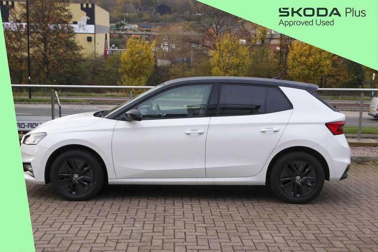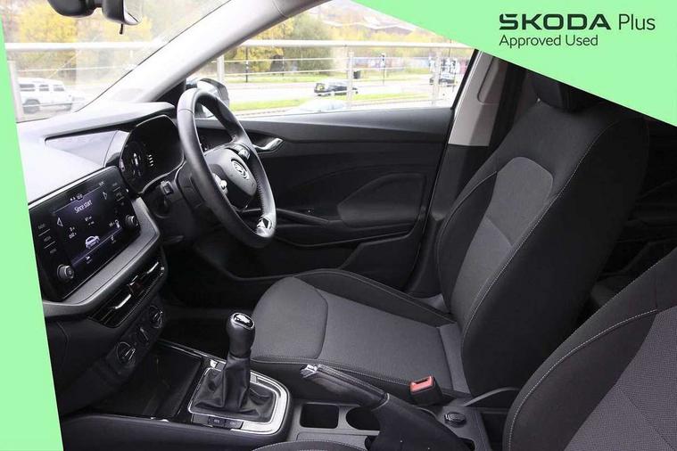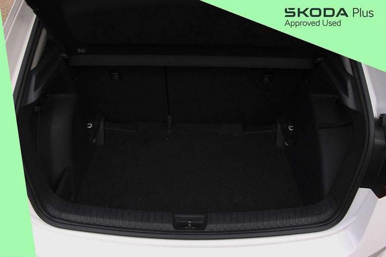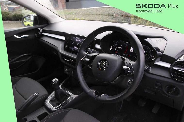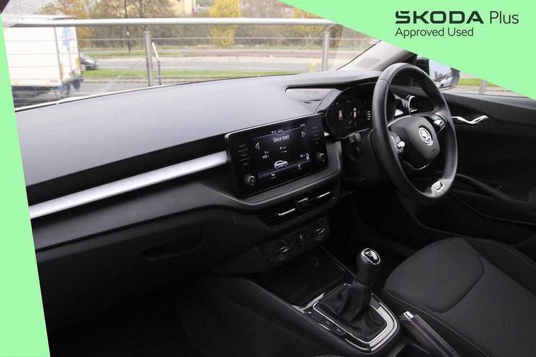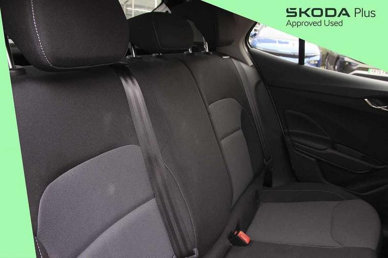 Bluetooth connection, Driver alert system - DAS, Electromechanical power steering, Exterior temperature gauge, Lane assist including road edge detection, Service interval indicator, Virtual cockpit with 10.25" colour display, 2x USB-C in the front (for data transmission and charging), 6 Speakers (4 in front and 2 in rear), Auxiliary socket for external MP3 player, Bolero radio with 8" colour display, DAB digital radio reception, Basic rear lights, Body coloured bumpers, Dimming rear view mirror with black frame, Door mirror integrated indicators, Electrically adjustable and heated door mirrors, Electrically adjustable front windows with function auto up/down, Front window wiper intermittent control, Headlight range control - Automatic, Ice scraper in fuel cap, LED daytime running lights with coming and leaving home feature, Mechanical adjustable rear windows, Privacy glass, Rear LED fog light, Rear side wing doors, Rear window wiper with washing nozzles, Roof mounted spoiler, SKODA tailgate lettering in chrome, Third brake light, 3 rear headrests, Backrest split and folding, Central console with fixed cup holder and storage box, Chrome handbrake release button, Fabric upholstery, Gearshift knob/handle in leather, Grain satin black interior door handles, Hand brake lever handle in leather, Height adjustable front headrests, Height adjustable steering wheel, ISOFIX and TopTether anchorage points to the outer rear seats, ISOFIX and TopTether on the front passenger seat, Luggage compartment lighting, Pollen filter, Rear seat bench unsplit, Single front passenger seat, Storm grey headlining, Sun visors with mirror and airbag label on passenger side, Ticket holder, Umbrella in drivers door, 3-point height adjustable front seats belts with pretensioner and force limiter, Automatic warning lights in case of crash, Driver and passengers airbag with switch off function, e-Call+, ESC including ABS, MSR, ASR, EDS, HBA and XDS, Front and rear seat belt warning, FRONT ASSIST (AEB City and AEB Inter Urban), Front side airbags, Head airbags, One tone horn, Pedestrian protection, Three rear 3-points safety seat belts with pretensioner and force limiter including stop function for outer rear seat belts, Tyre pressure monitoring system, Anti-theft alarm system including immobiliser, interior monitoring, backup horn, and towing protection, Anodized cross line upper decorative trim, Colour Edition air vents, Grain satin black central console cover, Grain satin black lower decorative trim, Satin black door and side trim panel in front, Anti-theft wheel bolts protection, Super-low rolling resistance tyres,