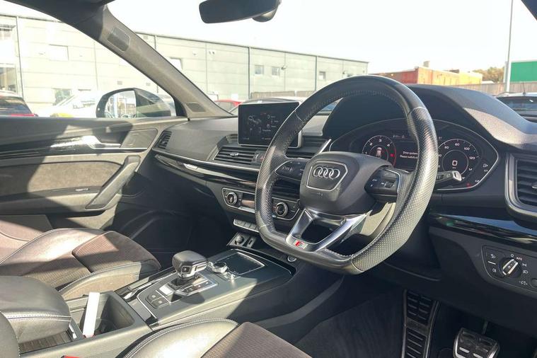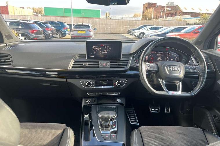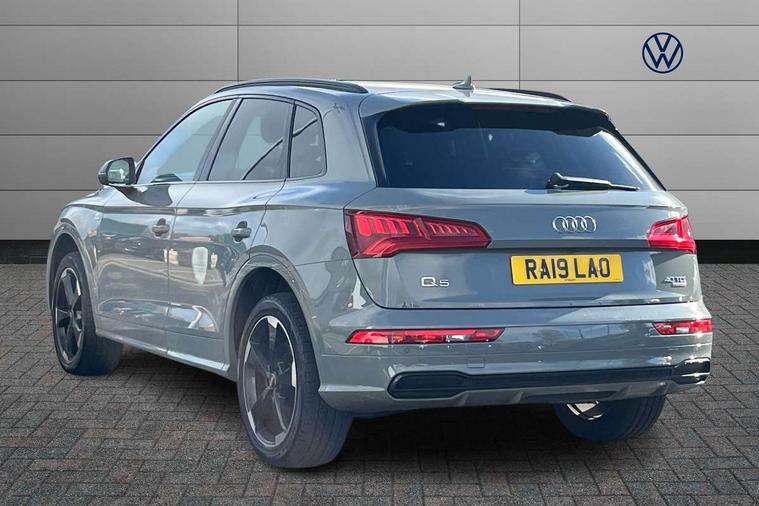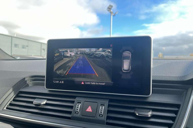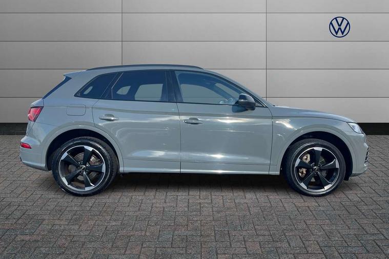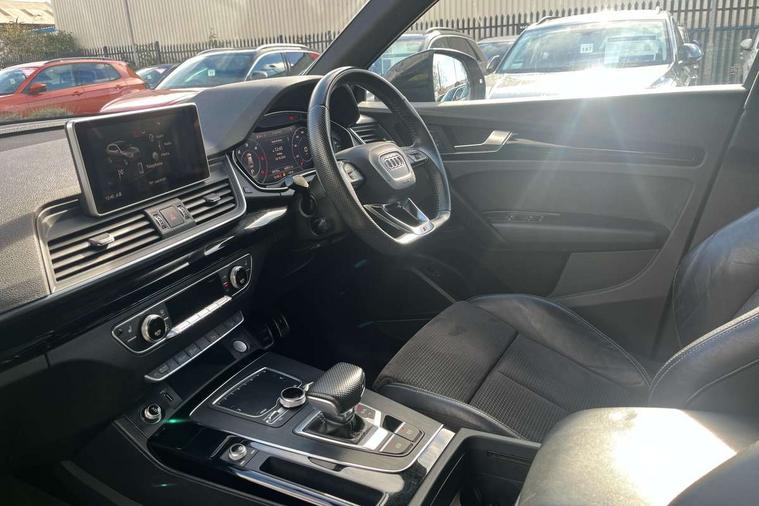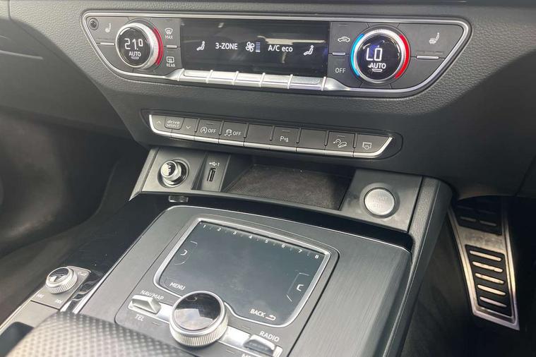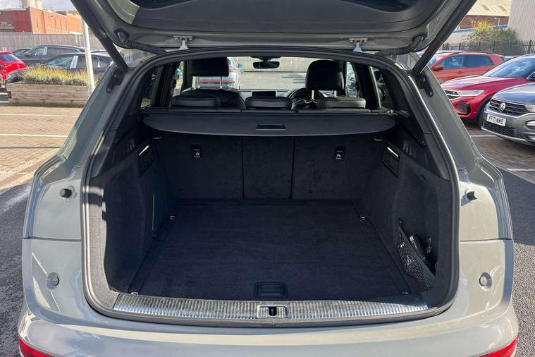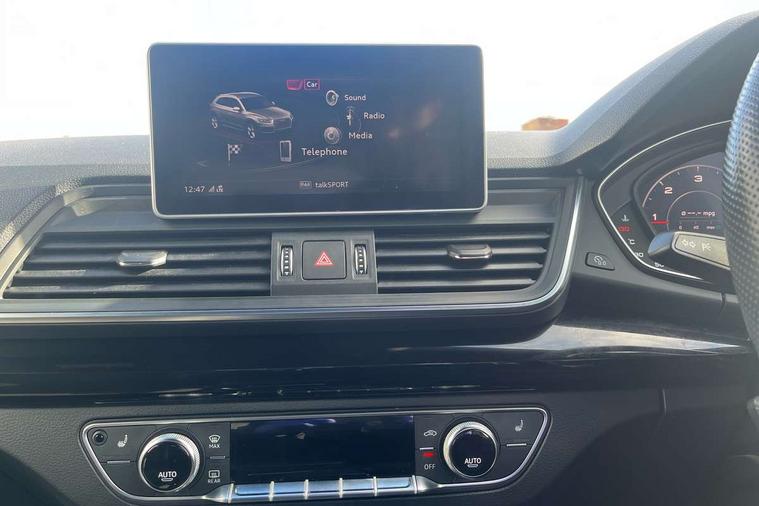 7" Colour driver information system, Audi drive select, Audi parking system plus with front and rear sensors, Audi smartphone interface, Electro - mechanical power assisted steering, MMI Navigation, Mobile telephone preparation - bluetooth interface, Power tailgate, Service interval indicator, Voice control system, Diesel particulate filter, 2 x USB charging port with aux input socket, 2x SD card slot, CD player, DAB Digital radio, MMI radio plus with 7" colour MMI screen and MMI controller, Acoustic windscreen, Air inlets in matt titanium black with blades in matt aluminium silver, Auto dimming rear view mirror, Automatic headlight levelling, Black roof rails, Body colour bumpers, Body colour rear diffuser with matt aluminium silver surrounds, Body colour underbody protection, Chrome exhaust tailpipe, Front and rear electric windows, High beam assistant, Light and rain sensor for auto activation of lights and windscreen wipers, Loading sill protector in stainless steel, Privacy glass with front acoustic glazing, Rear wiper, Titanium black door mirror housings, 3 rear headrests, 3 zone climate control, 40:20:40 split folding rear seat with rear centre armrest, Black cloth headlining, Contrast stitching on seats, steering wheel and gear lever gaiter, Front centre armrest, Front sports seats, Front/rear floor mats, Height adjustable front head restraints, ISOFIX child seat mounting and top tether, Luggage compartment carpet, Perforated leather gearknob, Removable luggage compartment floor, Stainless steel pedals, Sunvisors with vanity mirrors, Trunk roller cover, Non Smokers pack, Titanium black styling pack - Q5, 3 point seatbelts on all seats, 6 airbags - Driver, front passenger, curtain and side airbags, Electromechanical parking brake, Electronic stabilisation control including ABS, ASR and EDL, Front passenger airbag deactivation, Hill descent control, Hill hold assist, Multi collision brake assist, Pop-up bonnet for pedestrian protection, Pre sense city, Seat belt force limiter, Seatbelt monitoring, Tyre pressure warning, Warning triangle and first aid kit, Anti theft alarm, Anti-theft wheel bolts, Keyless Go access/ignition system, Remote central locking, Black piano finish inlays, 20" 5 arm rotor design sport alloy wheels in gloss anthracite black, diamond cut finish, Tool kit,