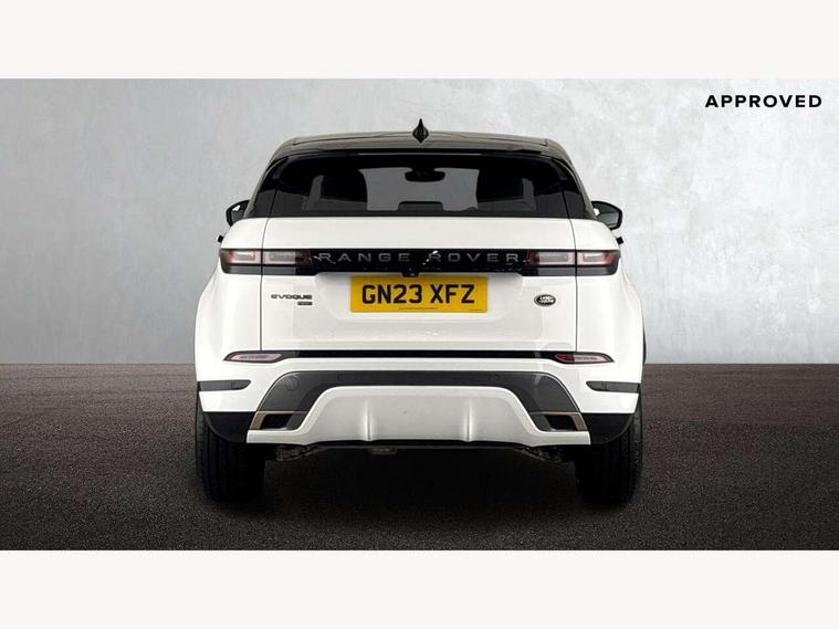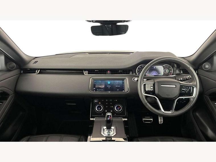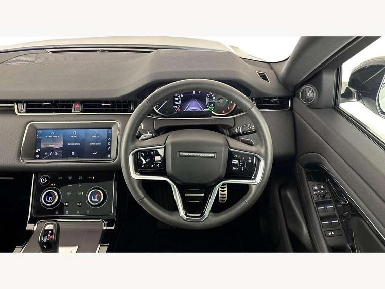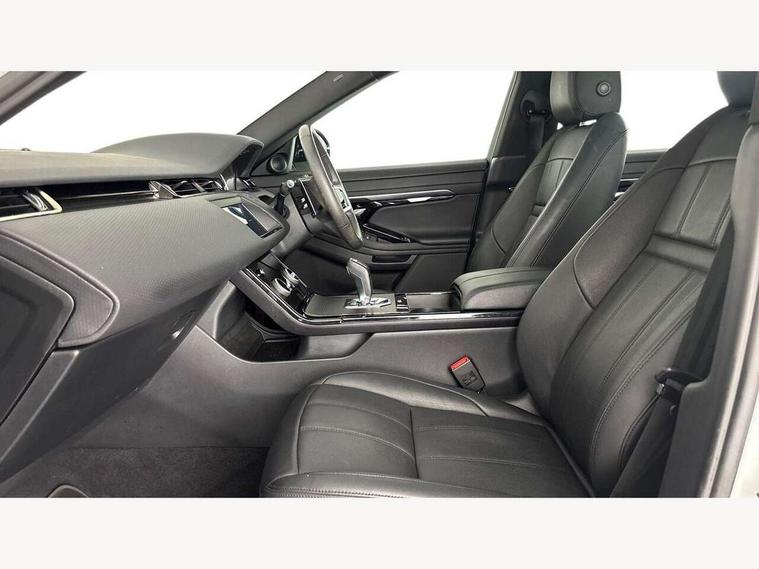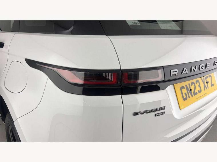Adaptive cruise control, Android Auto, Apple car play, Bluetooth connectivity, Brake pad wear indicator warning light, Driver condition monitor, eCall emergency system, Electronic power assisted steering (EPAS), Front and rear parking aid, InControl remote, Land Rover InControl apps, Lane keep assist, Pivi pro connected includes upgraded infotainment, connected navigation pro, Nuance speech licence, Push button starter, Traffic sign recognition with adaptive speed limiter, Voice control system, 7 kW onboard charger, All terrain progress control, Electric rear axle drive, Home charging cable, Large fuel tank, Passive suspension, Public charging cable, Terrain Response 2 Auto, Digital Audio Broadcast radio-DAB, Steering wheel mounted controls, Auto headlights, Daytime running lights, Electric windows with one touch open/close and anti trap, Evoque and R-Dynamic badge, Flush deployable exterior door handles, Heated rear window with timer, Heated washer jets, Heated windscreen, P300e badge, Power fold, auto-dimming, heated door mirrors with approach lights and auto dimming driver side, Rain sensing windscreen wipers, Rear fog lights, Rear side wing doors, Rear wiper, Tailgate spoiler, Third brake light, 40:20:40 split folding rear seats with centre headrest and armrest, Ambient interior lighting, Bright metal pedals, Isofix system on outer rear seats, Overhead lighting console, Overhead stowage for sunglasses, Passive front head restraints, Rear air vents, Rear centre headrest, Rear head restraints, Satin chrome gearshift paddles, Single passenger seat, Sunvisors with illuminated vanity mirrors, Twin sliding front centre armrest, 3 rear 3 point seatbelts, Anti-lock braking system (ABS), Customer configurable autolock, DSC - Dynamic Stability Control, Electronic brake force distribution, Electronic parking brake, Electronic traction control, Emergency braking, Front and rear seatbelt reminder, Hill descent control, Hill launch assist, Low traction launch, Power operated child locks, Roll stability control, Six airbags - Driver and passenger airbags/driver knee airbag/front side airbag and curtain airbags, Torque vectoring brake, Tyre pressure monitoring system, Alarm, Immobiliser, Intrusion sensor, Locking wheel nuts,