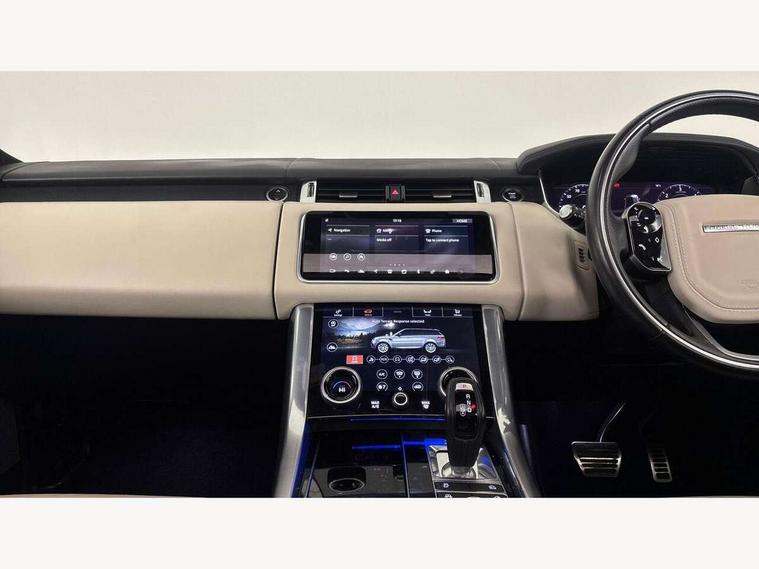 360 Parking aid, All Terrain Info Centre, Android Auto, Apple car play, Bluetooth connectivity, Clear exit monitor, Driver condition monitor, Electric power assisted steering (EPAS), Incontrol apps in vehicle touchscreen, Interactive Driver display instrument cluster, Mist sensor, Navigation pro system with 10" touch screen, app interface and media storage, Pro services and wifi hotspot, Push button start, Rear traffic monitor, Remote premium - Upgraded Incontrol remote app including remote climate control (engine dependent), remote lock + Unlock and remote beep + flash, TFT Virtual Instrument Panel, Touch pro duo system, Traffic sign recognition with adaptive speed limiter, Trip computer, Adaptive dynamics, All terrain progress control, Electronic active differential with brake torque vectoring, Electronic air suspension with dynamic response (active roll control), Gradient release control (GRC), Terrain Response 2 with dynamic program, Twin speed transfer box, Bluetooth audio streaming, DAB Radio (Digital Audio Broadcasting), Incontrol protect - SOS emergency call with automatic collision detection, optimised assistance call and Incontrol remote app essential, USB/aux input socket, Acoustic front and toughened rear side glass, Acoustic laminated front windows, Adaptive brake lights, Auto dimming interior rear view mirror, Automatic headlights, Body coloured side sills and bumpers corners, Centre high mounted stop light, Electric windows with one touch open/close and anti trap, Electrical towing preparation, Engine cover, Follow me home lighting, Front and rear recovery eyes, Front fog lights, Headlight power wash, Heated rear window, Heated windscreen includes heated washer jets, Illuminated metal treadplates with brand name script, LED rear lamps, Power fold, auto-dimming, heated door mirrors with memory and approach lights, Rain sensing windscreen wipers, Rear fog lights, Rear side wing doors, Rear wash/wipe, Remote window closing, Side repeater indicators in mirror, Standard bonnet, Trailer stability assist, Twin bright tailpipes, 2 way active front head restraints, 2 way rear head restraints, 3 seat bench in 2nd row, 60/40 load through rear seats, Auto air recirculation, Bright metal foot pedals, Centre console with armrest, Climate control memory, Configurable Ambient interior lighting, Customer configurable single point entry, Driver's footrest, Extended leather upgrade includes door top rolls and leather instrument panel mid section, Front and rear cupholders, Front and rear premium carpet mats, Front door storage space, Front map lights, Front seat back map pockets, Front stowage pocket, Front/rear passenger grab handles, Heated steering wheel, Isofix child seat preparation, Leather steering wheel with Atlas inserts, Loadspace light, Loadspace mounting provisions, Lockable glovebox, Multifunction steering wheel, Pollen filter, Power socket, Reach/rake electric adjustable steering column + entry/exit tilt away, Rear centre armrest, Rear ISOFIX, Roller blind loadspace cover, Satin chrome gearshift paddles, Single front passenger seat, Sports pedals, Three 12V accessory power outlets, Smartphone pack - Range Rover Sport, 3 point seatbelts on all seats, Anti-lock braking system (ABS), Brake pre-fill technology, Cornering brake control (CBC), Curtain airbags, Customer configurable autolock, DSC - Dynamic Stability Control, Dual stage driver/passenger airbags, EBD - Electronic brakeforce distribution, Electric parking brake, Electronic traction control, Emergency braking includes city, urban AEB and pedestrian, Front seatbelt pretensioners, Gradient acceleration control, Grey anodised brake calipers, Height adjustable front seatbelts, High speed emergency braking, Hill descent control, Hill launch assist, Low traction launch, Passenger seat occupant detector with front airbags, Power operated child locks, Roll stability control, Seatbelt warning, TPMS (Tyre pressure monitoring system), Immobiliser, Intrusion sensor, Keyless entry, Locking wheel nuts, Perimetric and volumetric anti theft alarm, Remote locking,