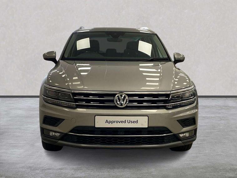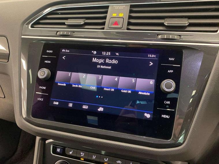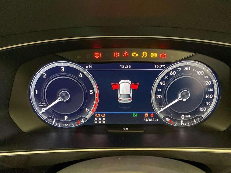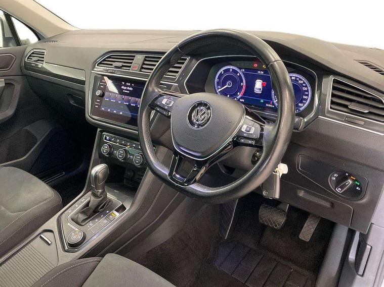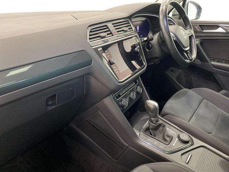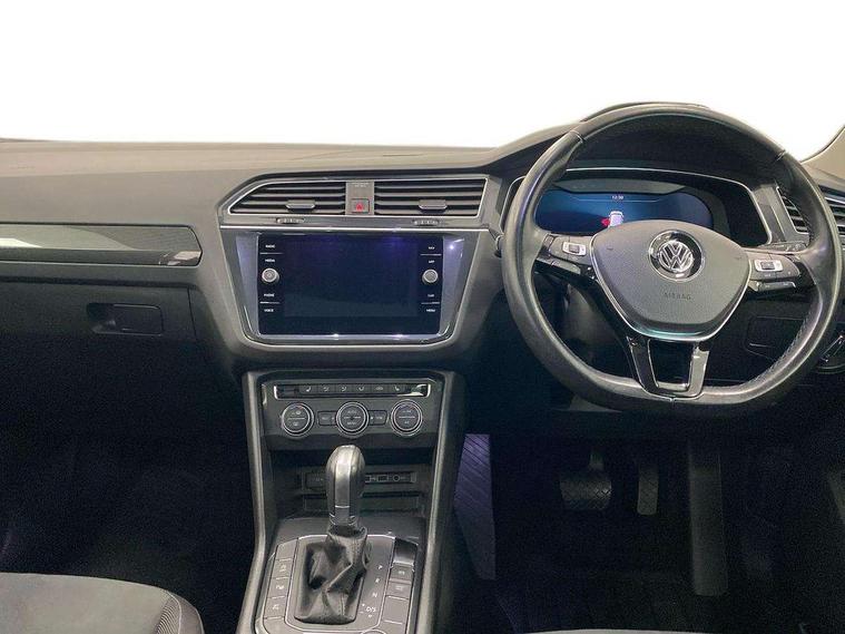 App-Connect, Active information display, Adaptive cruise control, Bluetooth phone integration system, Distance control assist, Drive mode selector, Fatigue detection system, Instrument cluster, Lane assist, Low washer fluid warning light, Outside temperature display, Service interval indicator, Speed limiter, Warning lights, Diesel particulate filter, XDS electronic differential lock, 2x USB sockets in front, Aux-in socket, DAB Digital radio, MP3 compatible single CD player, SD card slot, Auto dimming interior mirror, Automatic activation of hazard warning lights, Black door protector with chrome inserts, Body colour door handles, Body colour door mirrors, Body coloured bumpers, Chrome side body trim, Chrome side window surrounds, Chrome trimmed radiator grille, Coming/leaving home lighting function, Dusk sensor + auto driving lights, Electric folding door mirrors, Electric heated + adjustable door mirrors, Electric panoramic sunroof with sunblind, Front and rear electric windows, Heated rear window, LED headlights with dynamic light assist daytime running lights and cornering front fog lights, LED rear lights, Rain sensor windscreen wipers, Rear windscreen washer and wiper with interval delay, Silver rear diffuser trim, Silver roof rails, Silver under body guard, Tinted windows (B pillar backwards), Windscreen wipers/ intermittent wipe + 4 position delay, 12V Accessory socket in centre console, 3 rear headrests, 3 zone climate control, 4 load lashing points, 40:20:40 split folding rear seats, Bag hook in luggage compartment, Driver + front passenger lumbar support, Foldable passenger seatback, Front + rear carpet mats, Front centre armrest with 12v socket, Front centre armrest with storage + rear 2 air vents + cupholders, Front seatback folding tables, Height/reach adjust steering wheel, Illuminated driver/passenger vanity mirrors, Illuminated scuff plates, Interior light with delay, Isofix Preparation 2 Rear child seats, Leather gear knob, Load through provision with 2 cupholders when folded, Lockable cooled glovebox, Luggage compartment lighting, Luggage compartment side storage, Map pockets on front seats, Passenger seat height adjuster, Passenger underseat drawer, Rear cupholders, Removable luggage cover, Sliding/reclining rear seats, Storage compartment in driver's door, Storage compartment in passenger's door, Storage compartment in rear doors, Storage tray on dashboard, Sunglasses storage, Variable boot floor, Ambient lighting pack - Tiguan, 3 rear 3 point seatbelts, ABS+EBD+Brake assist, Active bonnet, Active pedestrian safety system, Curtain airbags, Driver/Front Passenger airbags, Driver/Passenger whiplash optimised head restraints, Drivers knee airbag, DTC - Drag torque control, Electronic parking brake with auto hold, ESP with EDL + ASR, First aid kit, Front assist including city emergency braking, Front side airbags, Head airbag system, Height adjustable front 3 point seatbelts + pretensioners, Hill hold control, Passenger airbag deactivate switch, Passenger knee airbag, Pre crash system, Rear side airbags, Seatbelt warning lamp and buzzer, Two tone horn, Warning triangle, Alarm with interior protection, Electronic engine immobiliser, Remote central locking with 2 remote folding keys, Chrome door trim inserts, Piano black interior trim, Steel space saver spare wheel,