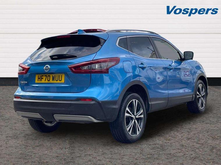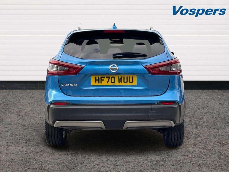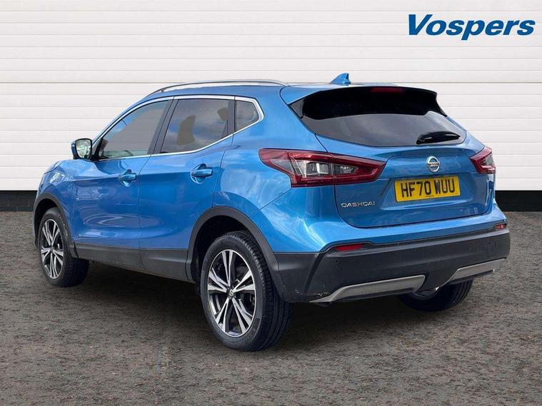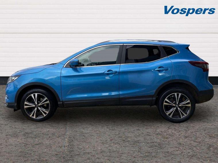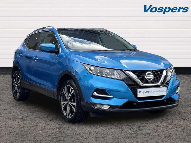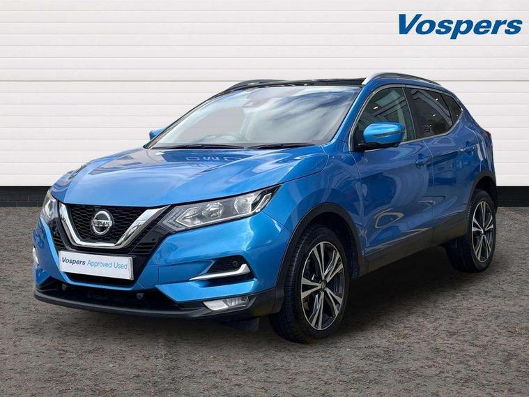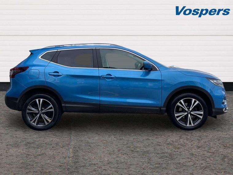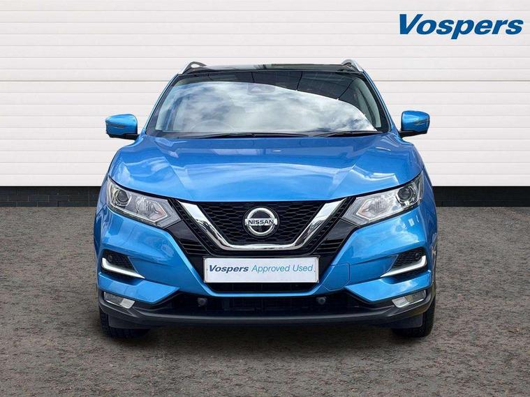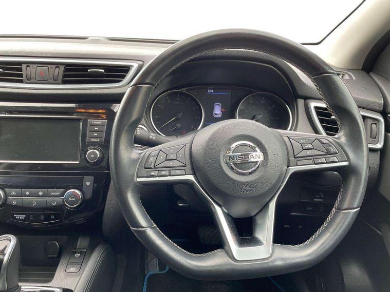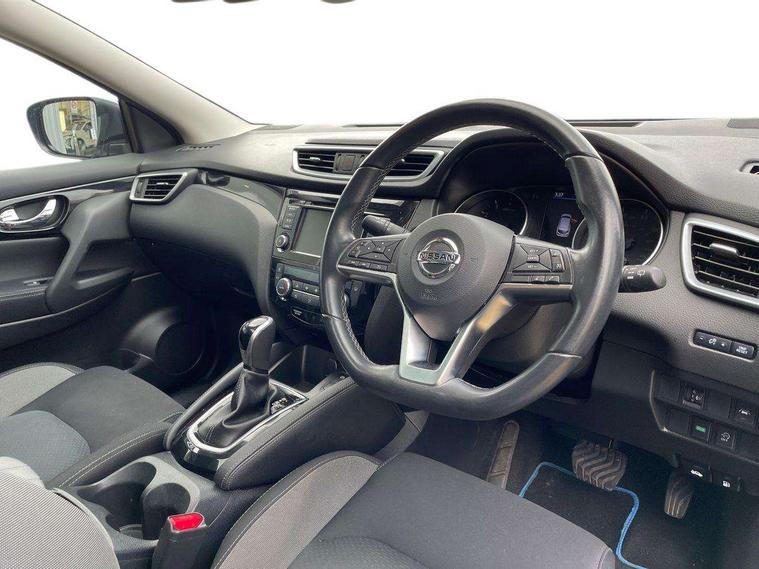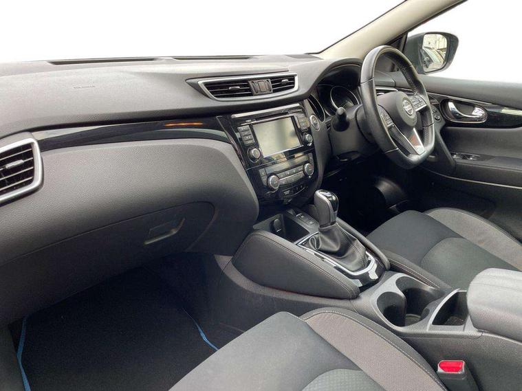 360 degree Intelligent around view monitor, Advanced drive assist display 5'' TFT coloured screen, Apple car play/Android Auto, Bluetooth connectivity, Cruise control + speed limiter, Electric speed sensitive power steering, Front parking sensors, Idle stop/start system, Intelligent park assist, Lane departure warning system, Nissan connect evo 7" touchscreen navigation and entertainment system, Normal or sport selectable steering, Outside temperature sensor, Premium Tomtom connected services, Push button starter, Rear parking sensors, Service interval indicator, Smartphone integration, Traffic sign recognition, Trip computer, Voice control system, Nissan chassis control (intelligent ride control, intelligent trace control, intelligent engine brake), 6 speakers, AM/FM radio, CD audio system, Aux-in socket, DAB Digital radio, Steering wheel mounted audio controls, USB port, Anti dazzle rear view mirror, Auto wipers, Body colour bumpers, Body coloured door handles, Body coloured door mirrors, Chrome window surround, Daytime running lights dip function when turn signal applied, Electric folding door mirrors, Electric front and rear windows with one touch illuminated window controls, Electrically adjustable door mirrors, Front fog lights, Halogen headlights, Heated door mirrors, High beam assist, Intelligent auto headlights, LED indicators in door mirrors, Matt silver roof rails, Privacy glass, Rear roof spoiler, Rear wiper with reverse link, Shark fin antenna, Signature LED daytime running lights, Silver rear styling plate, Underbody vortex generators, 2 X front 12v power sockets, 3 height adjustable rear headrests, 60/40 split folding rear seat, Ambient interior lighting, Ambient lighting around centre console, Bi-colour cloth upholstery, Boot lighting, Centre console storage box/armrest, Chrome interior door handles, Driver's seat manual height adjust, Dual zone climate control, Front and rear door pockets with bottle holders, Front and rear seat belt pre-tensioners with load limiters, Height adjustable front headrests, ISOFIX restraints on outer rear seats x2, Leather D shaped steering wheel, Leather gear lever, Leather knee pad, Luggage board system, Manual height adjustable passenger seat, Manual lumbar support on driver seat, Manual lumbar support on passenger seat, Monoform front sport seats with plastic backboard, Parcel shelf stow function under luggage board, Pollen filter, Rear armrest with 2 cupholders, Synthetic leather wrapped door handle with contrasting stitching, Tilt/telescopic adjustable steering wheel, Velour floor mats, Glass roof pack - Qashqai, 6 airbags - Driver, front passenger, curtain and side airbags, ABS, ESP, EBD and brake assist, Auto hold function, Child locks on rear doors, Electronic parking brake, Front and rear seat belt warning, Height adjustable front seatbelts, Hill start assist, Intelligent emergency braking with pedestrian recognition, Passenger airbag deactivation system, Three 3 point rear seatbelts, Tyre pressure monitoring system, Anti-theft immobiliser, Intelligent Key, Remote central locking, Thatcham Cat.1 alarm, Carbon graphite dash trim, 18" Two tone alloy wheels,
