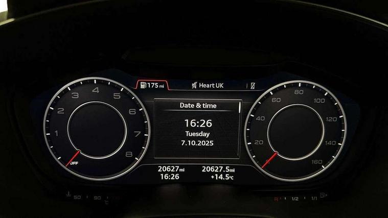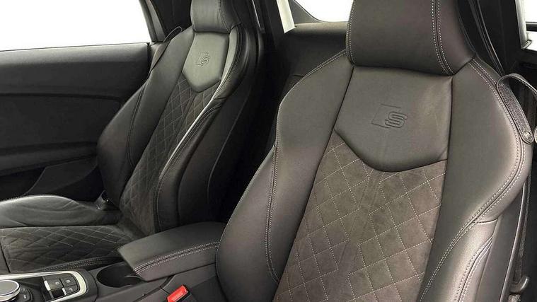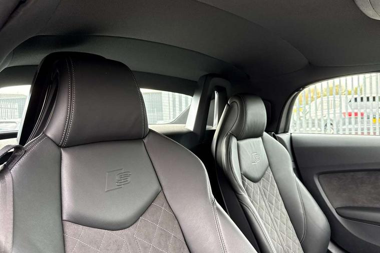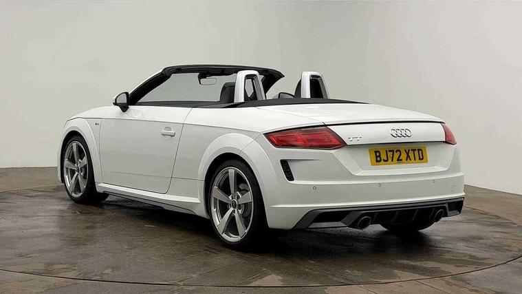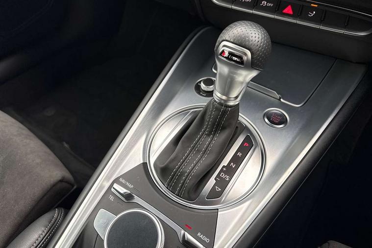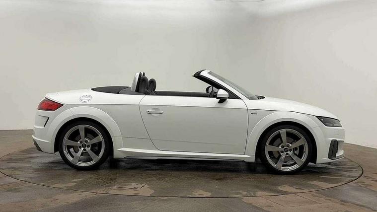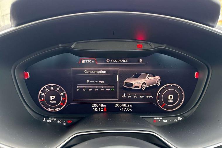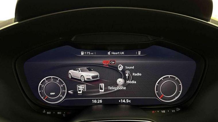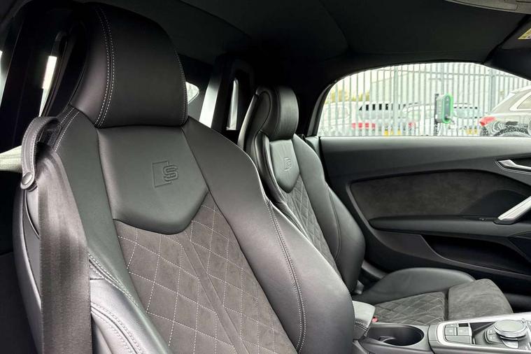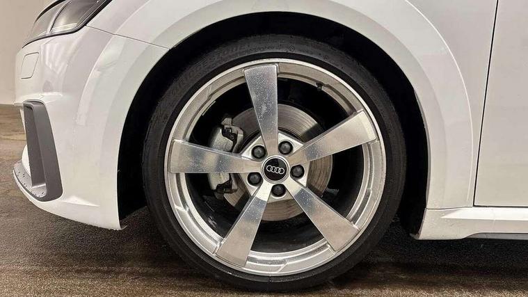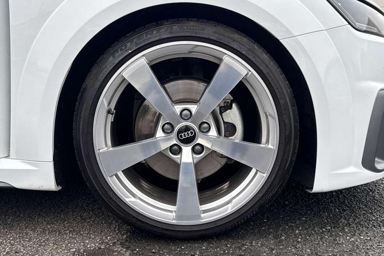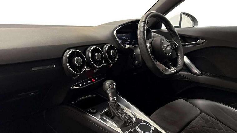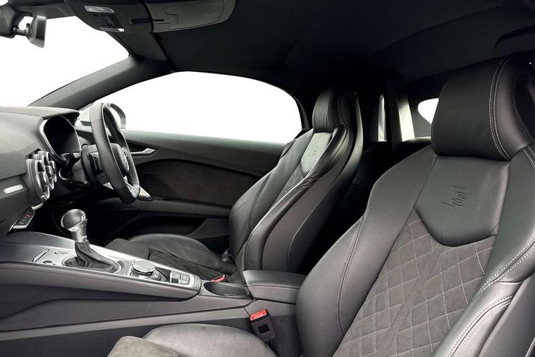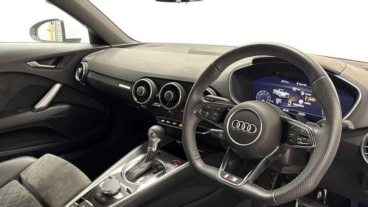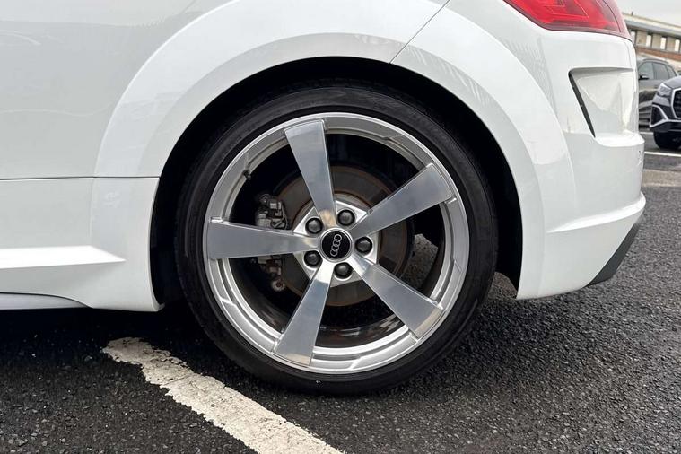 Audi drive select with 4 Pre configured modes, Audi smartphone interface, Audi virtual cockpit - 12.3" high-resolution LCD display with fully customisable instrument cluster, Cruise control + speed limiter, Emergency call service, MMI touch panel, Mobile phone preparation with bluetooth interface, Progressive power assisted steering, Seat belt microphone, Service interval indicator, Start/Stop system with energy recuperation, TP memo, S line sports suspension, AM/FM radio, Bluetooth audio streaming, DAB Digital radio, MMI Radio with CD player and SD/XC card slot, Auto dimming rear view mirror, Auto headlight range control, Black door mirrors, Body colour bumpers, Electric folding door mirrors, Electric front windows, Electrically adjustable and heated door mirrors with integrated LED side indicators, Front fog lights, Fully automatic acoustic hood, Green tinted heat insulating glass, High gloss black radiator grille, LED 3rd brake light, LED daytime running lights, LED headlights with LED rear lights + dynamic rear indicators, Light and rain sensors, Rear boot, Retractable rear boot spoiler, S line badges on front wings, Sunband for windscreen, 12V socket, 3 spoke flat bottomed high multi-function leather sport steering wheel with gearshift paddles, 4 way electric lumbar support for driver and front passenger, Black headlining, Black roll bar, Contrasting silver stitching in steering wheel, Door sill trims with S line logo, Extended aluminium look with stainless steel pedals, Front centre armrest, Front passenger seat, Front super sports seats, Heated front seats, Height adjustable driver's seat, Height adjustable front head restraints, Height/reach adjust steering wheel, ISOFIX child seat mounting for front passenger seat with airbag deactivation, Manual adjustment of seat height, fore/aft position, seat angle, seat depth and backrest angle, Perforated leather gearknob in black, S Line badge on steering wheel, Non smoking pack - TT/TT RS, S Line design styling pack - TT, 3 point front seat belts, ABS, ASR traction control, Curtain airbags, Driver and front passenger airbag with front passenger airbag deactivation, EDL traction control, Electromechanical parking brake, ESP, First aid kit, Front side airbags, Hill hold assist, Seatbelt warning, Tyre pressure loss indicator, Warning triangle, Anti theft alarm, Anti theft wheel bolts, Immobiliser, Keyless Go, Remote central locking, Matt brushed aluminium inlays, Tool kit, Tyre repair kit,