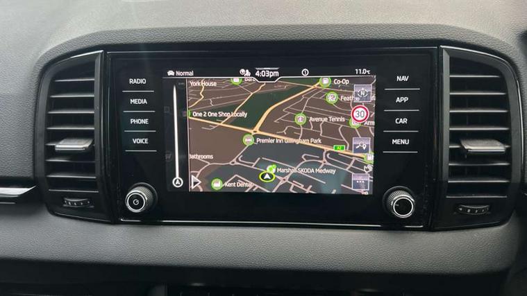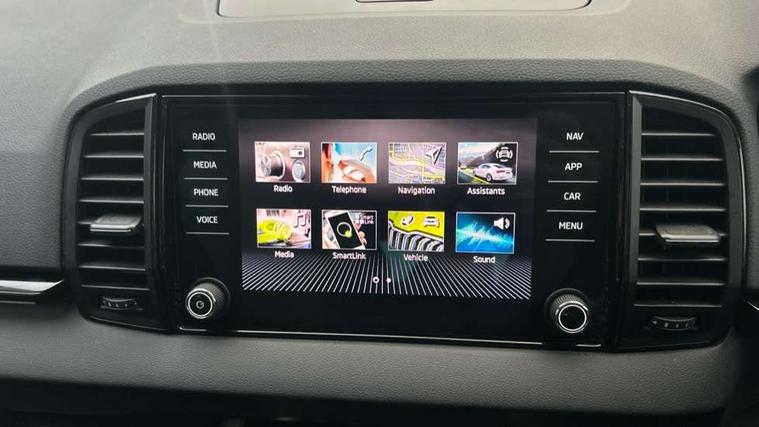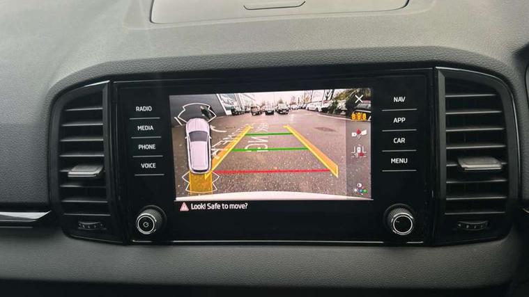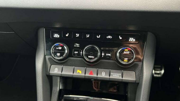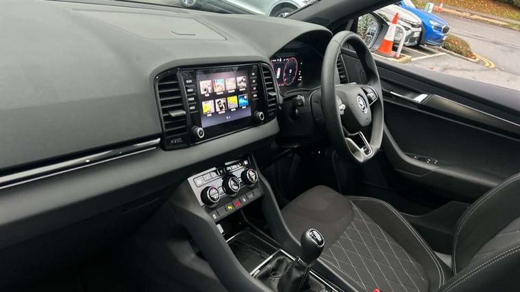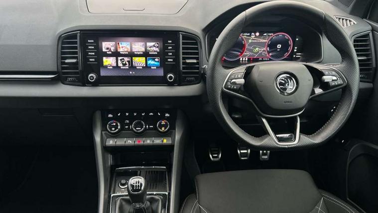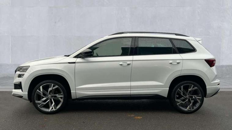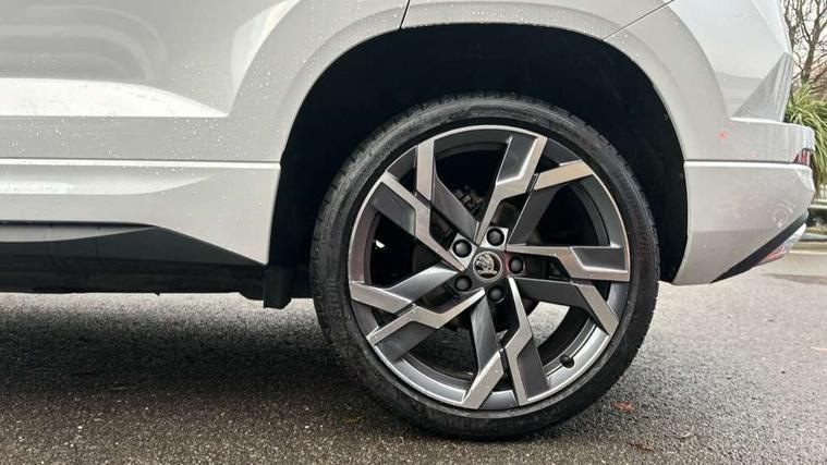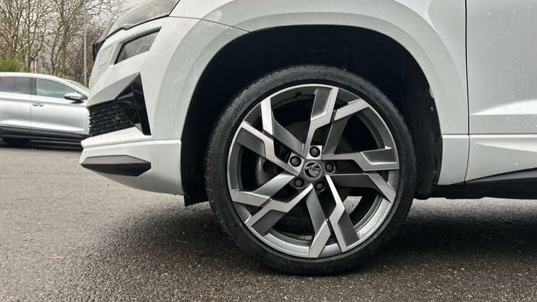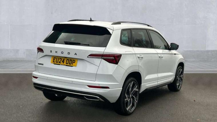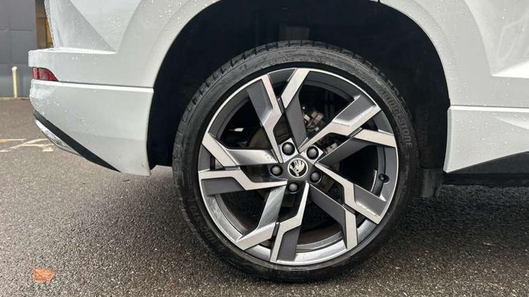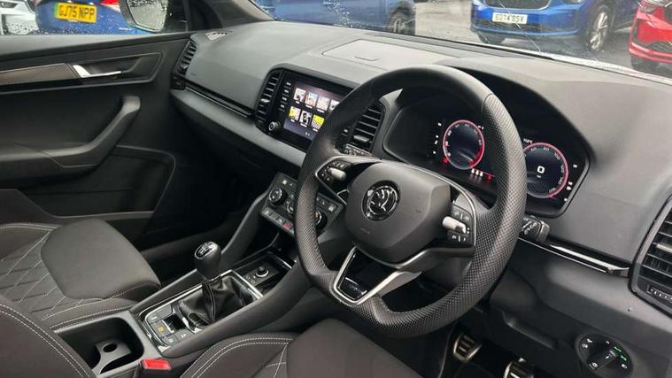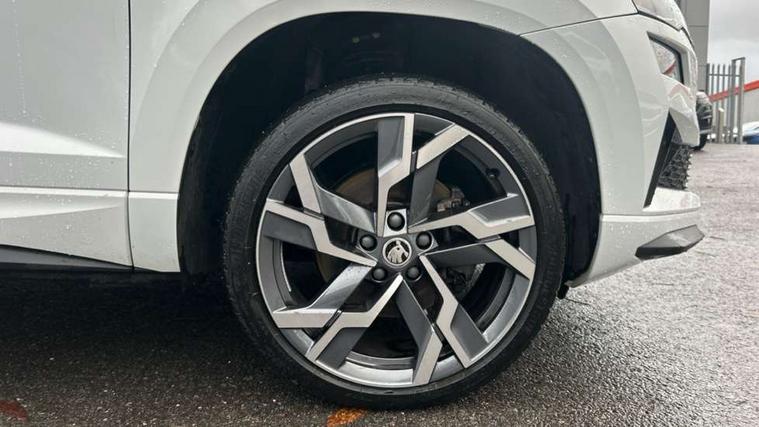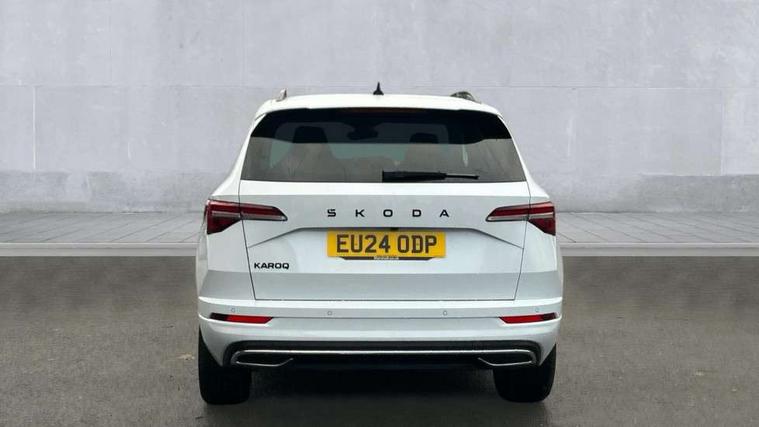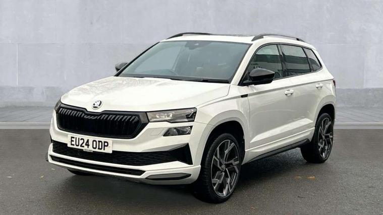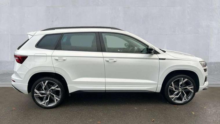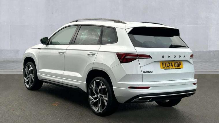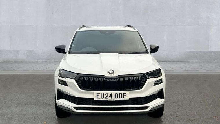 8" Digital display, Advanced driver attention and drowsiness monitor, Emergency services call system, Outside temperature gauge, Sensor for driver assistance systems, Service interval indicator, SmartLink wireless for Apple and wired for Android, Start/stop system with regenerative braking, USB C Port x 2 in front centre console, Virtual Cockpit - 10.25" digital display, Virtual pedal with electrically operated boot door, Wireless smartphone charging, DAB radio with Bluetooth, USB connection, Acoustic glass, Aero front windscreen wipers with intermittent function, Auto dimming rear view mirror with light and rain sensors, Black door mirrors, Black electric window control buttons, Black radiator grille, Black roof rails, Body colour door handles, Electric front and rear windows with child proof lock, Front door steps with SportLine logo, Heated rear windscreen, LED daytime running lights, LED rear lights with high functionality welcome effect and dynamic indicators, Light assistant (coming/leaving home/tunnel light), Panoramic sliding sunroof, Plastic scuff plates in door apertures, Privacy glass, Protective door side sills in body colour, Rear diffuser, Rear side wing doors, Rear spoiler, Rear window wiper with washer system and intermittent control, Safety reflectors on front doors, Skoda lettering on tailgate in black, Sportline badge on front fender, Sportline decorative inserts with badging, Sports front and rear bumpers, Third brake light, 1.5 litre bottle holders in driver and front passenger door panels, 12V socket in boot, 12v socket in front centre armrest with storage compartment and rear air vents, 2 x Tablet holder, 3 rear height adjustable headrests, 3 seat bench in 2nd row, 3 spoke sports leather heated multifunction steering wheel, 4 foldable roof handles with rear coat hooks, Black floor carpet, Black roof headlining, Chrome inner door handles, Foldable hooks in the boot, Front head restraints, Height adjustable front three point seats belts with tensioners, Height/reach adjust steering wheel, Ice scraper, Illuminated glovebox, Illuminated luggage compartment, Isofix child seat preparation for front passenger seat, Isofix child seat preparation outer rear, Manual lumbar support for front seats, Pen holder, Pollen filter, Rear boot cover, Rear reading lights, Rear seats fixed folding and divided 60:40, Rubbish bin door, Safety vest holder, Single front passenger seat, Storage box in upper central dashboard closed, Sunvisors with illuminated vanity mirrors, Textile floor mats, Ticket holder, Titan black interior ceiling, Umbrella under passenger seat, Under passenger seat storage compartment, LED Interior lighting pack with Skoda welcome logo - Karoq, Light Pack - Karoq, Non Smokers pack, Automatic door unlocking in case of crash, Automatic fuel cut off in case of crash, Driver airbag, Electronic parking brake with auto hold function, Emergency rear braking signal, ESC (incl. ABS+MSR+ASR+EDS+HBA+DSR+RBS+MKB), Front side airbags, Head airbags, Hill hold control, Knee airbags, Passenger airbag with switch-off function, Pedestrian monitor, Seatbelt reminder signalisation and pretensioner for all seats, Three point seatbelts rear, Two tone horn, Tyre pressure monitor, Alarm with interior monitoring, back up horn and tilt sensor with safe function, Electronic engine immobiliser, Keyless entry and start/stop, Remote central locking with 2 remote folding keys, Black air vent surround, Black centre console, carbon door decor, Satin black dashboard, Satin black door trim, 19" Sagittarius anthracite alloy wheels, Anti-theft wheel bolts protection, Breakdown and tool kit,