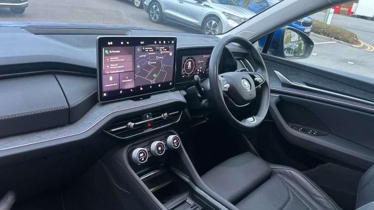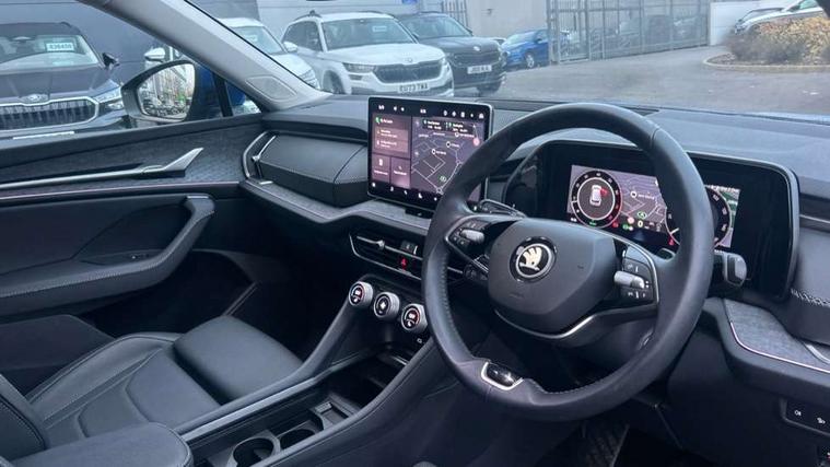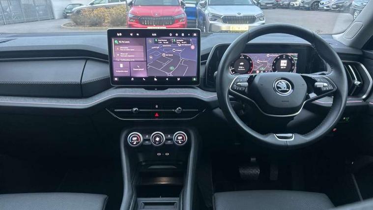 13" satellite navigation touchscreen display, Blind spot detection with door exit warning, Bluetooth system, ChatGPT functionality, Drive mode selector, Driver alert with fatigue sensor, Driver drowsiness alert system, Dry display cleaner, e call+, Front cross traffic assist, Lane assist, PAS, Rear traffic assist, Tailgate unlocking from outside, Traffic sign recognition, USB C Port x 2 in front centre console, Virtual Cockpit - 10.25" digital display, Voice control system, Wireless charging for two smartphones (15W) with cooling function, Wireless SmartLink for Apple CarPlay and Android Auto, Stop/start function, 2x USB-C in the rear, DAB Digital radio, Aero front windscreen wipers with intermittent function, Auto dimming rear view mirror, AWL (all weather lighting) and all weather light with cornering function, Black wheel arch surrounds, Body colour bumpers, Body colour door mirrors and handles, Cornering light and poor weather light, Electric folding /adjustable/separted heated/folding door mirrors, auto dimming with boarding sports and memory function, Electric front and rear windows, Exterior black decorative trims, Heat insulating glass in windshield, Heated rear window, Ice scraper in fuel tank cap, Invisible tailpipe, LED daytime running lights, LED rear fog light, LED third brake light in rear spoiler, Light assistant with automatic headlight control and coming home feature, Logo projection in door mirrors, Privacy glass, Rear side wing doors, Rear spoiler, Rear window wiper, Red decorative strip between rear LED lights, Safety reflectors on front and rear doors, Window control switches with black trim, Windscreen wipers with rain sensor, Without engine designation, 1.5l bottle holder points in all door, 12V socket in boot, 1x centre rear reading light, 2 seat bench in 3rd row, 3 configurable smart dials with 32mm coloured display, 3 seat bench in 2nd row, 4 foldable roof handles with rear coat hooks, Ambient interior lighting - Dashboard, front-door stowage compartments, front and rear door panels and footwell lighting, Automatic gear selector on steering wheel, Chrome interior door handles, Driver/front passenger reading lights, Fabric headlining, Fixed bench 40:60:40 split folding backrests, Front and rear floor mats, Front centre armrest with jumbo box storage compartment, cup holder and 12V socket, Front courtesy lights, Height adjustable front headrests, Isofix child seat fittings in outer middle row rear seats and front passenger with top tether, Manually adjustable steering column, Pollen filter, Rear centre armrest with cupholders, Rear seat boot backrest release, Retractable luggage compartment cover, Single front passenger seat, Sliding trunk cover, Small Bags on the inner sides of the front backrests, Storage pocket including mobile phone pockets on the backs of the front seats, Sunvisors with illuminated vanity mirrors, Three rear height adjustable headrests, Ticket holder on A Pillar, Tri zone climate control, Umbrella in door panel x1 made from sustainable materials, Upper and lower glovebox with card holder and coin compartment, USB C port by rear view mirror for charging only (15W), Exterior styling pack - Kodiaq, Auto door release and activation of warning lights in the event of an accident, Driver and front passenger airbag with knee airbag and front passenger airbag deactivation, Electric child locks, Electronic parking brake, ESC (incl. ABS+EMD+MSR+ASR+EDL+HBA+DSR+RBS+ESBS+MCB+TSA+XDS), Front assist with braking reaction to vehicles, pedestrians and cyclists, Front disc brakes, Fuel cut off safety device, Height adjustable front 3 point seatbelts + pretensioners, Hill hold control, Junction assist with automatic emergency braking, Rear disc brakes, Safety vest holder in door, Seat belt reminder for all seats, Three point rear seat belts, Two tone horn, Tyre pressure monitor, Anti-theft wheel bolts, Immobiliser, Remote central locking with 2 keys, Breakdown kit,