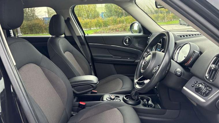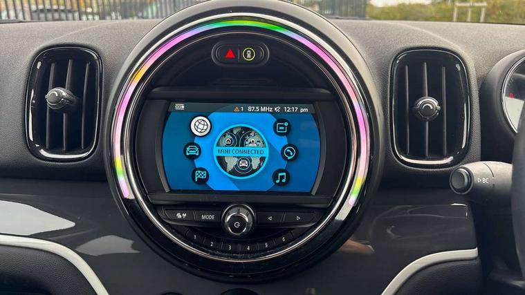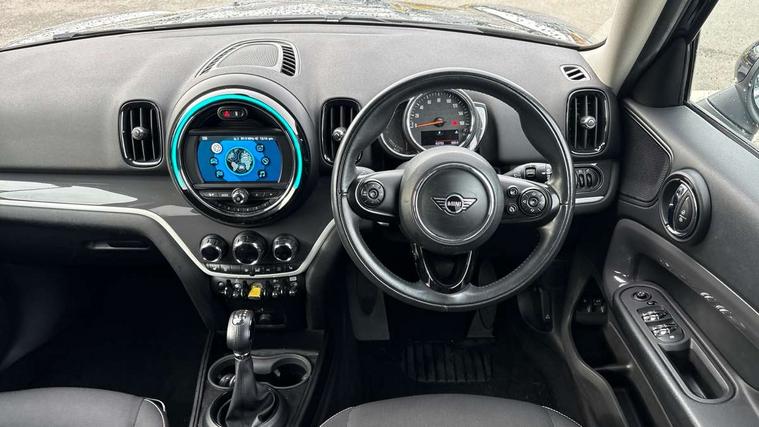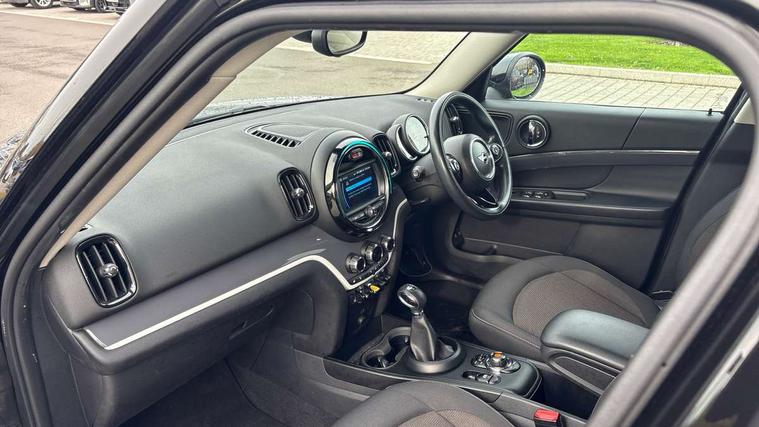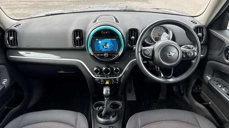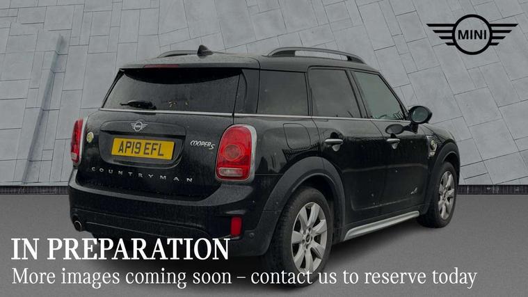 Active Guard incl speed limiting and lane departure functions with auto steering, and front collision warning with brake intervention, Automatic start/stop function with brake energy recuperation, eDrive button, Electro-mechanical speed dependant steering assistance, Instrument cluster, Mini E-call, MINI TeleServices, On board computer, Rear parking distance control, Automatic transmission, Charging flap on front left lower A-panel, Double Vanos system, Fully variable valve control, High precision injection, Performance Control, FM tuner and DAB digital radio, Bonnet scoop, Chrome border honeycomb structure radiator grille with S badge, Chrome fuel filler cap, Day time driving lights, Dynamic brake lights, Electric windows, Heated rear window, Heated windscreen washer jets, Metal door sill strips with Cooper S imprint, Model logo, Model logo on Tailgate, Rain sensor with auto headlights, Rear fog lights, Rear window wiper, Side scuttle panel with integrated indicator, Split rear doors, Sun/heat protection glass, Twin exhaust tailpipe, White indicator lenses, 12V Accessory socket in centre console, 360L luggage compartment capacity, 4 lashing eyes in luggage compartment, 40:20:40 split folding rear seats, Charging cable, Chrome interior highlights, Colour line - Carbon black, Cupholders, English handbook, Front headrests, Glove compartment, Headliner with grab handles and clothes hooks, Height and length steering column adjustment, Isofix rear child seat preparation, Leather gearshift lever and handbrake gaiters, LED reading lights, vanity mirror lights, front foot well light and spotlight on front seats, Manual air conditioning, Mechanical seat adjustment, driver seat height adjust, forward/back and front seats backrest, Multifunction steering wheel, Passenger seat height adjuster, Rear headrests, Storage compartments in doors, Sunvisors with vanity mirrors, Tool kit, Excitement pack - Countryman, Navigation pack - Countryman, 2 tone horn, 3 point seatbelts on all seats, 6 Airbags - front, side, head and seat belt tensioners, Anti-lock braking system (ABS), DSC - Dynamic Stability Control, Electronic handbrake, Front and rear disc brakes, Hill start assist, Tyre pressure monitoring system, Alarm system with tilt sensor, monitoring doors, bonnet interior and tailgate, Auto drive away locking, Deadlocking function, Electronic vehicle immobiliser, Locking wheel bolts, Start/stop toggle with keyless go,