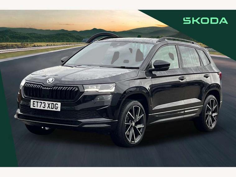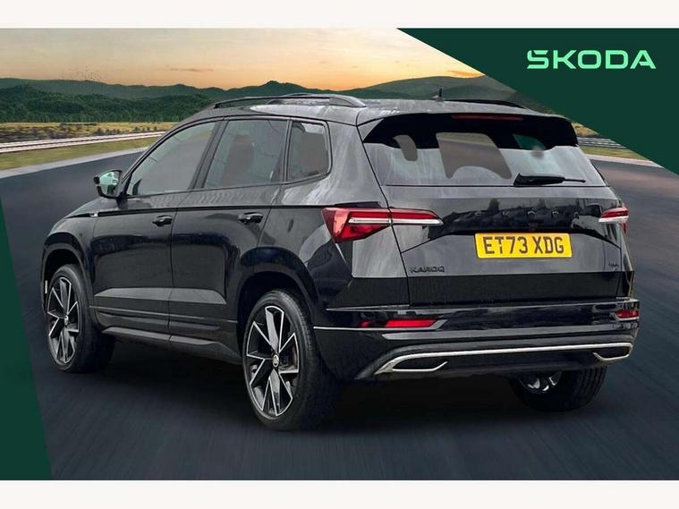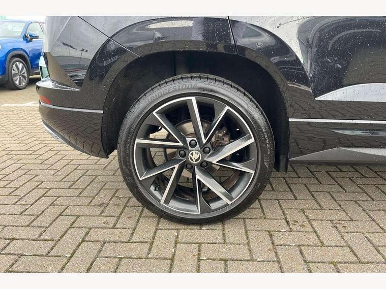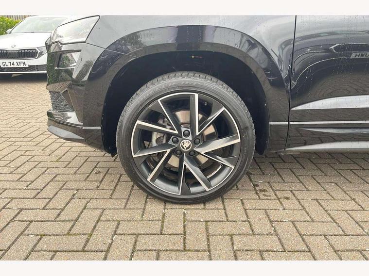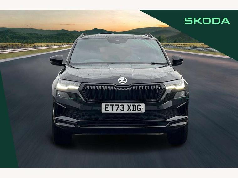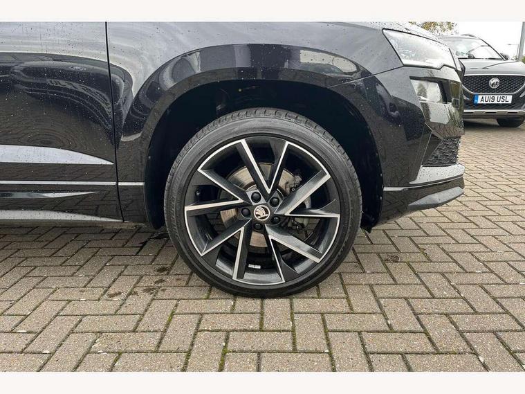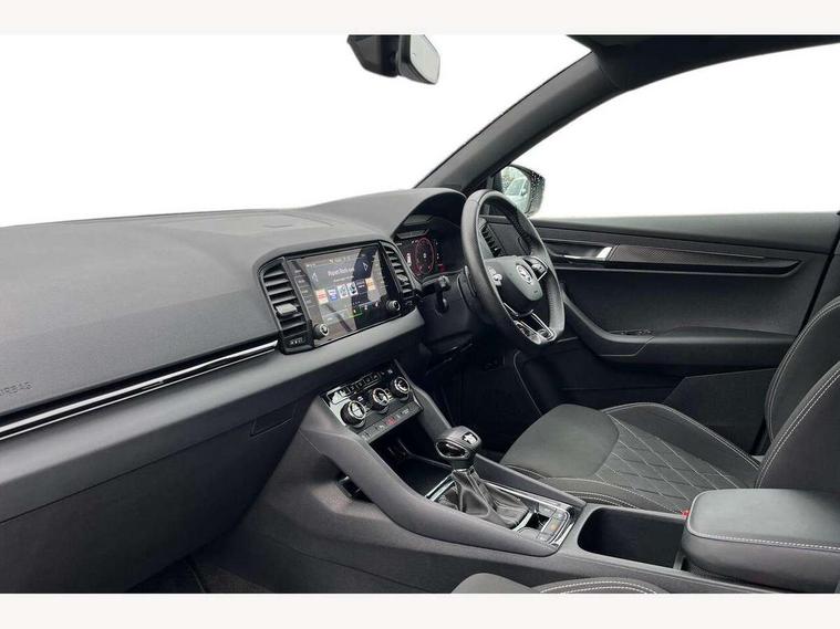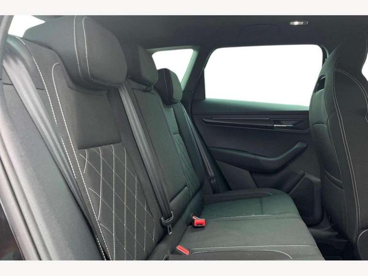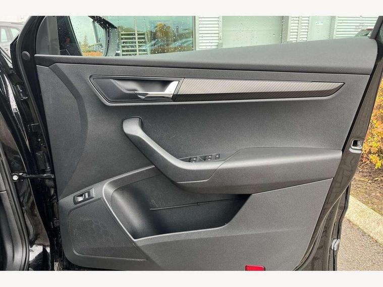8" Digital display, Care connect, Driver fatigue sensor, Emergency services call system, Outside temperature gauge, Service interval indicator, SmartLink wireless for Apple and wired for Android, Start/stop system with regenerative braking, USB C Port x 2 in front centre console, Virtual cockpit, Virtual pedal with electrically operated boot door, Diesel particulate filter, 8 Speakers, DAB radio with Bluetooth, USB connection, Wireless charging without wireless aerial connection, Acoustic glass, Aero front windscreen wipers with intermittent function, Auto dimming rear view mirror with light and rain sensors, Black door mirrors, Black electric window control buttons, Black radiator grille, Black roof rails, Body colour door handles, Electric front and rear windows with child proof lock, Front door steps with SportLine logo, Heated rear windscreen, LED 3rd brake light, LED daytime running lights, LED rear lights with high functionality welcome effect and dynamic indicators, Light assistant (coming/leaving home/tunnel light), Panoramic sliding sunroof, Plastic scuff plates, Privacy glass, Protective door side sills in body colour, Rear diffuser, Rear side wing doors, Rear spoiler, Rear window wiper with washer system and intermittent control, Safety reflectors on front doors, Skoda lettering on tailgate in black, Sportline badge on front fender, Sportline decorative inserts with badging, Sports front and rear bumpers, 1.5 litre bottle holders in driver and front passenger door panels, 12V socket in boot, 12v socket in front centre armrest with storage compartment and rear air vents, 3 rear height adjustable headrests, 3 seat bench in 2nd row, 3 spoke leather sports multifunction steering wheel and silver stitching with gear shift paddles, 4 foldable roof handles with rear coat hooks, Black floor carpet, Black roof headlining, Chrome inner door handles, Double sided boot floor, Foldable hooks in the boot, Front head restraints, Height adjustable front three point seats belts with tensioners, Height/reach adjust steering wheel, Ice scraper, Illuminated glovebox, Illuminated luggage compartment, Interior noise suppression, Isofix child seat preparation outer rear, Manual lumbar support for front seats, Pen holder, Pollen filter, Rear boot cover, Rear reading lights, Rear seats fixed folding and divided 60:40, Rubbish bin door, Safety vest holder, Single front passenger seat, Storage box in upper central dashboard closed, Sunvisors with illuminated vanity mirrors, Textile floor mats, Ticket holder, Titan black interior ceiling, Welcome animation with sportline logo, Boot pack - Karoq, Light Pack - Karoq, Parking pack - Karoq, Automatic door unlocking in case of crash, Automatic fuel cut off in case of crash, Child locks on rear doors, Driver airbag, Electronic parking brake with auto hold function, Emergency rear braking signal, ESC including ABS, MSR, ASR, EDS, HBA, DSR, RBS, MKB and traction control, Front side airbags, Hill hold control, Knee airbags, Passenger airbag with switch-off function, Pedestrian monitor, Seatbelt reminder signalisation and pretensioner for all seats, Three point seatbelts rear, Two tone horn, Tyre pressure display, Tyre pressure monitor, Alarm with interior monitoring, back up horn and tilt sensor with safe function, Electronic engine immobiliser, Keyless entry and start/stop, Remote central locking with 2 remote folding keys, Black air vent surround, Black centre console, Satin black dashboard, Satin black door trim, 19" Sagitarius anthracite alloy wheels with matt black aero inserts, Anti-theft wheel bolts protection, Matt black aero hub caps, Tool kit,