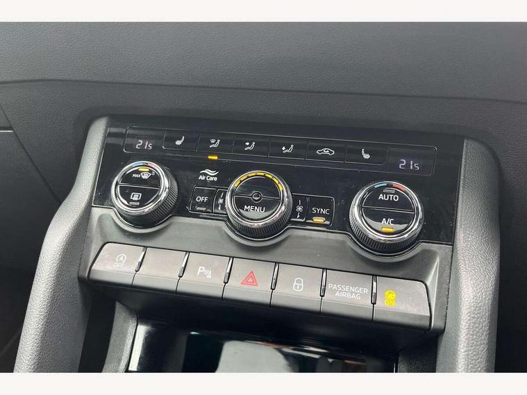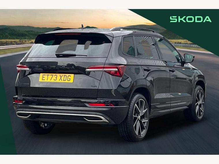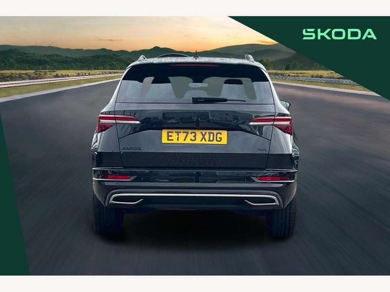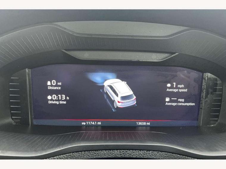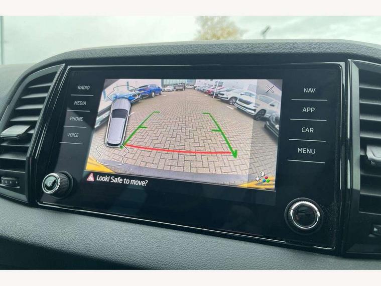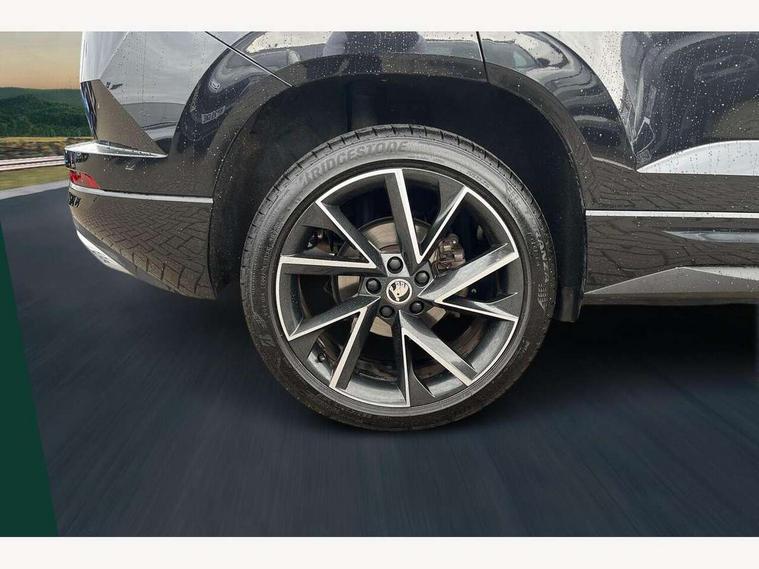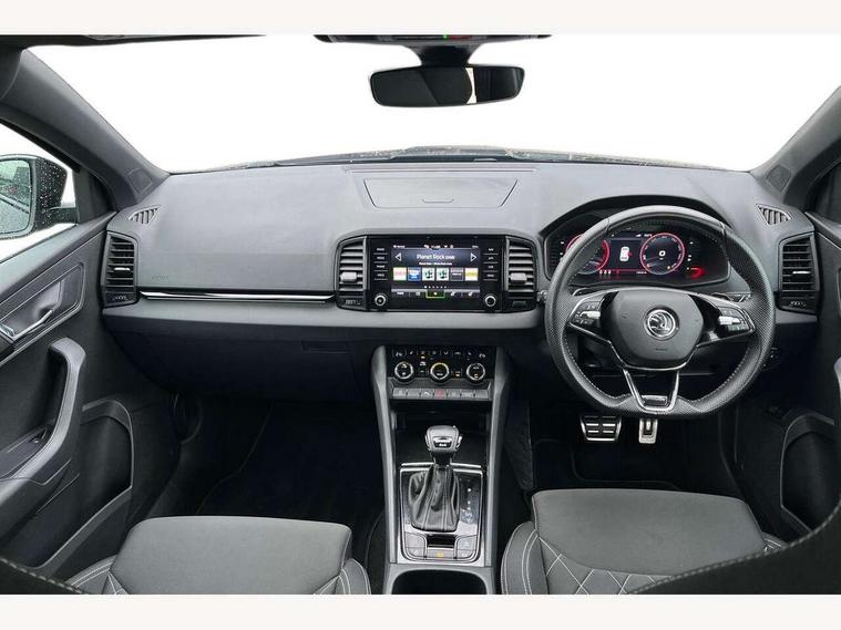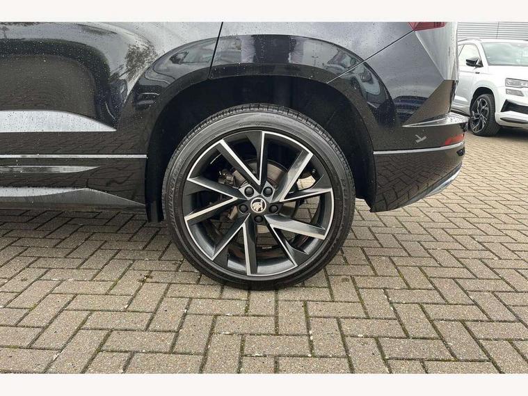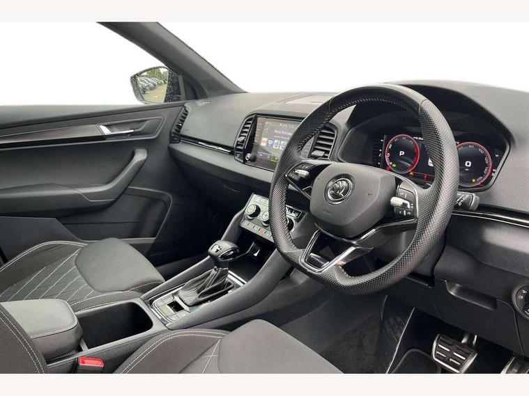 8" Digital display, Care connect, Driver fatigue sensor, Emergency services call system, Outside temperature gauge, Service interval indicator, SmartLink wireless for Apple and wired for Android, Start/stop system with regenerative braking, USB C Port x 2 in front centre console, Virtual cockpit, Virtual pedal with electrically operated boot door, Diesel particulate filter, 8 Speakers, DAB radio with Bluetooth, USB connection, Wireless charging without wireless aerial connection, Acoustic glass, Aero front windscreen wipers with intermittent function, Auto dimming rear view mirror with light and rain sensors, Black door mirrors, Black electric window control buttons, Black radiator grille, Black roof rails, Body colour door handles, Electric front and rear windows with child proof lock, Front door steps with SportLine logo, Heated rear windscreen, LED 3rd brake light, LED daytime running lights, LED rear lights with high functionality welcome effect and dynamic indicators, Light assistant (coming/leaving home/tunnel light), Panoramic sliding sunroof, Plastic scuff plates, Privacy glass, Protective door side sills in body colour, Rear diffuser, Rear side wing doors, Rear spoiler, Rear window wiper with washer system and intermittent control, Safety reflectors on front doors, Skoda lettering on tailgate in black, Sportline badge on front fender, Sportline decorative inserts with badging, Sports front and rear bumpers, 1.5 litre bottle holders in driver and front passenger door panels, 12V socket in boot, 12v socket in front centre armrest with storage compartment and rear air vents, 3 rear height adjustable headrests, 3 seat bench in 2nd row, 3 spoke leather sports multifunction steering wheel and silver stitching with gear shift paddles, 4 foldable roof handles with rear coat hooks, Black floor carpet, Black roof headlining, Chrome inner door handles, Double sided boot floor, Foldable hooks in the boot, Front head restraints, Height adjustable front three point seats belts with tensioners, Height/reach adjust steering wheel, Ice scraper, Illuminated glovebox, Illuminated luggage compartment, Interior noise suppression, Isofix child seat preparation outer rear, Manual lumbar support for front seats, Pen holder, Pollen filter, Rear boot cover, Rear reading lights, Rear seats fixed folding and divided 60:40, Rubbish bin door, Safety vest holder, Single front passenger seat, Storage box in upper central dashboard closed, Sunvisors with illuminated vanity mirrors, Textile floor mats, Ticket holder, Titan black interior ceiling, Welcome animation with sportline logo, Boot pack - Karoq, Light Pack - Karoq, Parking pack - Karoq, Automatic door unlocking in case of crash, Automatic fuel cut off in case of crash, Child locks on rear doors, Driver airbag, Electronic parking brake with auto hold function, Emergency rear braking signal, ESC including ABS, MSR, ASR, EDS, HBA, DSR, RBS, MKB and traction control, Front side airbags, Hill hold control, Knee airbags, Passenger airbag with switch-off function, Pedestrian monitor, Seatbelt reminder signalisation and pretensioner for all seats, Three point seatbelts rear, Two tone horn, Tyre pressure display, Tyre pressure monitor, Alarm with interior monitoring, back up horn and tilt sensor with safe function, Electronic engine immobiliser, Keyless entry and start/stop, Remote central locking with 2 remote folding keys, Black air vent surround, Black centre console, Satin black dashboard, Satin black door trim, 19" Sagitarius anthracite alloy wheels with matt black aero inserts, Anti-theft wheel bolts protection, Matt black aero hub caps, Tool kit,