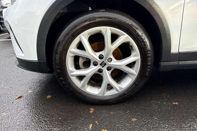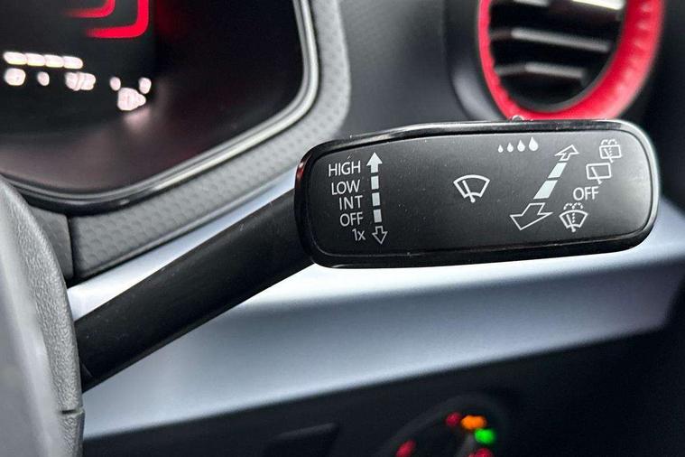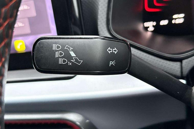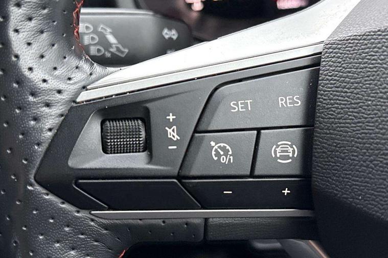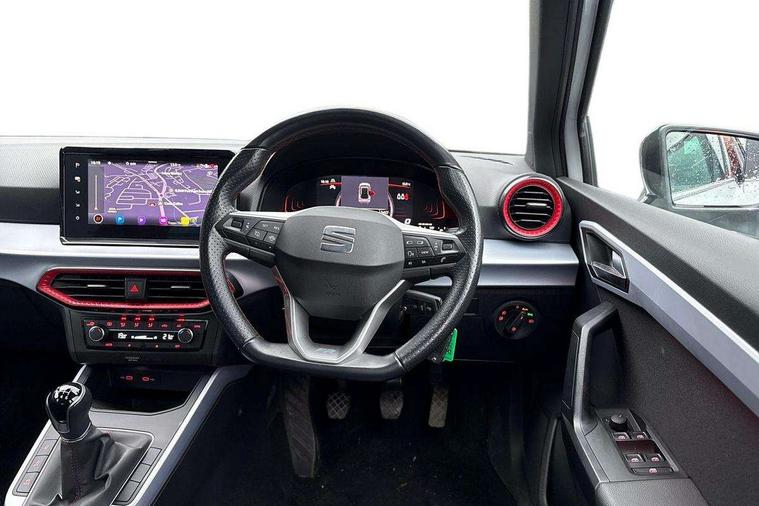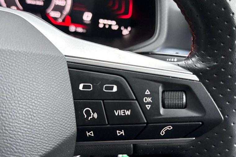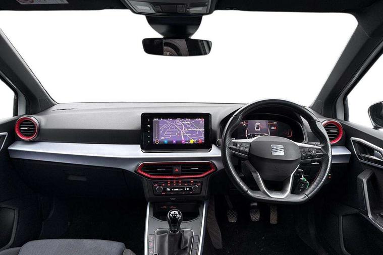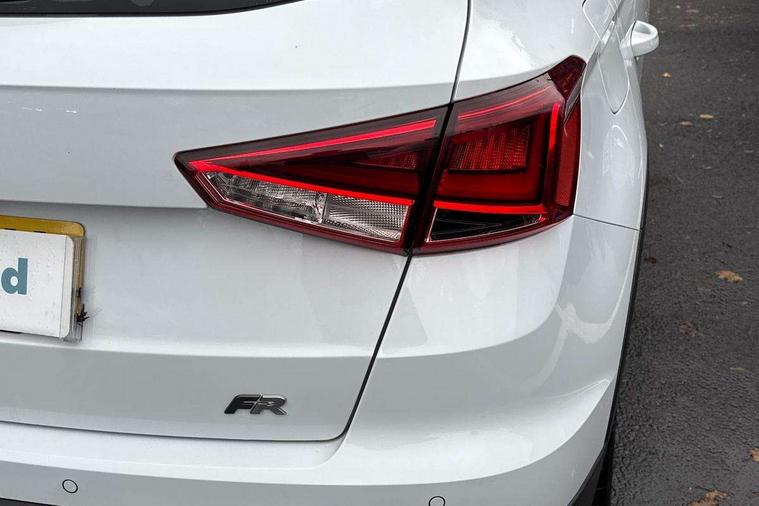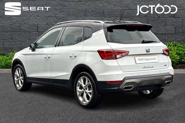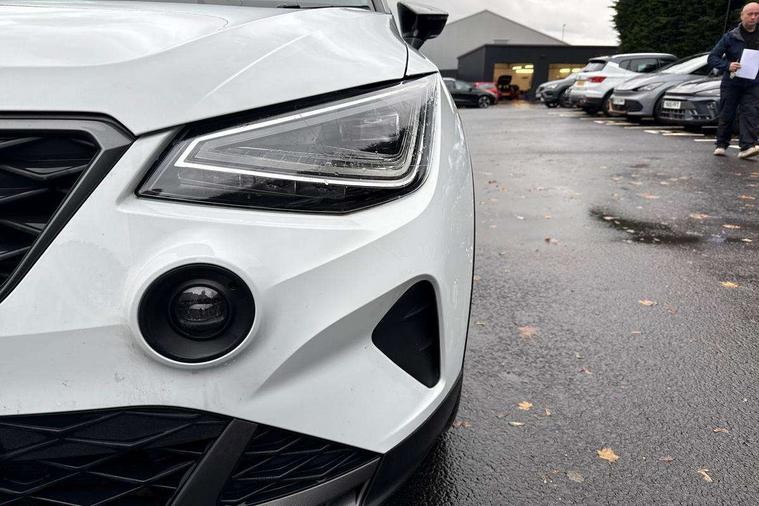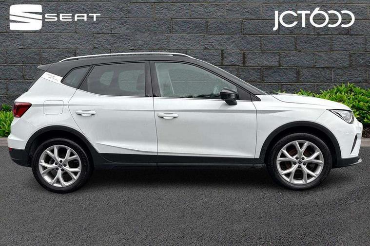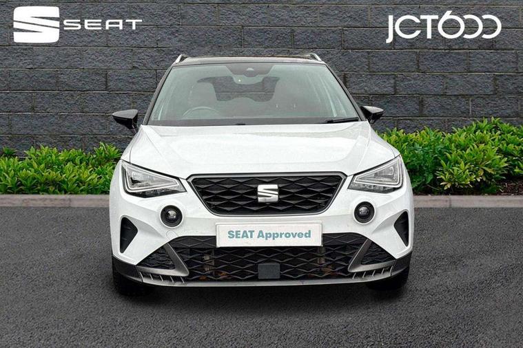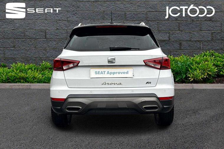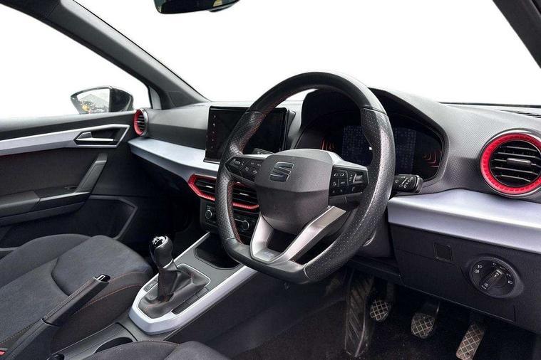 'Lights On' Reminder warning buzzer, 8" Digital cockpit, Digital clock, E-call, Electric speed sensitive power steering, Full Link Smartphone Integration with Mirror Link, Apple Car Play, Google Android Auto with USB Type C cable for Apple and Android compatibility, Lane keeping system, Low fuel warning light, Outside temperature display, Rear parking sensor, RPM counter, Seat connect with safety, service, remote and online, SEAT Drive profile - Four different models normal-sport-eco-individual, steering response, throttle response, Trip computer, Wireless phone charger, 9.2" colour touchscreen with navigation system, voice control and USB port (type c), Bluetooth interface for hands free and audio streaming, DAB digital radio and AM/FM radio, Steering wheel mounted audio controls, Anti theft roof antenna, Auto dimming interior rear view mirror, Automatic activation of hazard warning lights, Body coloured bumpers, Body coloured door handle inserts, Chrome roof rails and window surrounds, Dark tinted rear windows, Electric front/rear windows, Electrically adjustable, heated and folding door mirrors, Front fog lights with cornering function and rear fog light, FULL LED automatic headlights with dynamic headlight range control, coming and leaving home, LED daytime running lights, LED rear tail lights and licence plate lights, Protective side mouldings, Rain sensing wipers, Rear side wing doors, Rear spoiler, Rear window wash/wipe, Roof colour door mirrors, Third brake light, Twin exhaust pipe styling hidden exhaust pipe, Visible VIN plate, Windshield wiper with intermittent control and potentiometer, 2 cupholders, 3 seat bench in 2nd row, 60/40 split folding rear seat, Aircare filter, Black interior roof, Cloth upholstery, Double boot floor, Driver sunvisor with covered mirror + card holder, Dual zone climate control, Front courtesy light with front reading lights, Front sport seats, Gear shift indicator, Height adjustable front seats, Height/reach adjustable steering column, Illuminated boot, Instrument lighting with brightness control, Interior ambient lighting, Interior light in footwell, central console and door panel, ISOFIX points in outer rear seats with top tether anchorage points, Passenger sunvisor with vanity mirror, Perforated flat bottomed leather steering wheel/gear knob/handbrake with red stitching and FR logo, Single front passenger seat, Two front and three rear height adjustable headrests, Interior chrome pack - Arona, 3 point seatbelts on all rear seats, ABS, Active front headrests, Child locks on rear doors, Driver and front passenger airbags with front passenger airbag de activation, front side and curtain airbags, Electronic stability control, Emergency Brake Assist (EBA) and front assist, Front and rear seatbelt reminder, Hill hold control, Multi-Collision braking, Tiredness recognition system, Traction control, Tyre pressure monitoring system, Alarm with back-up horn, Electronic engine immobiliser, Locking wheel bolts, Remote central locking + deadlocks, Tow away protection, Titan black dashboard, 17" Dynamic alloy wheels,