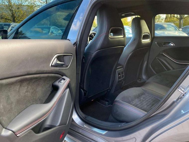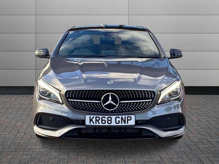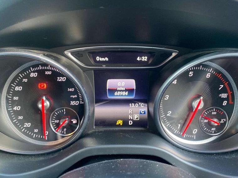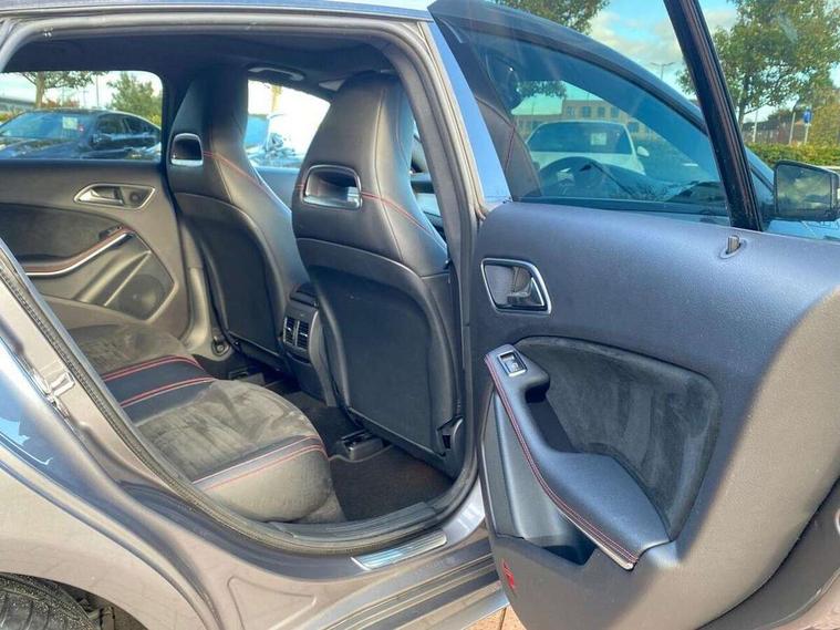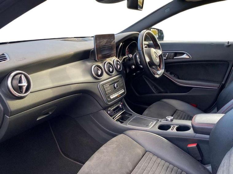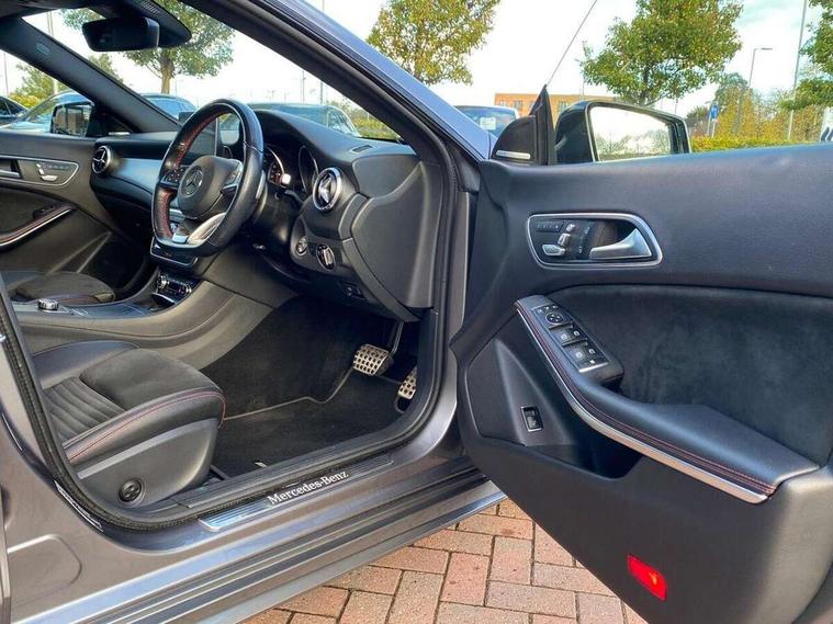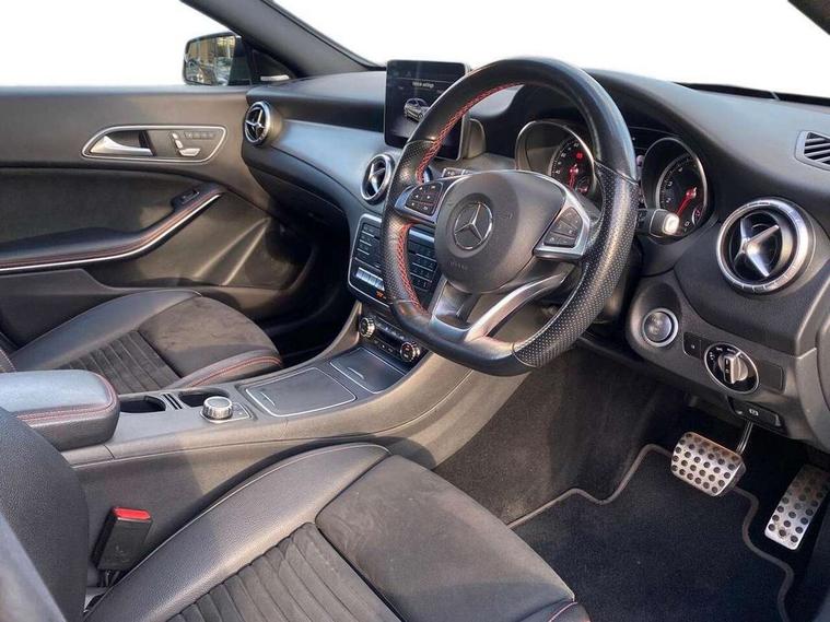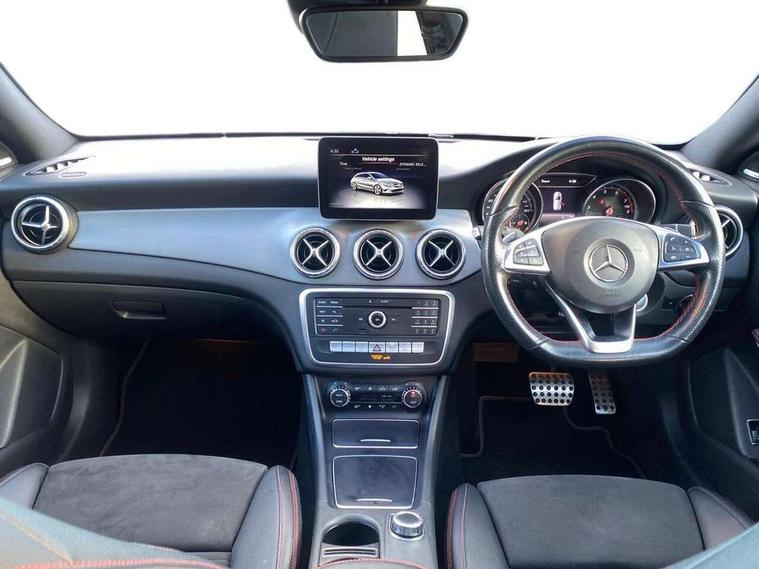 8" colour display screen, Active park assist, Attention assist, Bluetooth system, Direct steering, Door/boot open warning light, DYNAMIC SELECT with a choice of driving modes (ECO, Comfort, Sport, Sport+ and Individual), Easy-pack tailgate - Powered opening/closing automatically, Front and rear parking sensors, Low fluid warning light, Outside temperature gauge, Reversing camera, Service indicator (ASSYST), Trip computer, Lowered comfort suspension, Media interface, Mercedes Audio 20 radio/single CD, USB connection, Adaptive brake lights, AMG body styling, Automatic headlights, Automatic rain sensing wipers, Black high gloss beltline, Body colour bumpers, Body colour door handles, Body colour side skirt, Diamond grille with pins in chrome and single louvre in high-gloss black with chrome inserts, Electric adjustable heated door mirrors, Electric panoramic sliding sunroof, Front and rear electric windows, Heated rear window with timer, High gloss black door mirror housing, High level LED brake light, LED headlights with LED daytime running lights, LED Indicators, LED tail lights, Privacy glass, Rear fog lights, 1/3 to 2/3 split folding rear seats, 3 spoke flat bottom multi-function sports leather steering wheel in black with topstitching in red, Auto Mercedes-Benz child seat recognition sensor, Centre console with cupholders, Courtesy light in boot, Door sill illumination, Dual zone climate control, Electric memory seats, Front centre armrest with storage box, Front door courtesy lamps, Front footwell lights, Front head restraints, Front sports seats, Height adjustable front seats, Height/reach adjustable steering column, Illuminated glovebox, Illuminated storage compartment, Isofix rear child seat fastenings, Load securing rings in luggage compartment, Luggage compartment cover, Reading lights, Rear footwell lights, Rear head restraints, Sports pedals with rubber studs, Sunvisors with illuminated vanity mirrors, Mirror pack - CLA, 3x3 point rear seatbelts, ABS with Brake Assist, Active bonnet, Adaptive brake system, ASR, Brake pad warning light, Child lock for rear electric windows, Child proof door locks, Crash responsive emergency lighting, Drivers knee airbag, Dual stage driver/passenger airbags, Electronic parking brake, ESP curve dynamic assist, Front and rear seatbelt reminder, Front passenger airbag deactivation, Front passenger seat occupancy sensor, Front side airbags, Hill start assist, Tyre pressure monitoring system, Warning triangle and first aid kit, Window airbags, Anti theft alarm system, Chrome surround in electric key, Immobiliser, Keyless Start, Remote central locking, Chrome air vent surrounds, 18" AMG 10 spoke alloy wheels, Tirefit,