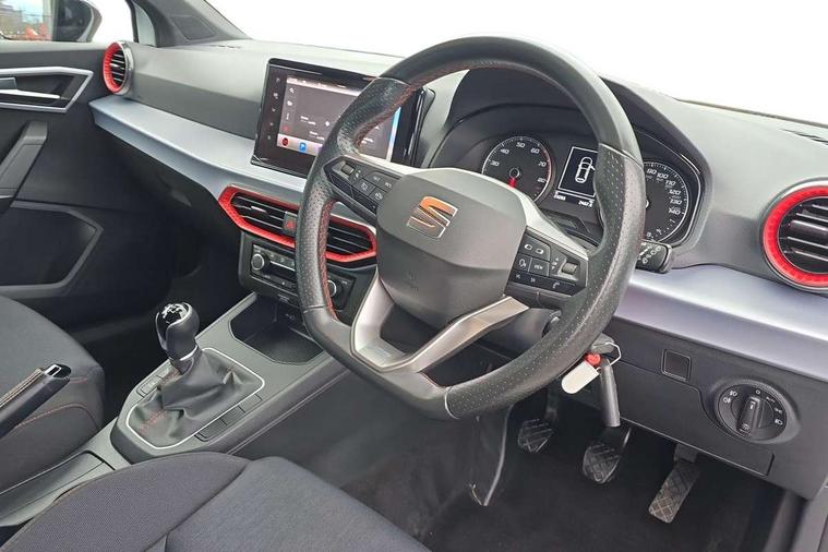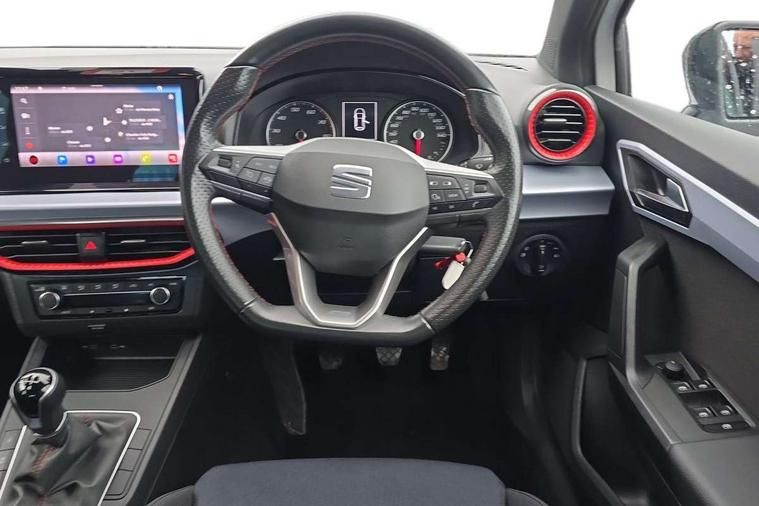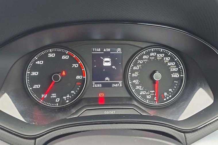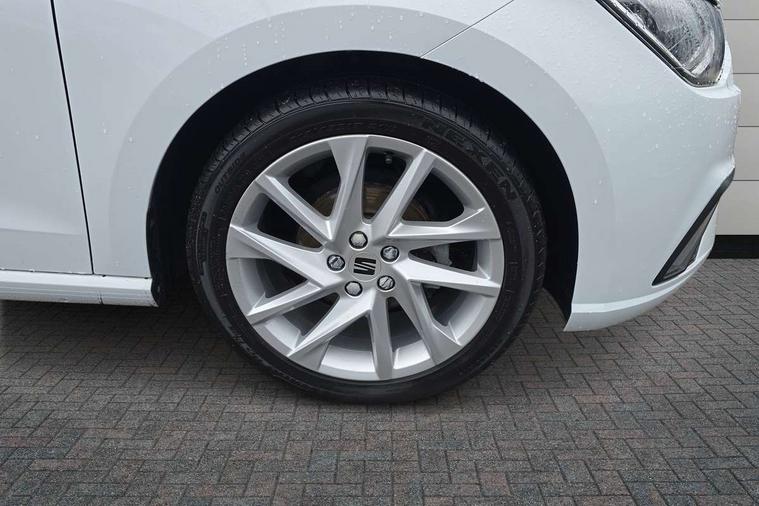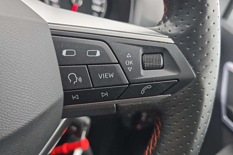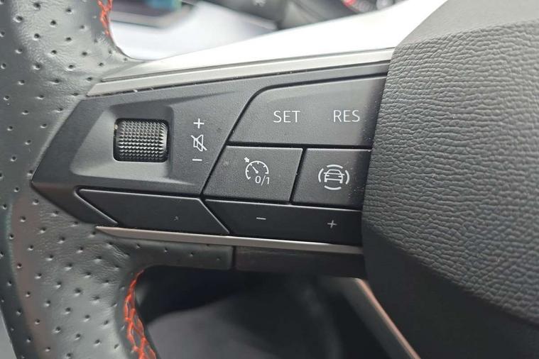 'Lights On' Reminder warning buzzer, 8" Digital cockpit, 9.2" touchscreen navigation system with type C USB socket, Voice control and DAB/AM/FM radio, Auto start and stop system, Bluetooth audio streaming with handsfree system, Digital clock, E-call, Full link smartphone integration with mirror link, wireless apple carplay, Google android auto + USB Type C cable for apple and android devices, Lane assist, Low fuel warning light, Outside temperature gauge, Power Steering, Seat connect with safety, service, remote and online, SEAT drive profiles and ECO function, SEAT logo boot release, Speed limiter, Trip computer, Sports suspension, Auxiliary input socket, Radio/MP3 player, SD card slot, Steering wheel mounted controls, Anti theft roof antenna, Auto dimming rear view mirror, Automatic rain sensing wipers, Black door mirrors, Body colour bumpers, Body colour door handles, Brilliant black window surrounds, Dark tinted rear windows, Electric adjustable/heated/folding door mirrors, Electric front windows, Electric headlight adjustment, Electric rear windows, Front/rear fog lights, FULL LED automatic headlights with dynamic headlight range control, coming and leaving home, LED daytime running lights, LED tail lights, Rear roof spoiler with FR twin exhausts, Rear side wing doors, Rear wiper, Third brake light, 3 seat bench in 2nd row, 60/40 split folding rear seat, Ambient interior lighting, Chrome detailing and black headlining, Cloth upholstery, Dual zone climate control with combination filter, Front courtesy lights, Front cupholders x 2, Front reading lights, Gear shift indicator, Glovebox, Height adjustable front and rear headrests (five), Height adjustable front seats, Height/reach adjust steering wheel, Illuminated air vent surrounds, Illuminated boot, Instrument lighting with brightness control, Isofix, Leather multifunction flat bottomed sports steering wheel, Passenger sunvisor, Single front passenger seat, Sports seats, Sunvisors with mirror and driver side card holder, 3 point seatbelts on all 3 rear seats, ABS, Active front headrests, Child locks on rear doors, Electronic stability control, Energy recovery system, Front assist forward collision warning and autonomous emergency braking, Front driver and passenger side airbags with curtain airbag and front passenger airbag deactivation, Hill hold control, Multi-Collision braking, Seat belt reminder for front and rear seats, Tiredness recognition system, Tyre pressure monitoring system, Electronic engine immobiliser, Locking wheel bolts, Perimeter alarm and interior monitoring with backup horn and tow away protection, Remote central locking + deadlocks, 17" Alloy wheels in Brilliant silver,