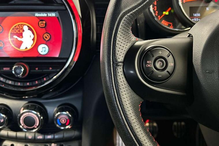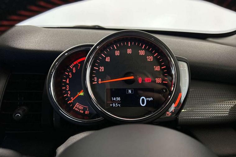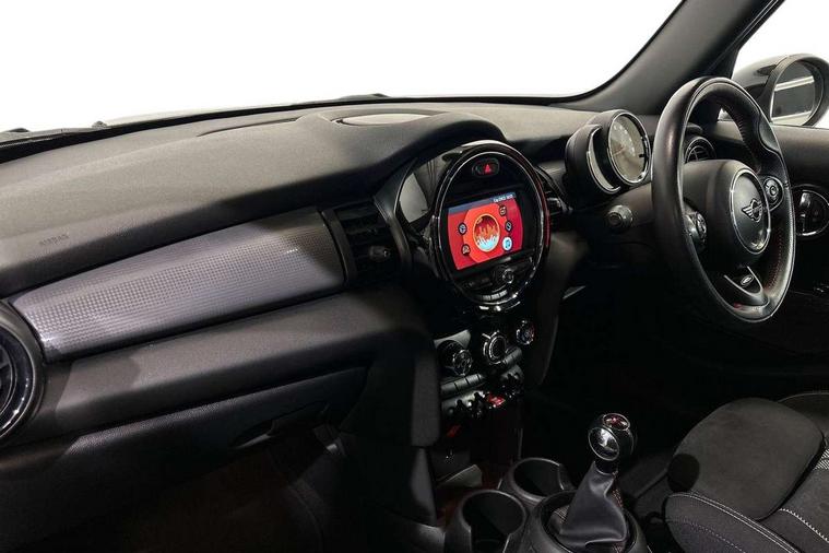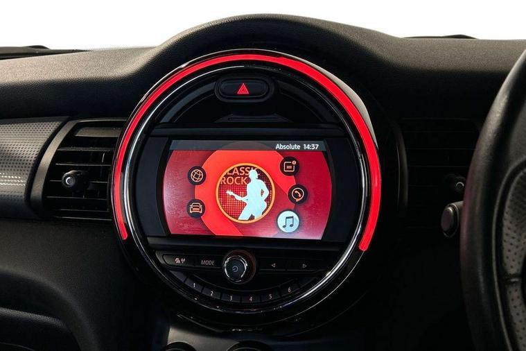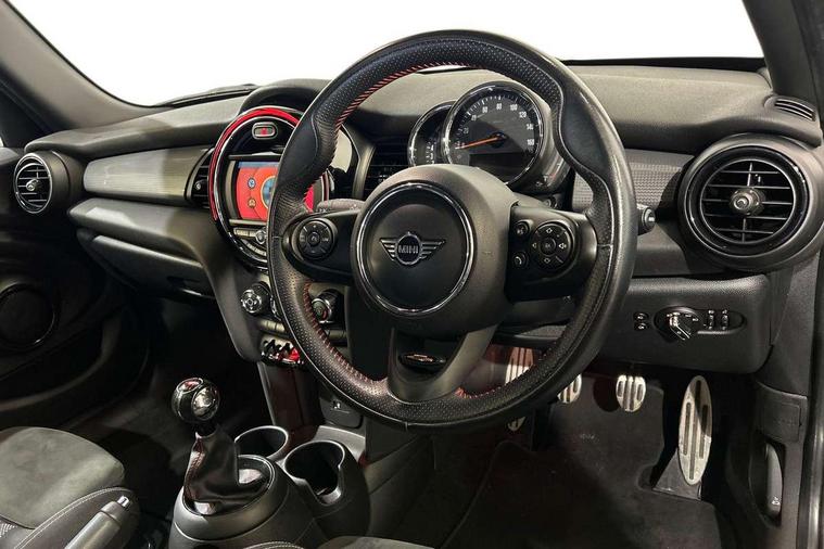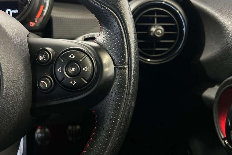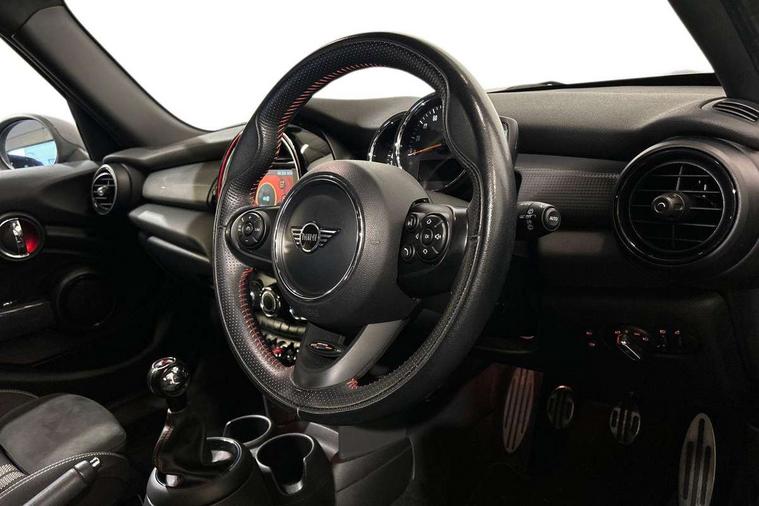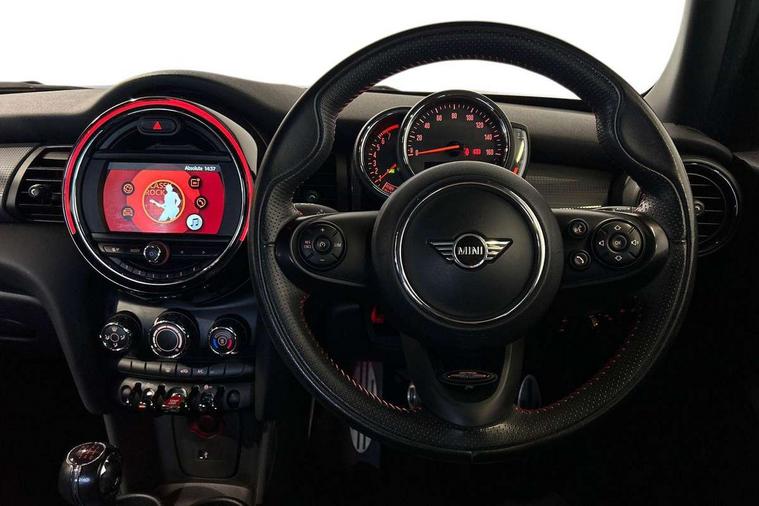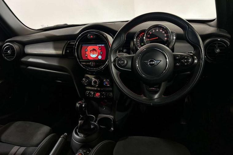 Compatible mobile phone bluetooth with audio streaming, Cruise control with brake assist, Instrument cluster, Mini E-call, MINI TeleServices, On board computer, Service interval indicator, Performance Control, 6.5" touchscreen with LED ring, FM tuner and DAB digital radio, Automatic headlight activation switch, Body colour fuel filler cap, Chrome border high gloss black slats radiator grille, Dynamic brake lights, Electric front+rear windows, Heated rear window, Heated windscreen washer jets, John Cooper Works - aerodynamic kit (front and rear apron, spoiler), front and rear sport bumpers and part-painted side sills with door sill finishers, John Cooper Works Logo, John Cooper Works rear spoiler, LED headlight with closed ring and daytime driving lights, Left exhaust tailpipe with chrome finisher, Metal door sill strips with MINI imprint, Model logo Cooper on right of tailgate, Rain sensor window wipers, Rear fog lights, Rear LED lights with union jack design, Rear window wiper, Side scuttle panel with integrated indicator, Sun/heat protection glass, White indicator lenses, 12V Accessory socket in centre console, 4 lashing eyes in luggage compartment, 60/40 split folding rear seat, Chrome interior highlights, Cupholders, Front and rear isofix with front passenger airbag deactivation, Glove compartment, Height and length steering column adjustment, Interior lighting with 12 basic colours selectable via toggle switch in roof, John Cooper Works leather steering wheel with contrasting stitching in Chilli Red with John Cooper Works logo, Leather gearshift lever and handbrake gaiters, Manual air conditioning, Mechanical seat adjustment, driver seat height adjust, forward/back and front seats backrest, Mini logo projection on floor from drivers exterior mirror, Multifunction steering wheel, Satellite grey headlining, Storage compartments in doors, Sunvisors with vanity mirrors, Tool kit, 3 point seatbelts on all five seats, 6 Airbags - front, side, head and seat belt tensioners, Anti-lock braking system (ABS), DSC - Dynamic Stability Control, Front and rear disc brakes, Hill start assist, Single tone fanfare horn, Tyre pressure monitoring system, Alarm system with tilt sensor, monitoring doors, bonnet interior and tailgate, Electronic vehicle immobiliser, Start/stop toggle with keyless go,