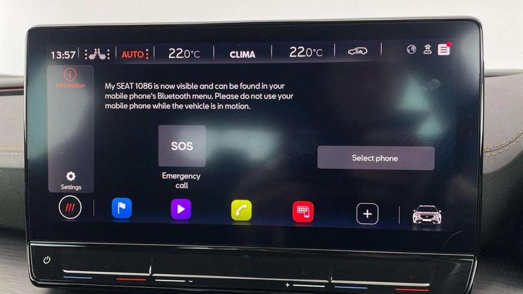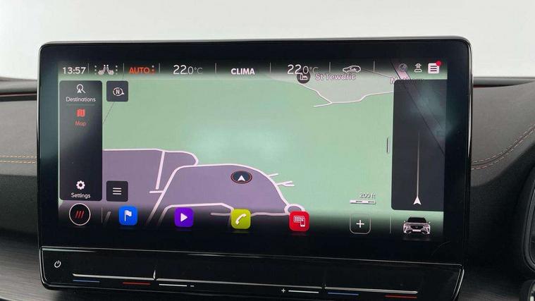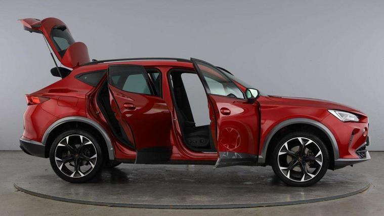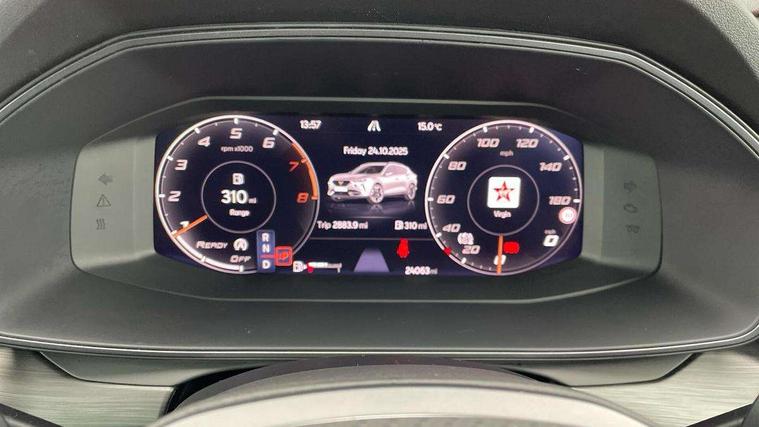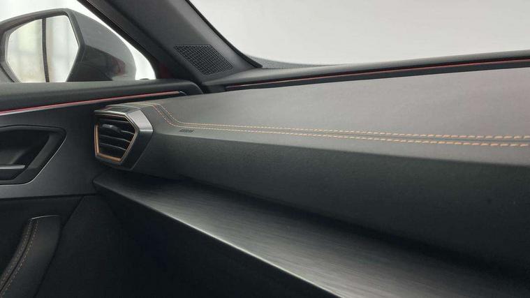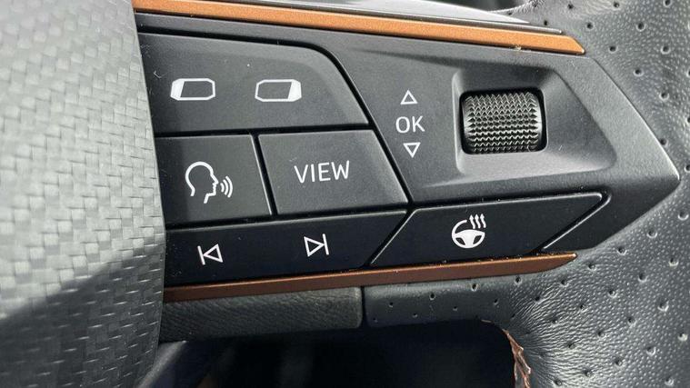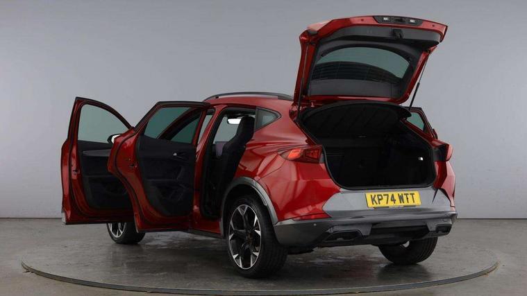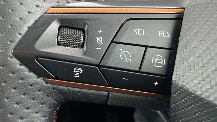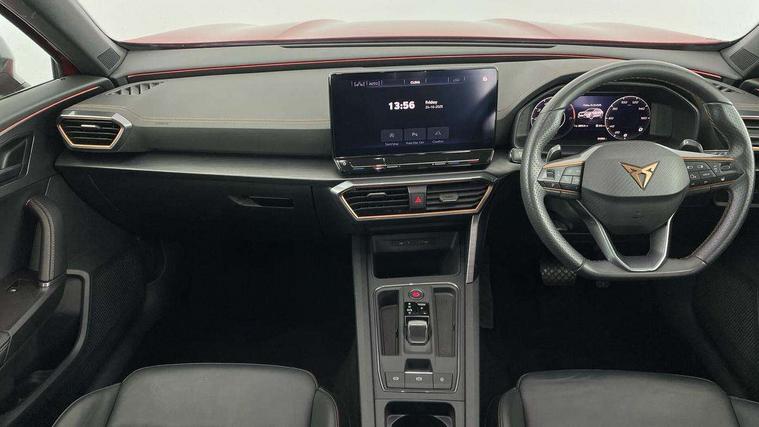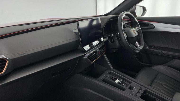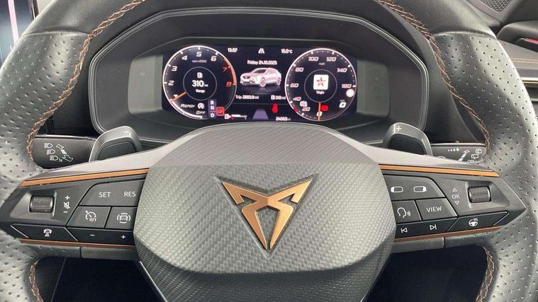 Digital cockpit and configurable dashboard, Driver alert system, Driving profile selection, Forward collision warning with automatic braking, Lane assist, Navigation system with 12'' Touchscreen Display, Park assist (inc front/rear parking sensors), PAS, Predictive adaptive cruise control with speed limiter, Rear view camera, RPM, trip computer, outside temp gauge, instrument light brightness, low fuel warning light, lights on reminder, gearshift indicator, Service interval indicator, Start/stop system with regenerative braking, Voice control system, Wired Android Auto, Wireless apple carplay, Wireless phone charger, Electronic locking differential and dynamic traction support, Standard suspension, 2 front and 2 rear USB type C sockets, Auxiliary input socket, DAB radio, Auto dimming rear view mirror, Body colour door handles, Body coloured bumpers, Dark grey wing mirror, Daytime running light with automatic headlight control and coming home feature, Dynamic headlight range control, Electric front/rear windows, Electrically adjustable heated and folding door mirrors with memory function, Front fog lamps with cornering function, Gloss black roof rails and window surrounds, LED Headlights, LED Taillights with dynamic indicator, Rain sensing wipers, Rear diffuser with black simulated exhaust pipes, Rear side wing doors, Rear wash/wipe, Third brake light, Tinted rear windows, Welcome lights, 12v power supply in centre console, 12V socket, 12v socket in loadspace, 2 front and 2 rear reading lights, 230V socket, 3 seat bench in 2nd row, 60/40 split rear bench seat with armrest and mechanical seat release, Black headlining, Dust/pollen filter, Front and rear head restraints, Front centre armrest, Height/reach adjust steering wheel, Illuminated interior front door sills, Illuminated sunvisor with mirror, Isofix, Leather multi function heated steering wheel with gear shift paddles, Luggage tie-down hooks, Single front passenger seat, Three zone climate control with control panel in rear, Variable luggage/load compartment floor, Wraparound lighting, Genuine Nappa leather Pack - Cupra, 3 point seatbelts on all rear seats, ABS, Brake control system - ESC and brake booster, Child proof door locks, Driver and front passenger airbags with front passenger airbag de-activation, Electronic parking brake, Front and rear disc brakes, Front side curtain airbags, Hill hold control, Public e-call, Seat belt reminder for front and rear seats, Tyre pressure monitoring system, Anti theft alarm system, Keyless entry and start system (KESSY), Locking wheel bolts, Copper and aluminium interior detailing, 19" 'Exclusive' machined sport matte black and silver alloy wheels,