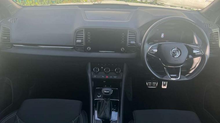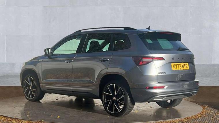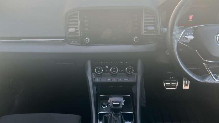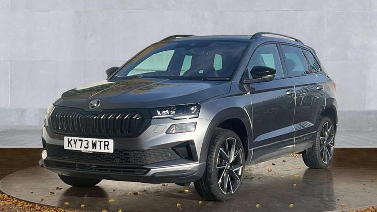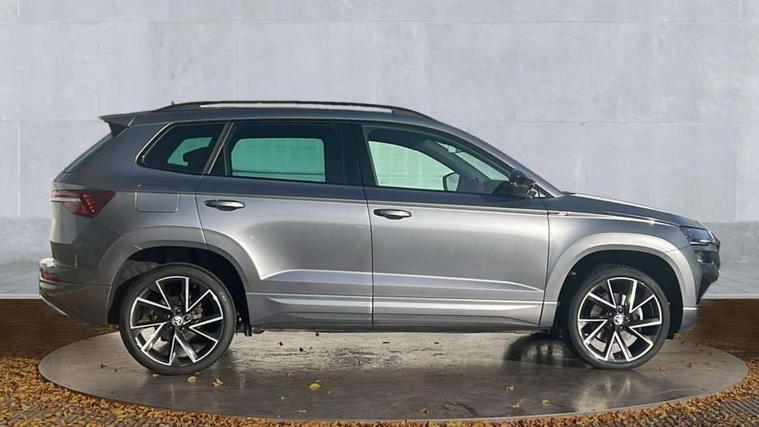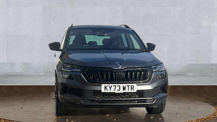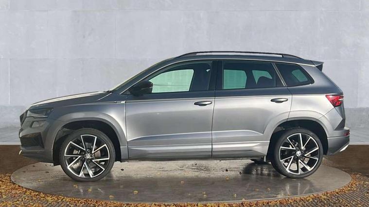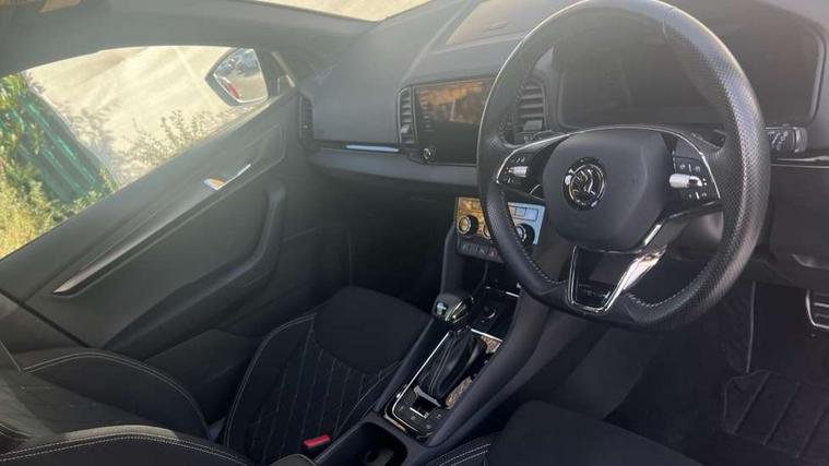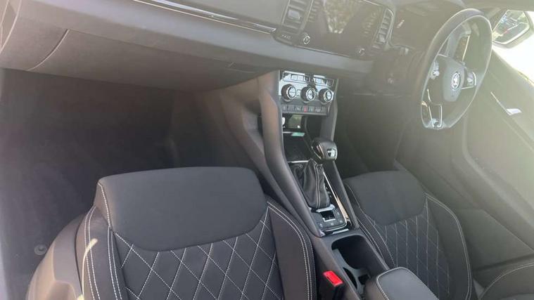 8" Digital display, Care connect, Driver fatigue sensor, Emergency services call system, Outside temperature gauge, Service interval indicator, SmartLink wireless for Apple and wired for Android, Start/stop system with regenerative braking, USB C Port x 2 in front centre console, Virtual cockpit, Virtual pedal with electrically operated boot door, 8 Speakers, DAB radio with Bluetooth, USB connection, Wireless charging without wireless aerial connection, Acoustic glass, Aero front windscreen wipers with intermittent function, Auto dimming rear view mirror with light and rain sensors, Black door mirrors, Black electric window control buttons, Black radiator grille, Black roof rails, Body colour door handles, Electric front and rear windows with child proof lock, Front door steps with SportLine logo, Heated rear windscreen, LED daytime running lights, LED rear lights with high functionality welcome effect and dynamic indicators, Light assistant (coming/leaving home/tunnel light), Panoramic sliding sunroof, Plastic scuff plates, Privacy glass, Protective door side sills in body colour, Rear diffuser, Rear side wing doors, Rear spoiler, Rear window wiper with washer system and intermittent control, Safety reflectors on front doors, Skoda lettering on tailgate in black, Sportline badge on front fender, Sportline decorative inserts with badging, Sports front and rear bumpers, 1.5 litre bottle holders in driver and front passenger door panels, 12V socket in boot, 12v socket in front centre armrest with storage compartment and rear air vents, 3 rear height adjustable headrests, 3 seat bench in 2nd row, 3 spoke leather sports multifunction steering wheel and silver stitching with gear shift paddles, 4 foldable roof handles with rear coat hooks, Black floor carpet, Black roof headlining, Chrome inner door handles, Double sided boot floor, Foldable hooks in the boot, Front head restraints, Height adjustable front three point seats belts with tensioners, Height/reach adjust steering wheel, Ice scraper, Illuminated glovebox, Illuminated luggage compartment, Isofix child seat preparation outer rear, Manual lumbar support for front seats, Pen holder, Pollen filter, Rear boot cover, Rear reading lights, Rear seats fixed folding and divided 60:40, Rubbish bin door, Safety vest holder, Single front passenger seat, Storage box in upper central dashboard closed, Sunvisors with illuminated vanity mirrors, Textile floor mats, Ticket holder, Titan black interior ceiling, Welcome animation with sportline logo, Boot pack - Karoq, Light Pack - Karoq, Parking pack - Karoq, Automatic door unlocking in case of crash, Automatic fuel cut off in case of crash, Child locks on rear doors, Driver airbag, Electronic parking brake with auto hold function, Emergency rear braking signal, ESC including ABS, MSR, ASR, EDS, HBA, DSR, RBS, MKB and traction control, Front side airbags, Hill hold control, Knee airbags, Passenger airbag with switch-off function, Pedestrian monitor, Seatbelt reminder signalisation and pretensioner for all seats, Three point seatbelts rear, Two tone horn, Tyre pressure display, Tyre pressure monitor, Alarm with interior monitoring, back up horn and tilt sensor with safe function, Electronic engine immobiliser, Keyless entry and start/stop, Remote central locking with 2 remote folding keys, Black air vent surround, Black centre console, Satin black dashboard, Satin black door trim, 19" Sagitarius anthracite alloy wheels with matt black aero inserts, Anti-theft wheel bolts protection, Matt black aero hub caps, Tool kit,