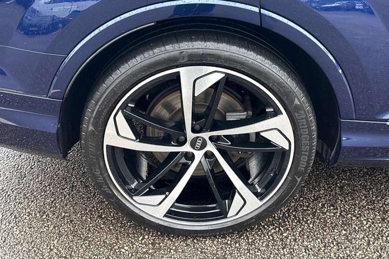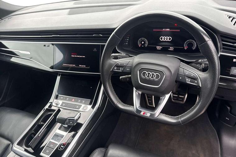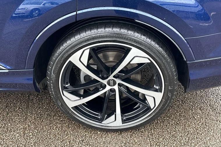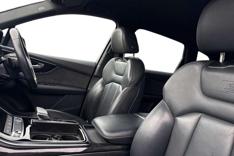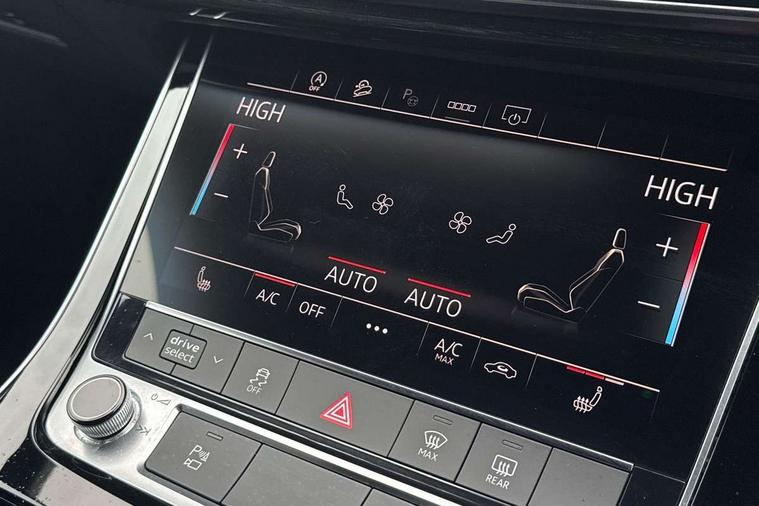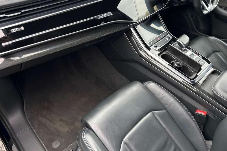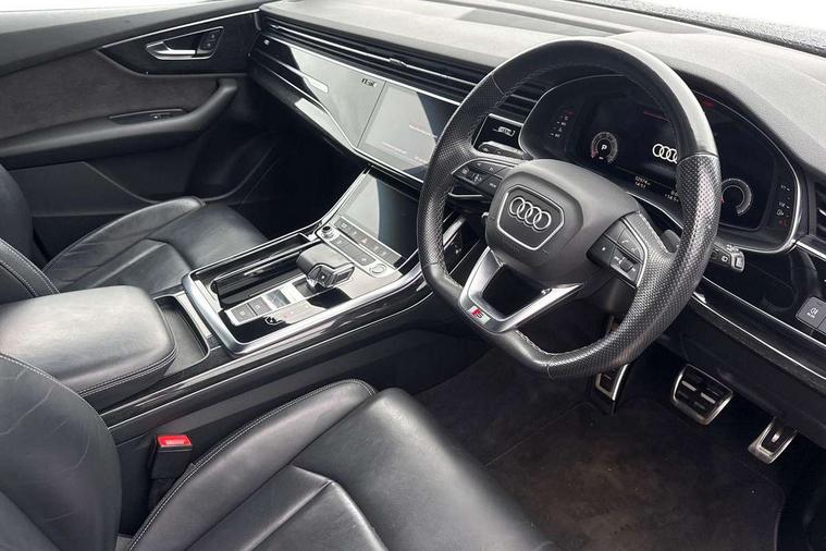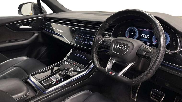 Audi connect safety and service (e-call), Audi connect with Amazon Alexa Integration, Audi drive select (Auto, Comfort, Dynamic, Efficiency, Individual, Off-road and All road), Bluetooth interface, Camera based traffic sign recognition, Electromechanical steering, MMI navigation plus with MMI touch screens includes 10.1" and 8.6" screens with haptic feedback, Natural voice recognition, Parking system plus with 360 degree display (front, rear and side sensors) - acoustic and visual park assist system, Power operated tailgate, Rear view camera, Smartphone interface includes wireless Apple carplay/Android Auto, Start/stop system, 48V Mild hybrid technology, Adaptive air sports suspension, Quattro all wheel drive with self locking centre differential, Audi music interface - front 2 USB-C ports with charger and data functions, Audi sound system with 6 channel amplifier, 180 watt amplifying capacity and 10 loudspeakers including subwoofer, DAB digital radio module, Audi matrix LED headlights with dynamic front and rear indicators, Auto dimming frameless rear view mirror, Black roof rails, Bumpers in contrast paint scandium grey finish includes door trim and wheel arch trim strips, inlays in door strip contain quattro embossing, Electrically adj heated/folding + automatically dimming exterior mirrors with memory + automatic kerb side function for passenger side exterior mirror, Heat insulating glass in windshield, Integrated LED indications in door mirrors, LED daytime running lights, LED rear tail lights, Privacy glass - dark tinted rear and rear side windows from B-pillar backwards, 4 zone deluxe automatic climate control, 7 seat layout with ISOFIX points for the front passenger seat and rear passenger seat, Black cloth headlining, Comfort front centre armrest, Electric adjustable front seat with 4 way lumbar support, driver memory functionality, Folding rear seats, Front head restraints, Front/rear floor mats, Heated front seats, Illuminated door sill trims with S logo, LED interior ambient lighting, Luggage compartment cover, Luggage compartment sill protection in stainless steel, Rear head restraints, Stainless steel pedals, Sunvisors with illuminated vanity mirrors, Titanium black styling pack - Q7/SQ7, 3 point seatbelts on all rear seats, Audi pre sense front, Driver and front passenger, front side and curtain airbags, Electromechanical parking brake, Electronic Stabilisation Control (ESC) including ABS, ASR and EDL, Extended pedestrian protection measures, Hill hold assist, Seatbelt monitoring, Tyre pressure loss indicator, Warning triangle and first aid kit, Anti theft alarm, Anti-theft wheel bolts and wheel loosening detection, Keyless Go, Remote central locking, Polished oak trim with grey finish inlay, Tool kit, Tyre repair kit,