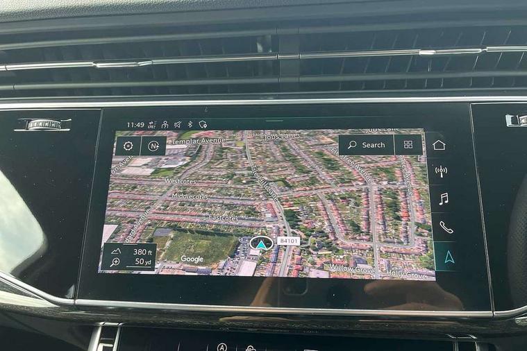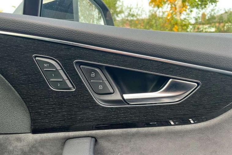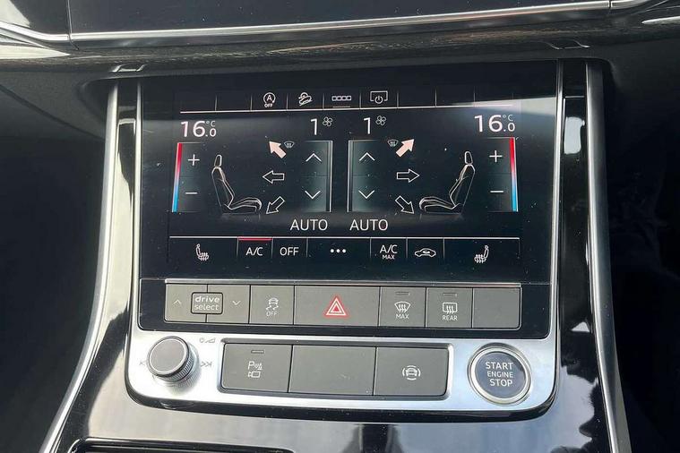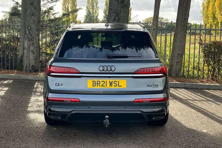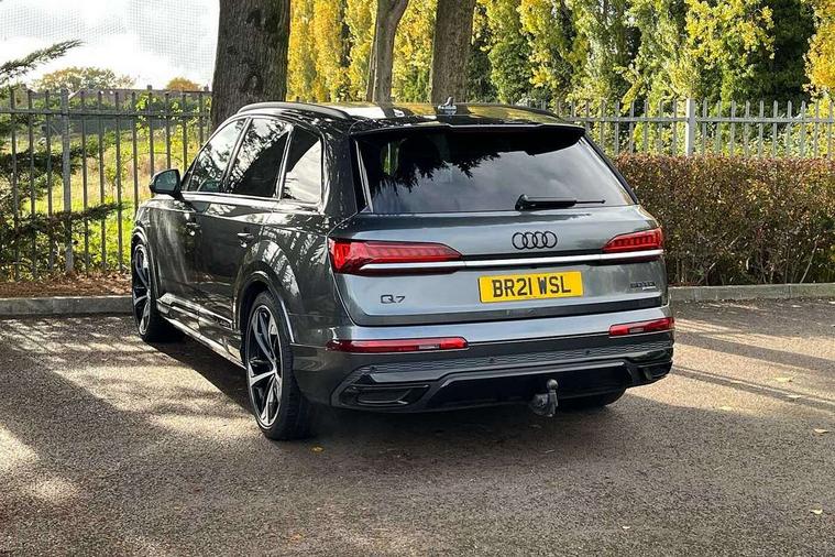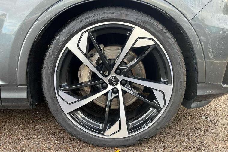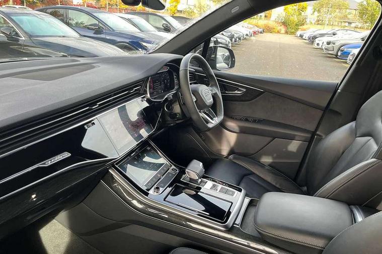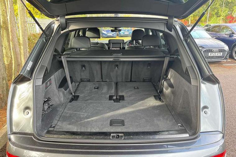 Audi connect safety and service (e-call), Audi drive select (Auto, Comfort, Dynamic, Efficiency, Individual, Off-road and All road), Audi phone box with wireless charging, Camera based traffic sign recognition, Electromechanical steering, MMI navigation plus with MMI touch screens includes 10.1" and 8.6" screens with haptic feedback, Natural voice recognition, Parking system plus - front + rear sensors, Power operated tailgate, Rear view camera, Smartphone interface includes wireless Apple carplay/Android Auto, Start/stop system, 48V Mild hybrid technology, Adaptive air sports suspension, Quattro all wheel drive with self locking centre differential, Audi music interface - front 2 USB-C ports with charger and data functions, Audi sound system with 6 channel amplifier, 180 watt amplifying capacity and 10 loudspeakers including subwoofer, DAB digital radio module, Audi matrix LED headlights with dynamic front and rear indicators, Auto dimming frameless rear view mirror, Black roof rails, Bumpers in contrast paint scandium grey finish includes door trim and wheel arch trim strips, inlays in door strip contain quattro embossing, Electrically adj heated/folding + automatically dimming exterior mirrors with memory + automatic kerb side function for passenger side exterior mirror, Heat insulating glass in windshield, Integrated LED indications in door mirrors, LED daytime running lights, LED rear tail lights, Privacy glass - dark tinted rear and rear side windows from B-pillar backwards, 4 zone deluxe automatic climate control, 7 seat layout with ISOFIX points for the front passenger seat and rear passenger seat, Black cloth headlining, Comfort front centre armrest, Folding rear seats, Front head restraints, Front/rear floor mats, Heated front seats, LED interior ambient lighting, Luggage compartment cover, Luggage compartment sill protection in stainless steel, Rear head restraints, Stainless steel pedals, Sunvisors with illuminated vanity mirrors, Titanium black styling pack - Q7/SQ7, 3 point seatbelts on all rear seats, Audi pre sense front, Driver and front passenger, front side and curtain airbags, Electromechanical parking brake, Electronic Stabilisation Control (ESC) including ABS, ASR and EDL, Extended pedestrian protection measures, Hill hold assist, Seatbelt monitoring, Tyre pressure loss indicator, Warning triangle and first aid kit, Anti theft alarm, Anti-theft wheel bolts and wheel loosening detection, Keyless go with remote central locking, Polished oak trim with grey finish inlay, Tool kit, Tyre repair kit,