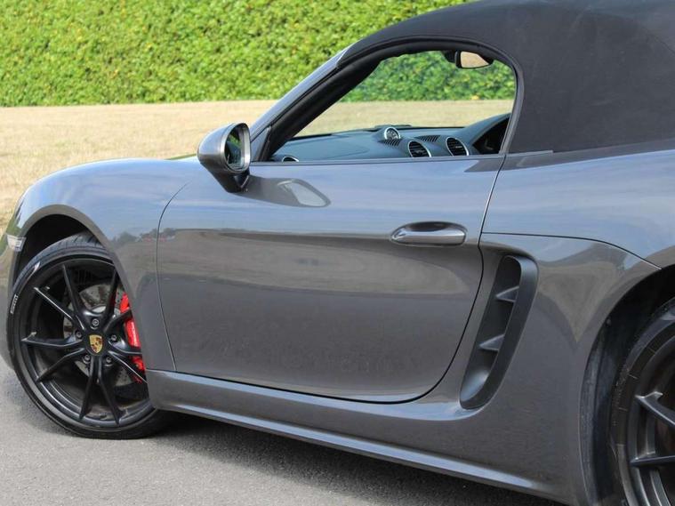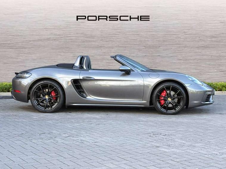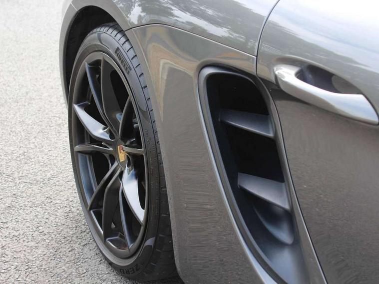 Auto start and stop system, Digital displays for vehicle speed, chosen gear, odometer, trip odometer and clock, eCall emergency call system, Instrument cluster with central rev counter and high-resolution 4.6 inch colour display, Porsche Communication Management (PCM) including online navigation module, mobile phone preparation, audio interfaces and voice control system, 3-way catalytic converters and on-board diagnostics for monitoring emission control system and coated particulate filter, 4 valves per cylinder, 64 litre fuel tank, Aluminium block and cylinder heads, Direct fuel injection (DFI), Gasoline particulate filter, Integrated dry-sump lubrication with an on-demand oil pump, Porsche Doppelkupplung (PDK), Porsche Stability Management (PSM) with ABS, advanced brake functions, Rear wheel drive, Turbocharger with variable turbine geometry (VTG) and intercooler, Two seater vehicle with mid mounted engine, VarioCam Plus variable valve timing and switchable valve lift, Water cooled with thermal management, DAB Digital radio, Integrated 4G/LTE compatible SIM including data for the Porsche Connect Services, Integrated compatible SIM including Porsche Connect Services, Navigation incl porsche + Apple Carplay, connect module, wireless internet access, carfinder, remote vehicle status, remote service and vehicle track, Wifi and music streaming, Auto deploying rear wing, Automatic headlight activation including welcome home lighting, Automatically extending rear boot spoiler, Body colour bumpers, Body colour door handles, Electrically adjustable heated exterior mirrors on door waist rails, aspherical on driver's side, Fully automatic fabric hood, electrically operated/heatable rigid glass rear screen, operable approx 31 mph and convenient operation by key remote, Green tinted heat insulating glass, Grey top tinted windscreen, Heated rear windscreen, Intelligent lightweight body in Aluminium/Steel composite construction, LED 3rd brake light, Net wind deflector, Power windows with one touch operation and door seal protection, Rain sensor, Rear boot, Separate auxiliary lights in the front end with LED indicators and position lights, Twin tract sports exhaust system with central twin tailpipe in stainless steel, Windscreen washer system with two wiper speeds and washer jets, 12V sockets in passenger footwell and centre console storage compartment, 718 logo on gear lever, Additional smooth finish leather with door panel armrest and centre console main storage compartment, Adjustable fan with air recirculation and defroster functions, Ascending centre console with uncovered storage compartment and closed storage compartment, Clothes hooks on front seat backrests, Footwell illumination, Front and rear luggage compartments, Front headrests, Heated seats, Hood lining in black fabric, LED reading lights, orientation, ignition lock, additionally luggage compartment and glove compartment lighting, Lockable glovebox, Seat centres in race tex, side bolsters and headrests in leather, Single front passenger seat, Smooth finish leather on steering wheel rim, gear lever and door handles, SPORT button to activate dynamic driving settings for engine, transmission (with PDK), Storage compartments in each doors, Two individual cup holders (Passenger side, integrated into dashboard trim strip), 3 point automatic seatbelts, ASR, Electrically controlled parking brake, Front and rear 4 piston aluminium monobloc fixed calipers, discs internally vented and cross drilled, front/rear disc diameter, brake calipers in red, Front and rear lightweight spring strut axle, Front seatbelt pretensioners + load limiters, Full size driver and passenger airbags, Passenger airbag deactivate switch, Porsche side impact protection doors with thorax airbag in outer backrest side bolster and head airbag for driver/passenger in door panel, Tyre pressure monitoring system, Alarm system with interior surveillance, Anti-theft wheel bolts, Dashcam prep, Engine immobiliser with in key transponder, central locking and remote control, Tyre repair kit,