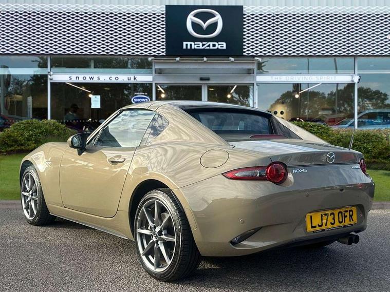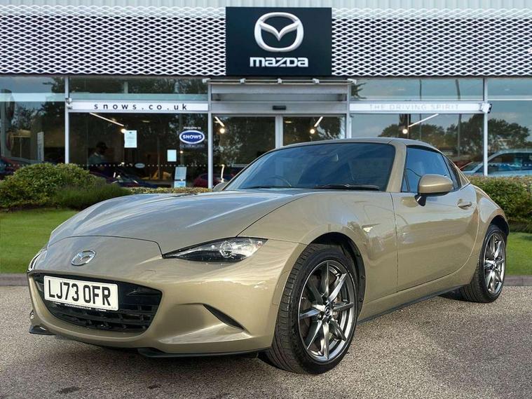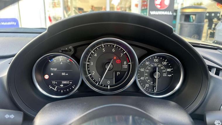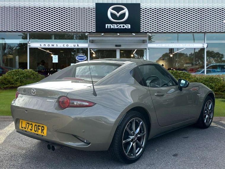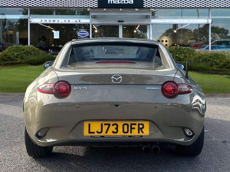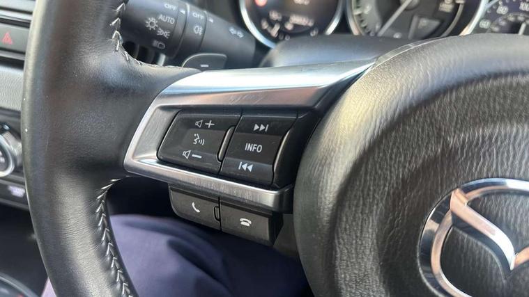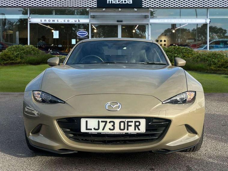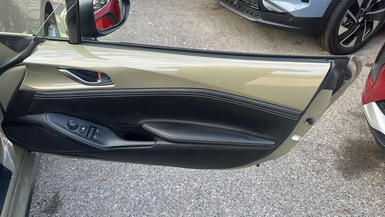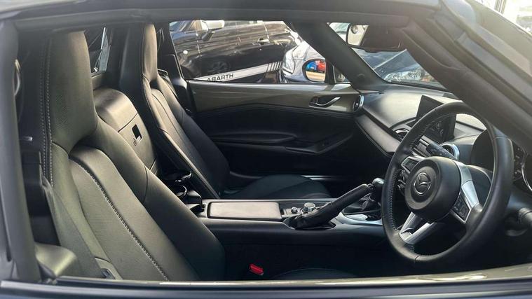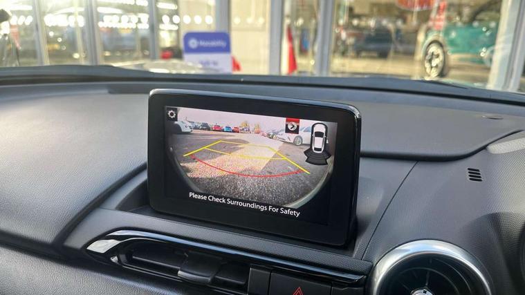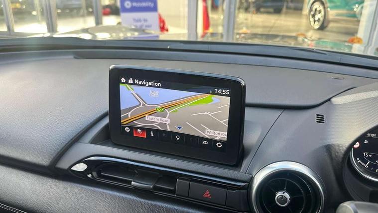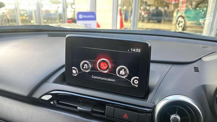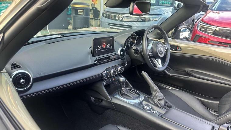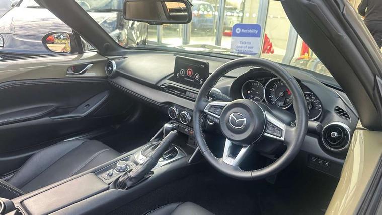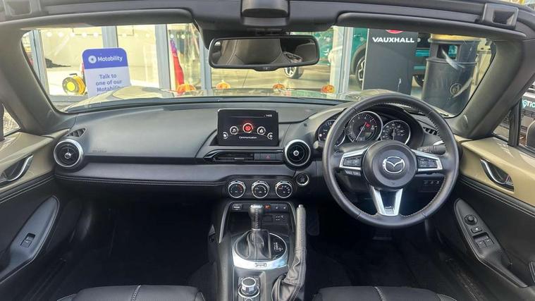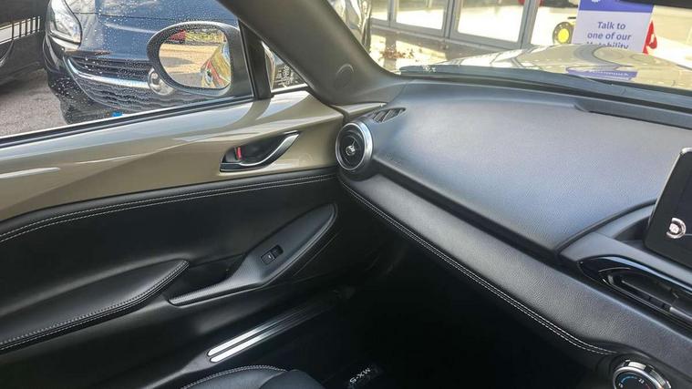 7" colour touch screen with Mazda connect infotainment, Aha and stitcher app, Analogue speedometer, Apple car play/Android Auto, Cruise control + speed limiter, Drive selection switch, Driver alert system, eCall emergency call system, Emergency stop signalling system, Engine start/stop button, Hands free phone preparation, Integrated bluetooth with hands-free calling, bluetooth audio and easy access to phone contacts, Integrated navigation system, Kinematic posture control, Lane departure warning system, Multi dot display tachometer and electric odometer, PAS, Rear parking sensor, Reversing camera, Service indicator, Traffic sign recognition, Trip computer, Water temperature gauge, Dynamic stability control, I-ELOOP, i-stop, 2 USB/aux input socket, Multimedia Commander including separate volume dial, Premium Bose sound system with 9 speakers with 2 in each front headrest, AM/FM/DAB radio and MP3, Steering wheel mounted audio/bluetooth controls, Adaptive LED Headlights, Auto dimming rear view mirror, Automatic headlamp levelling, Black scuff plates with stainless steel insert, Body colour bumpers, Body colour co ordinated interior upper door trim, Body coloured electric/heated door mirrors, Coming/leaving home lighting function, Dual exhaust pipes, Dusk sensitive headlamps, Electric front windows/one touch facility, Electrically operated retractable hard top with heated rear glass window, Exterior body colour co ordinated upper door panel trim with black vinyl and silver stitching, Front intermittent wipers, LED 3rd brake light, LED daytime running lights, LED indicator lights, LED rear lights, Piano Black fashion bars, Rain sensing front wipers, Rear boot, 12V socket, Centre console storage box, Chrome Air conditioning dials, Climate control air conditioning, Coin Box, Driver and front passenger sunvisors with covered vanity mirror and driver ticket holder, Driver seat manual slide, recline and tilt adjustment, Front centre armrest, Front head restraints, Gear shift indicator, Heated front seats, in 3 heat levels, Interior courtesy light, ISOFIX front passenger seat child seat compliance, Leather gear knob, Leather handbrake lever, Leather steering wheel, Lockable rear centre box with lid, Passenger seat + manual slide/recline adjust, Perforated leather upholstery, Single front passenger seat, Tilt/telescopic steering column, Transparent windblocker, Two cupholders, 3 point ELR front seatbelts with pretensioners, ABS+Electronic Brake force Distribution, Deployable Hood System (DHS), Driver and front passenger airbags, Driver and passenger seatbelt reminder audible warning, Hill hold assist, Passenger airbag deactivate switch, SCBS - Smart City Brake Support, rear plus front with autonomous emergency braking, Side airbags, Traction control, Tyre pressure monitor, Remote central locking with deadlocking and remote boot release, Smart keyless entry, Superlocking, Thatcham category 1 alarm + immobiliser, Chrome air vent surrounds, Dashboard panel - Black Vinyl, 17" Bright Silver alloy wheels, Tyre puncture repair kit,