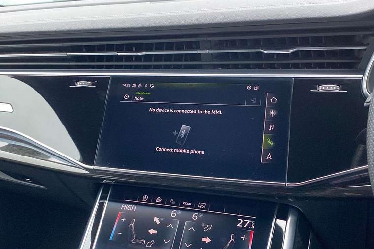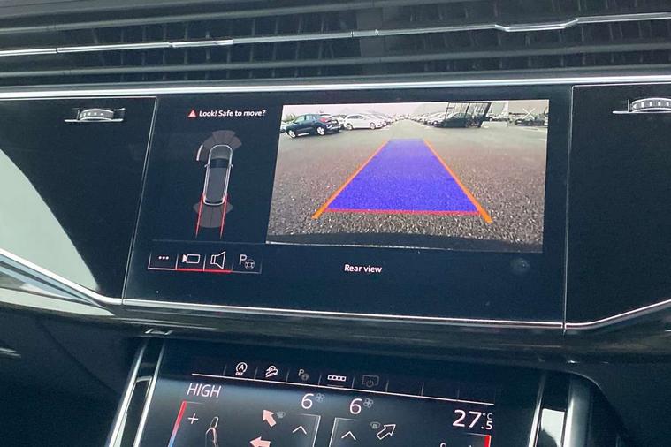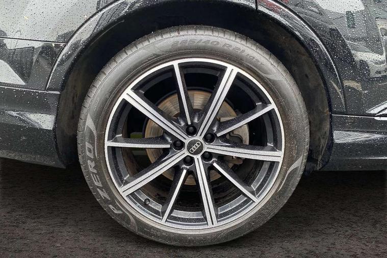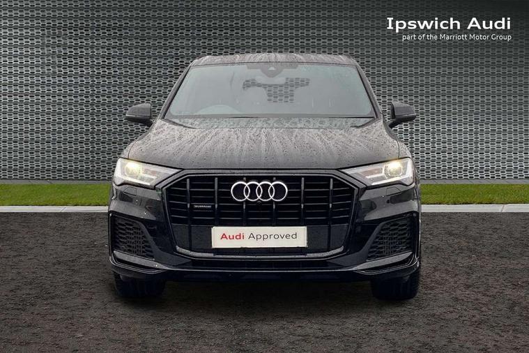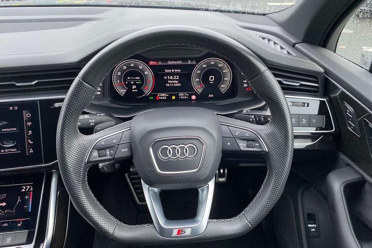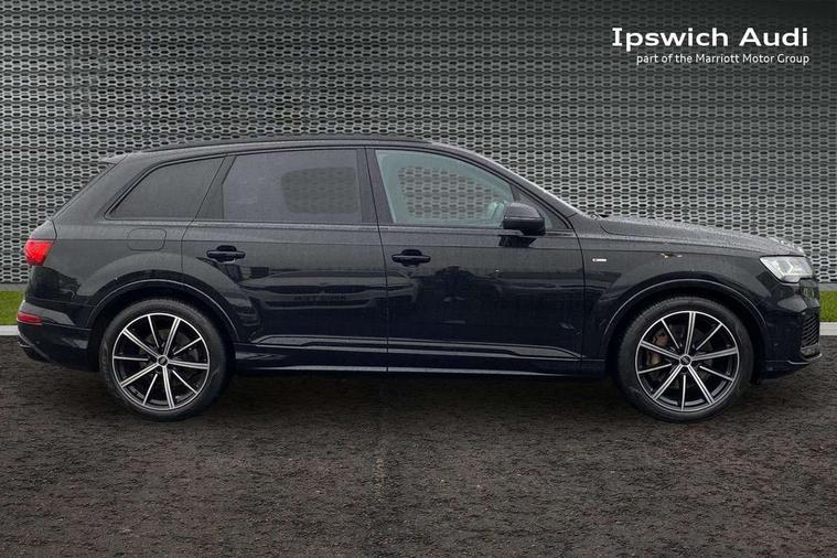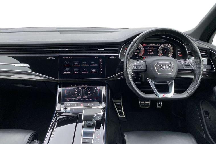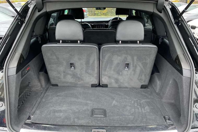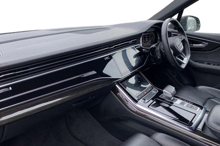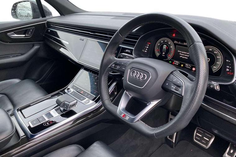 Audi connect safety and service (e-call), Audi connect with Amazon Alexa Integration, Audi drive select (Auto, Comfort, Dynamic, Efficiency, Individual, Off-road and All road), Bluetooth interface, Camera based traffic sign recognition, Electromechanical steering, MMI navigation plus with MMI touch screens includes 10.1" and 8.6" screens with haptic feedback, Natural voice recognition, Parking system plus with 360 degree display (front, rear and side sensors) - acoustic and visual park assist system, Power operated tailgate, Rear view camera, Smartphone interface includes wireless Apple carplay/Android Auto, Start/stop system, 48V Mild hybrid technology, 85 litre fuel tank, Adaptive air sports suspension, Quattro all wheel drive with self locking centre differential, Audi music interface - front 2 USB-C ports with charger and data functions, Audi sound system with 6 channel amplifier, 180 watt amplifying capacity and 10 loudspeakers including subwoofer, DAB digital radio module, 3rd brake light, Audi matrix LED headlights with dynamic front and rear indicators, Auto dimming frameless rear view mirror, Black roof rails, Bumpers in contrast paint scandium grey finish includes door trim and wheel arch trim strips, inlays in door strip contain quattro embossing, Electrically adj heated/folding + automatically dimming exterior mirrors with memory + automatic kerb side function for passenger side exterior mirror, Heat insulating glass in windshield, Integrated LED indications in door mirrors, LED daytime running lights, LED rear tail lights, Privacy glass - dark tinted rear and rear side windows from B-pillar backwards, Rear side wing doors, Rear wiper, 2 seat bench in 3rd row, 3 seat bench in 2nd row, 4 zone deluxe automatic climate control, 7 seat layout with ISOFIX points for the front passenger seat and rear passenger seat, Black cloth headlining, Comfort front centre armrest, Electric adjustable front seat with 4 way lumbar support, driver memory functionality, Folding rear seats, Front head restraints, Front/rear floor mats, Heated front seats, Illuminated door sill trims with S logo, LED interior ambient lighting, Luggage compartment cover, Luggage compartment sill protection in stainless steel, Rear head restraints, Single front passenger seat, Stainless steel pedals, Sunvisors with illuminated vanity mirrors, Titanium black styling pack - Q7/SQ7, 3 point seatbelts on all rear seats, Audi pre sense front, Child locks on rear doors, Driver and front passenger, front side and curtain airbags, Electromechanical parking brake, Electronic Stabilisation Control (ESC) including ABS, ASR and EDL, Extended pedestrian protection measures, Hill hold assist, Seatbelt monitoring, Tyre pressure loss indicator, Warning triangle and first aid kit, Anti theft alarm, Anti-theft wheel bolts and wheel loosening detection, Keyless Go, Remote central locking, Polished oak trim with grey finish inlay, Tool kit, Tyre repair kit,