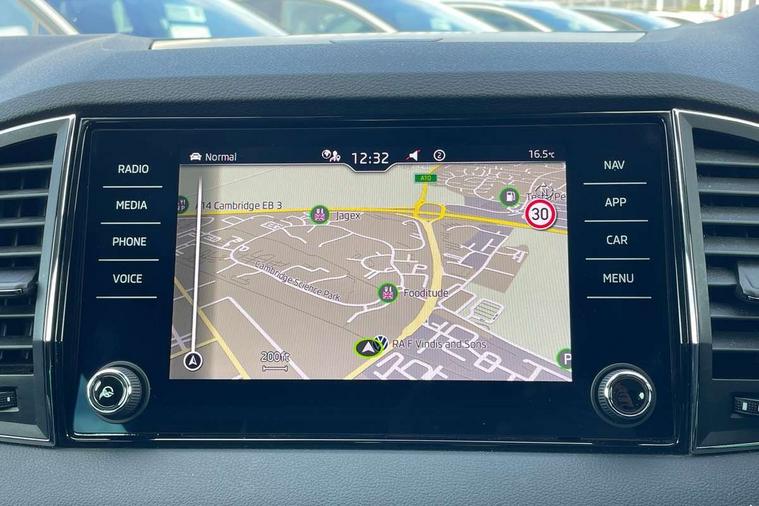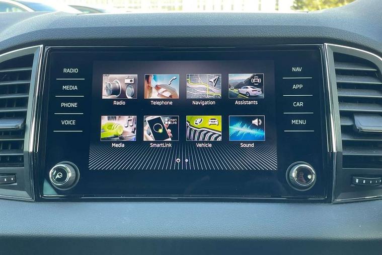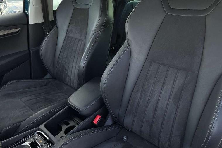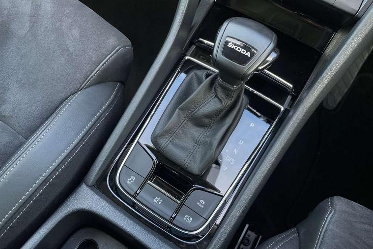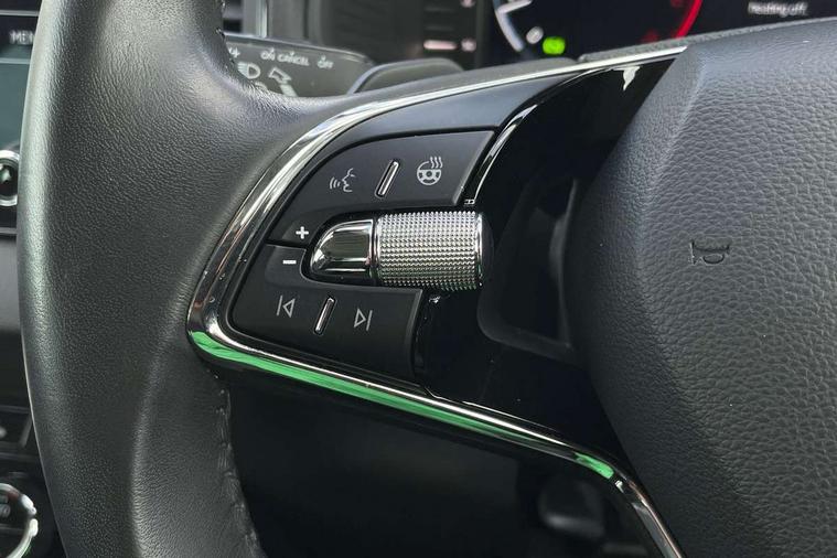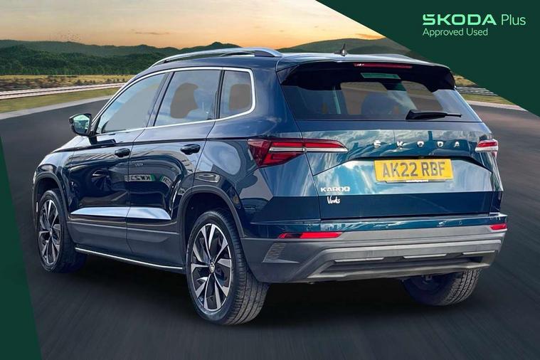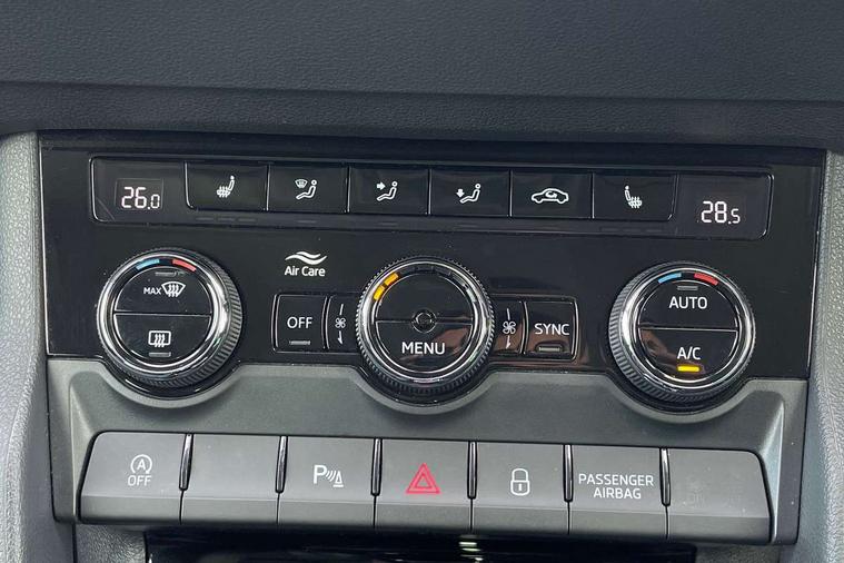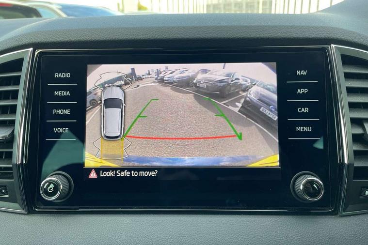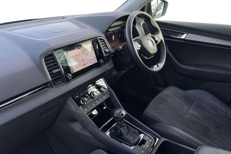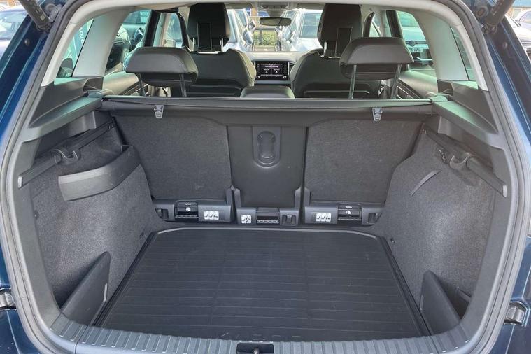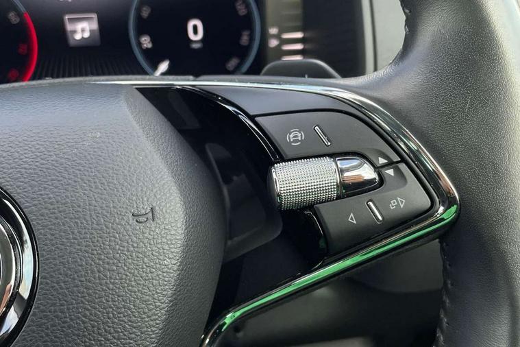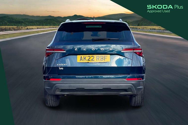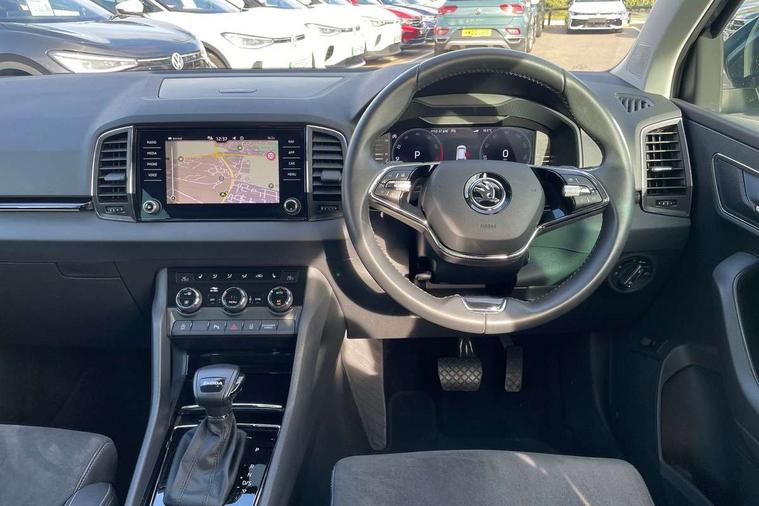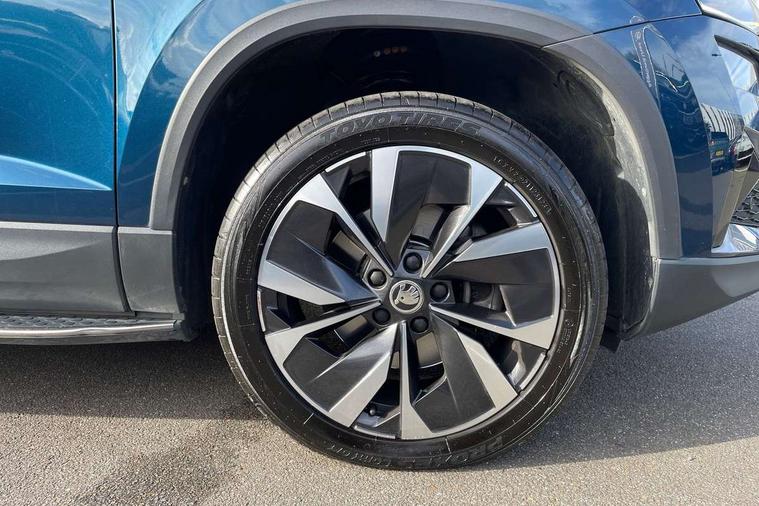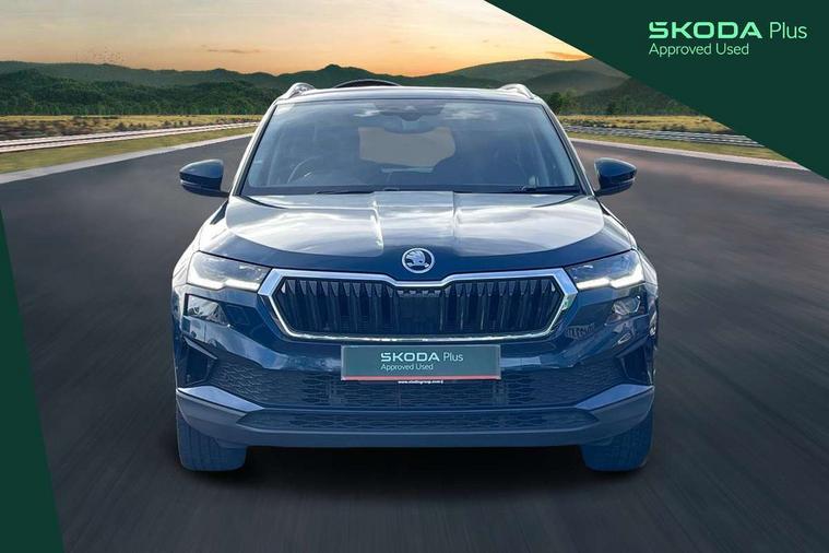 Chrome framed air vents, Chrome roof rails + chrome pack - Karoq, Parking pack - Karoq, 18" Miran alloy wheels in black, Anti-theft wheel bolts protection, Storage on wheel cover, Alarm with interior monitoring, back up horn and tilt sensor with safe function, Electronic engine immobiliser, Keyless entry and start/stop system with SAFE system, Remote central locking with 2 remote folding keys, 8 speakers, DAB radio with Bluetooth, USB connection, Airbags - Front side, head, knee and curtain, Automatic door unlocking in case of crash, Automatic fuel cut off in case of crash, Child locks on rear doors, Driver airbag, Electronic parking brake with auto hold function, Emergency rear braking signal, ESC including ABS, MSR, ASR, EDS, HBA, DSR, RBS, MKB and traction control, Front assist radar scanning of the space in front of the car with automatic braking, Hill hold control, Passenger airbag with switch-off function, Pedestrian monitor, Three point seatbelts rear, Two tone horn, Tyre pressure display, Tyre pressure monitor, Acoustic glass, Aero front windscreen wipers with intermittent function, Auto dimming rear view mirror with light and rain sensors, Automatic headlight control system, Black electric window control buttons, Body colour door mirrors and handles, Body coloured bumpers, Electric front and rear windows with child proof lock, Electrically adjustable heated folding and auto dimming door mirrors, Heated rear windscreen, LED daytime running lights, LED Headlights, LED rear lights with high functionality welcome effect and dynamic indicators, Light assistant (coming/leaving home/tunnel light), Privacy glass, Rear side wing doors, Rear spoiler, Rear wiper, Safety reflectors on front doors, Third brake light, 1.5 litre bottle holders in driver and front passenger door panels, 12V socket in boot, 12v socket in front centre armrest with storage compartment and rear air vents, 2 Folding hooks and nets in boot, 2 spoke leather heated multifunction steering wheel with DSG paddles, 2 x Tablet holder, 3 rear height adjustable headrests, 3 seat bench in 2nd row, 4 foldable roof handles with rear coat hooks, Black floor carpet, Chrome inner door handles, Decorative door sills with KAROQ badging, Double sided boot floor, Foldable hooks in the boot, Folding tables on the front seat backrests, Front head restraints, Height adjustable driver and passenger seat, Height adjustable front three point seats belts with tensioners, Height/reach adjust steering wheel, Ice scraper, Illuminated and cooled glovebox, Illuminated luggage compartment, Isofix child seat preparation for front passenger seat, Isofix child seat preparation outer rear, Manual lumbar support for front seats, Pen holder, Pollen filter, Rear boot cover, Rear reading lights, Retractable parcel shelf attachable to tailgate, Rubbish bin door, Safety vest holder, Seatbelt reminder signalisation and pretensioner for all seats, Single front passenger seat, Storage box in upper central dashboard closed, Sunvisors with illuminated vanity mirrors, Textile floor mats, Umbrella under passenger seat, VarioFlex seats with standard rear seat release, Care connect, Driver fatigue sensor, Emergency services call system, Multifunction colour trip computer, Outside temperature gauge, Service interval indicator, SmartLink wireless for Apple and wired for Android, Start/stop system with regenerative braking, USB C Port x 2 in front centre console,