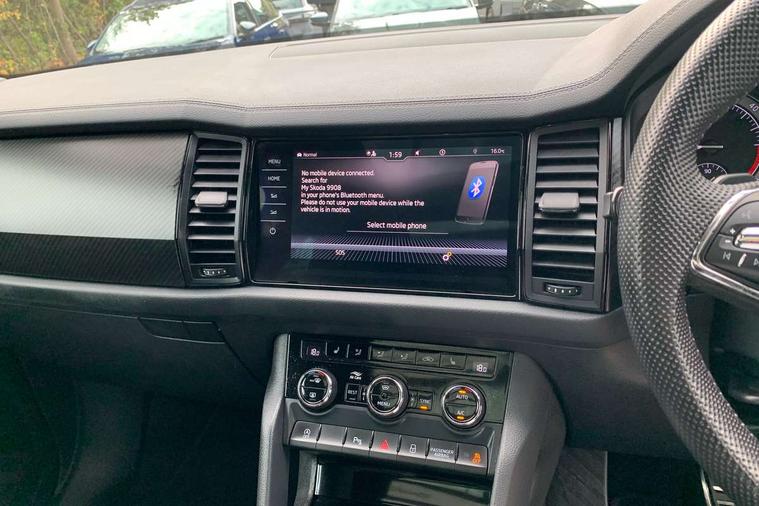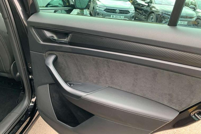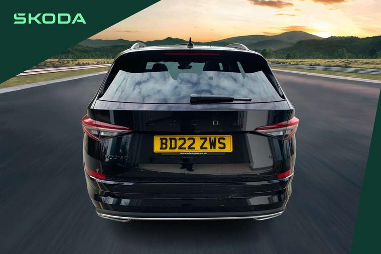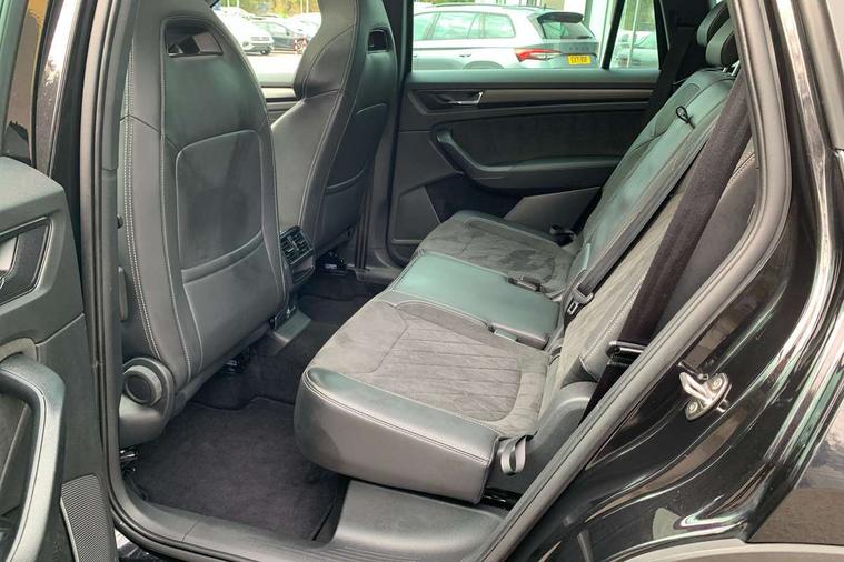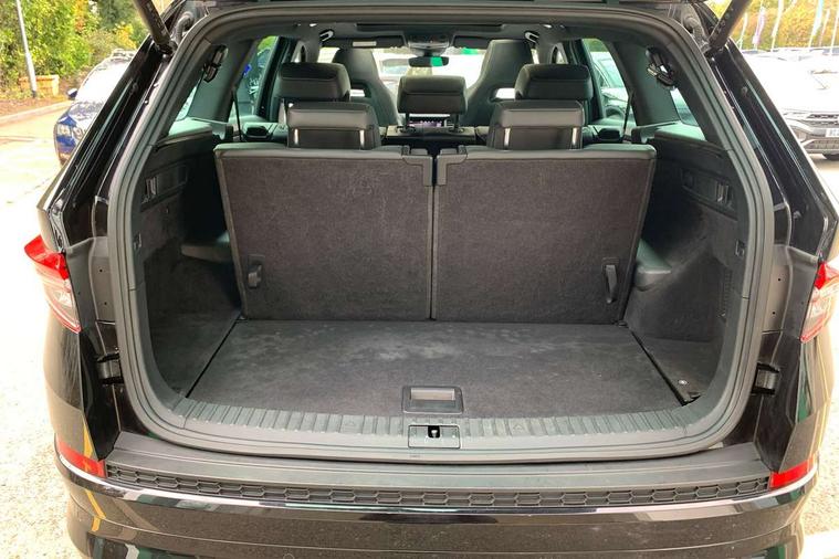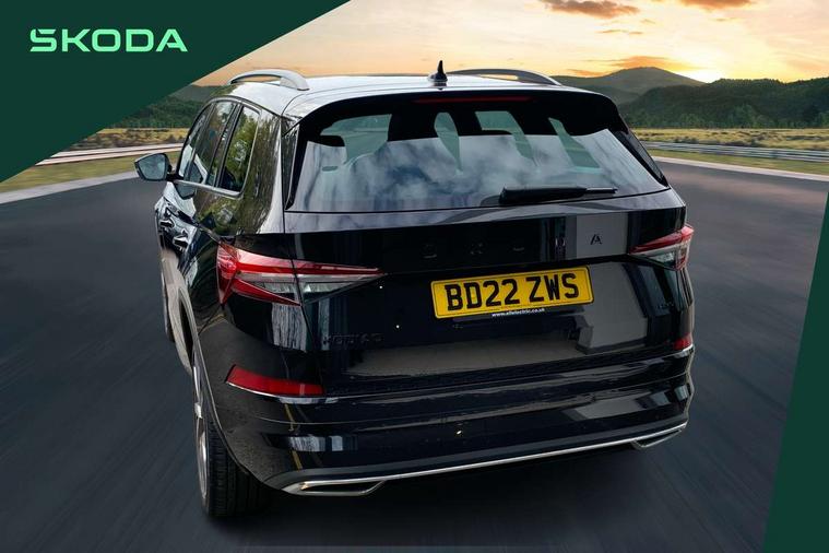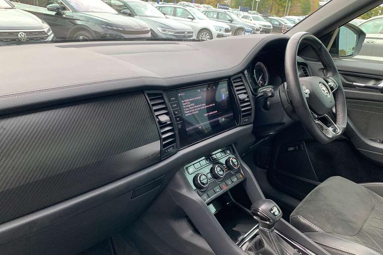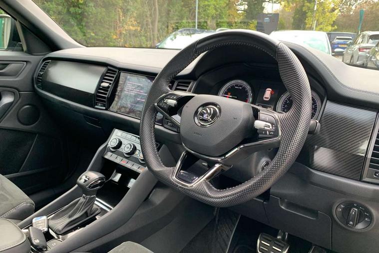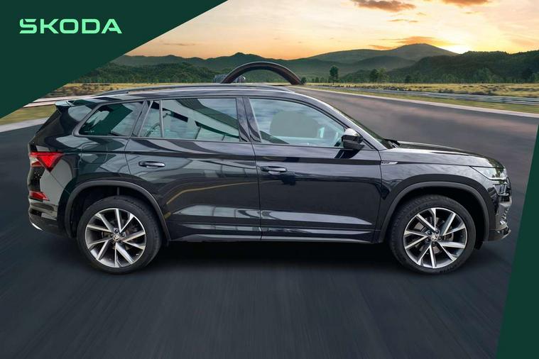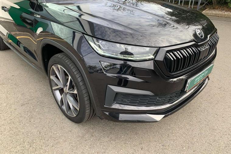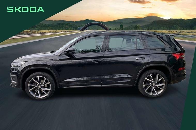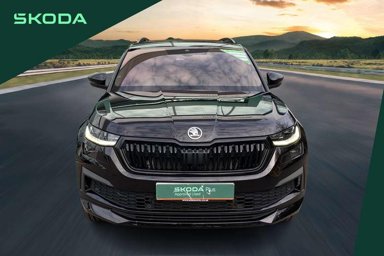 Bluetooth system, Columbus satellite navigation with 9.2" touchscreen, integrated Wi-Fi, web radio, Digital voice enhancement, E-call, ECO Stop/start function, Exterior temperature indicator, Progressive steering, Rear view camera, Smartlink wireless for apple carplay and wired for android auto, Speed limiter, Tailgate unlocking from outside, USB C Port x 2 in front centre console, Wireless charging, 8 Speakers, DAB Digital radio, Aero front windscreen wipers with intermittent function, Aero rear window wiper, Auto dimming rear view mirror, Black roof rails, Black sports styling including front grille and window surrounds, Black wheel arch surrounds, Body colour bumpers, Body colour door handles, Electric adjustable/heated/folding door mirrors, driver side auto dimming with boarding sports and memory function, Electric front and rear windows, Extended rear spoiler with finlets in gloss black, Front fog lights, Full LED matrix headlights with AFS (adaptive front light system), cornering function and AWL (all weather lighting system), Gloss black door mirrors, Headlight washers, Heated rear window, Invisible tailpipe, LED daytime running lights, LED rear fog light, LED third brake light in rear spoiler, Light assistant (coming/leaving home/tunnel light), Off-road style lower front bumper element, Privacy glass, Rain and light sensors, Rear diffuser, Rear LED lights (high functionality) with welcome effect and dynamic indicators, Rear side wing doors, Safety reflectors on front and rear doors, Sportline badge on front fender, Sports front and rear bumpers including lower rear chrome strip, Tailgate lettering in Black, Window control switches with black trim, Without engine designation, 12V socket in boot, 2 rails with 2 hooks, 2 seat bench in 3rd row, 3 seat bench in 2nd row, 4 foldable roof handles with rear coat hooks, 60:40 foldable rear seat with sliding adjustment and backrest angle adjustment, Aluminium pedals, Black roof headlining, Bottle holders in door panel in the 1.5 litre front and 1 litre rear, Cargo storage compartments, Chrome headlight control button, Chrome interior door handles, Coat hooks on B pillar, Covered storage compartment on driver side, Front centre armrest with storage compartment, cup holder and 12V socket, Front courtesy lights, Gear shift lever with chrome frame and black gloss insert, Grey stitching in front and rear armrests and door armrests + door inserts, Height adjustable front headrests, Illuminated and cooled glovebox, Illuminated luggage compartment, Isofix child seat fittings in outer rear seats with top tether, Manually adjustable steering column, Microsuede door panels, Net programme in boot (1x horizontal Net, 2x vertical Nets), Overhead glasses storage compartment, Pollen filter, Rear centre armrest with cupholders, Single front passenger seat, Sliding trunk cover, Small Bags on the inner sides of the front backrests, Sports seats, Sunvisors with illuminated vanity mirrors, Three rear height adjustable headrests, Ticket holder on A Pillar, Umbrella in door panel, Variable boot floor, LED Interior light pack - Kodiaq, Auto door release and activation of warning lights in the event of an accident, Child locks on rear doors, Driver and front passenger airbag with knee airbag and front passenger airbag deactivation, Electronic parking brake with hill start assist, Emergency rear braking signal, ESC (incl. ABS+MSR+ASR+EDS+HBA+DSR+RBS+MKB), Front assist with autonomous emergency braking, Front side airbags with curtain airbags, Fuel cut off safety device, Height adjustable front 3 point seatbelts + pretensioners, Hill hold control, Rear disc brakes, Safety vest holder in door, Seat belt reminder for all seats, Three point rear seat belts, Two tone horn, Tyre pressure monitor, Alarm with interior monitoring and tilt sensor with safe function, Anti-theft wheel bolts, Immobiliser, Keyless entry and start system (KESSY), Remote central locking with 2 keys, Black air vent surround, Carbon finish dashboard and door inserts, Grey stitching in dashboard, 20" Vega Anthracite alloy wheels, Temporary spare wheel (space saver),
