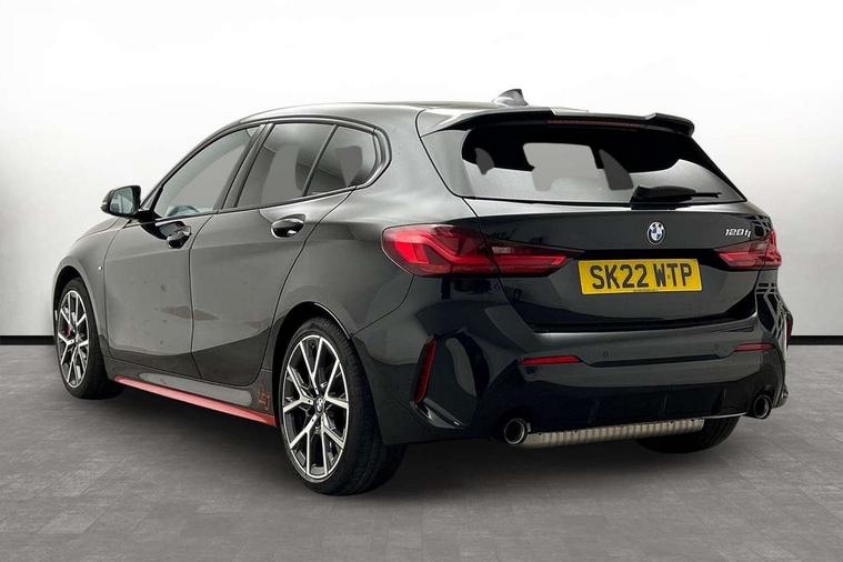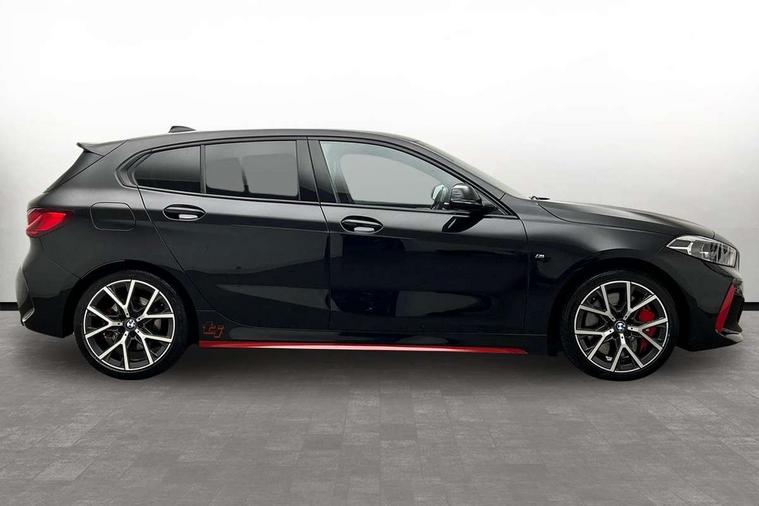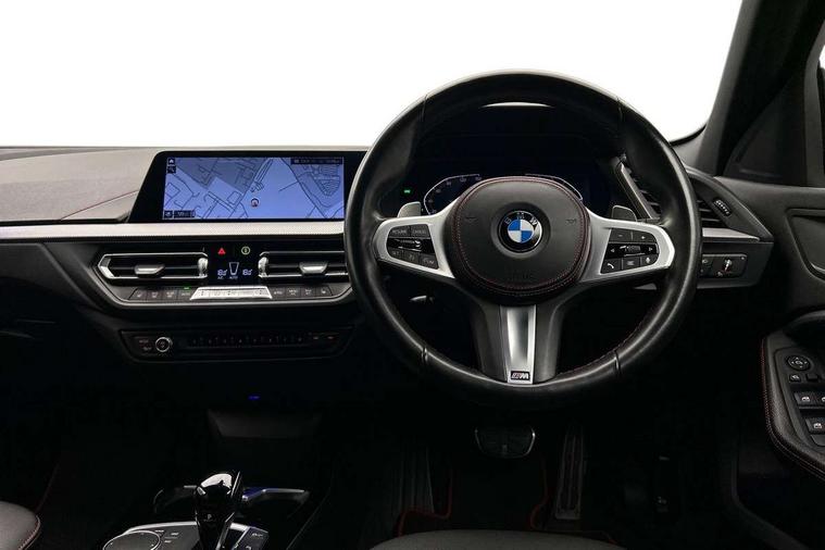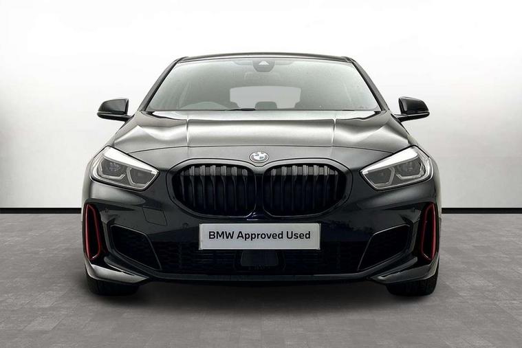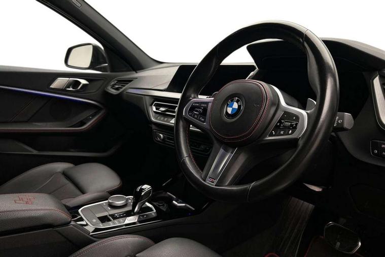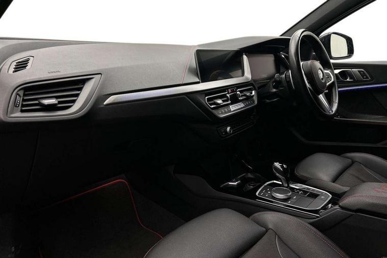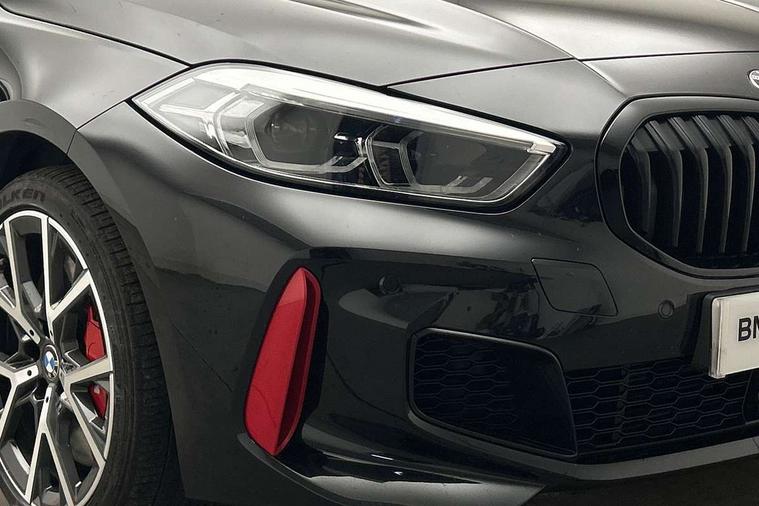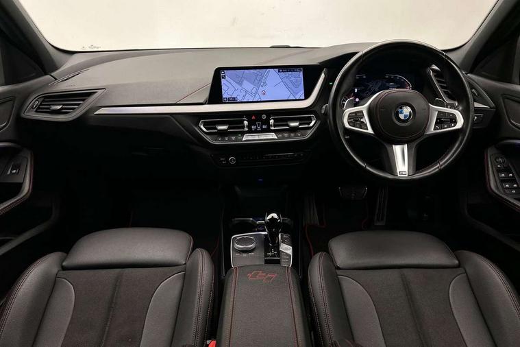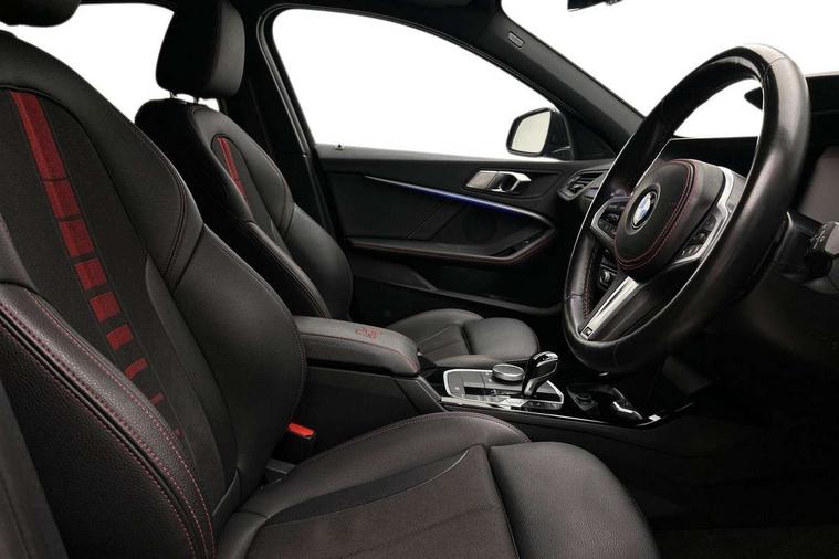 Active guard plus, Attentiveness assist, Bluetooth / WiFi interface for wireless connection of mobile terminal devices and audio streaming, BMW ConnectedDrive online services, BMW Teleservices, Check Control warning system for monitoring of lights and door/luggage compartment open warning, Cruise control with brake assist, Eco pro mode, Electric power steering with Servotronic steering optimised at all speed ranges, Front axle single joint with specific axle kinematics to minimise drive influences on steering + provide increased rigidity agile driving behaviour, Integrated owners handbook, Lane departure warning system, Oil sensor for level and grade, On board computer, Optimum shift indicator, Personal Profile, Pull away assistant, Rigidly mounted rear subframe - Multi link construction with separate spring / damper configuration and excellent driving characteristics, Speed limit Info including no-overtaking indicator, Speed limiter, Aluminium lightweight construction, Anti roll bar front and rear, Balancer shaft, Double VANOS twin scroll turbocharging system, Drive Performance Control, Eight speed sport automatic transmission with gearshift paddle switches, Electronic differential lock, High precision injection, Larger fuel tank capacity (50 litres), M sport suspension with M128i xDrive specific settings, Petrol Particulate Filter, Twin tube gas filled shock absorbers with degressive characteristic curve, VALVETRONIC engine management, DAB Digital radio, Auto dimming rear view mirror, Automatic headlight beam throw control, Automatic windscreen wipers and automatic headlight, Black chrome tailpipe finishers, BMW individual high gloss shadow line with extended content, Body colour door handles, Body colour mirror caps, Body colour roof trims, Chrome 'M' logo side designation, Chrome kidney grille frame with Satin Aluminium struts, Direction indicator side lights in exterior mirrors, Fading support, Folding side mirrors with auto dimming/folding wing mirrors with auto dimming, Follow me home headlights, Front and rear bumper system with replaceable deformation elements, Front and rear electric windows with open and close fingertip control, anti trap facility and comfort closing, Front door sill finishers in black plastic with M designation in metallic look, Green tinted heat protection glazing, Heated, electrically adjustable exterior mirror aspheric on driver side, convex on passenger side, High gloss shadowline window frame, Recess cover mirror frames and B/C pillar embelisher trim, High level third brake light, Integrated front windscreen with washer jets, Kidney frame and struts in high gloss black extended, LED daytime running lights, LED eyebrow turn indicators, LED front fog lights, Lightweight engineering, Matt black air guide grilles, Matt black wheel arch trim, Model designation on electric bootlid, Nearside reverse light in rear light cluster, Preparation for high beam assistant, Rear fog lights, Rear side wing doors, Rear window wiper, Shark fin antenna, Trailer stabilisation logic, Visible VIN plate, Welcome lighting, 12V power socket in front centre console with blanking plug, 3 rear seat head restraints, 3 seat bench in 2nd row, Ambient interior lighting, Anthracite headlining, Centre armrest in black/red highlight including embroidered 'ti' designation in red, Child seat ISOFIX attachment for two outer rear seats and front passenger seat with anchorage points, Conditioned based service, Driver and front passenger seat heating, Folding rear clothes hook, Four grab handles integrated in roof lining, Front and rear door pockets with bottle holders, Front and rear side armrest integrated into door trim, Front armrest, Front sports seats, Glove compartment, Height adjustable front head restraints, Instrument panel top section , door armrests and door panels in black/red highlight, Luggage compartment for bag hooks on left and right, foldable luggage compartment liner and two lashing eyelets, Manual adjust steering wheel, Multi-function controls for steering wheel, Single front passenger seat, Storage compartment in centre console, Sun visors with vanity mirrors and insert tab, Three spoke M sport design multi function leather steering wheel in unique red stitching, Two front centre console cupholders, Two zone automatic air conditioning, Additional interior lighting pack - 1 Series, Additional storage compartment pack with code 493 -1 series, BMW live cockpit professional pack- 1 Series, Connected pack professional - 1 Series, Interior lights pack - 1 Series, M Sport exterior styling aerodynamics pack - 1 Series, 2 tone horn, 3 point seatbelts on all seats, front pyrotechnic belt tensioners, stopper and belt force limiters, rear coded belt buckles, Airbags - Front driver/passenger, front and rear curtain head protection, front side, manual deactivation of front passenger airbag, Anti lock braking system (ABS) with brake assist, BMW emergency call, Brake drying, Braking readiness, Child proof locking system in rear door, City braking function, Comfort modes, Cornering brake control, Crash sensor activating central locking release, hazard warning lights, fuel cut off, interior lighting + activation of safety battery terminal clamp, Driver and front passenger seat belt security check, Dynamic stability control + (DSC+), Dynamic Traction Control - DTC, Electrically operated hand brake including automatic hold function, Front and rear disc brakes, M Sport brakes with red calipers, M Sport seatbelts, Seatbelt warning, Side impact protection, Tyre pressure monitoring system, Warning triangle and first aid kit, Central locking switch for all doors, fuel filler cap and luggage compartment, Deadlocking function system to all doors, Drive away locking system on all doors and luggage compartment with de-activated in iDrive settings, Locking wheel bolts, Remote control with integrated key with High-gloss Black inlay and M designation and 1 button for open/ close lock, window, open luggage 