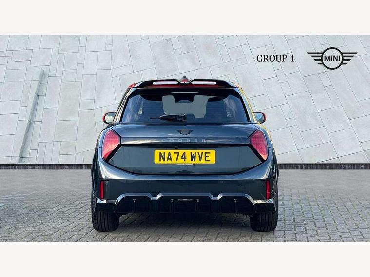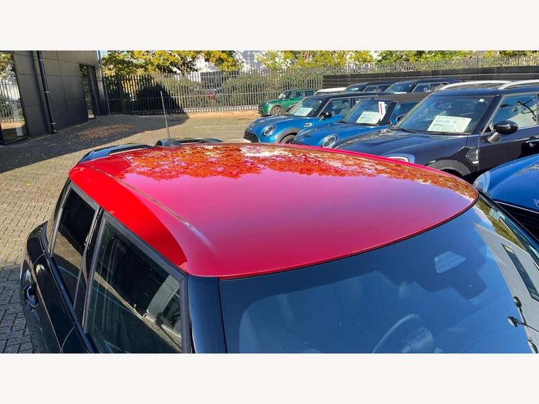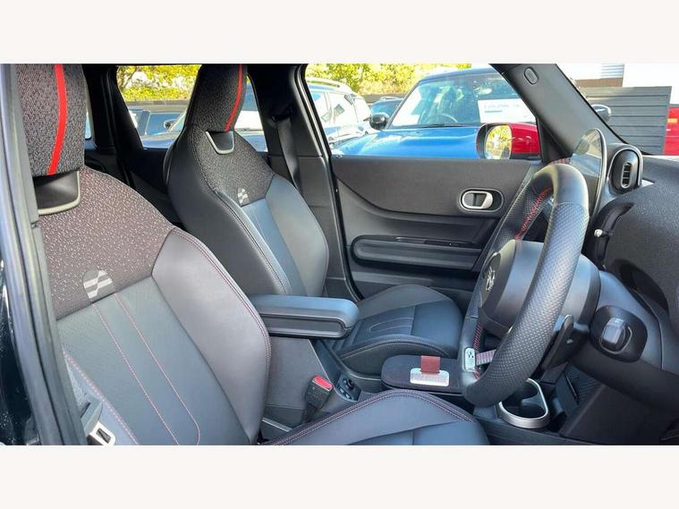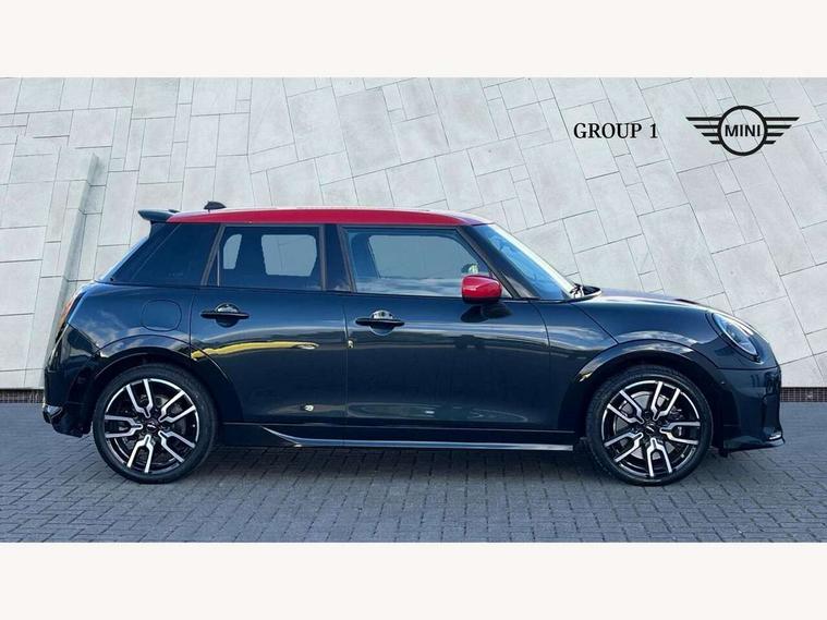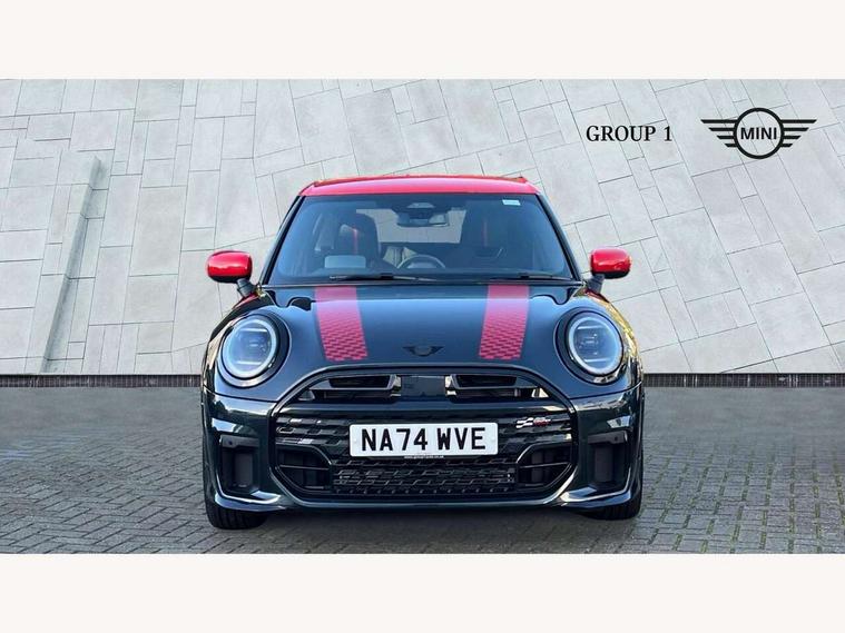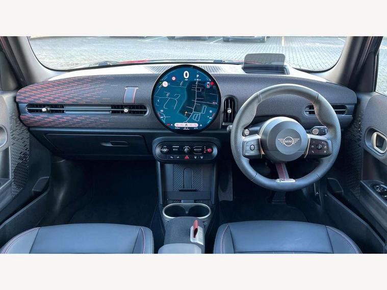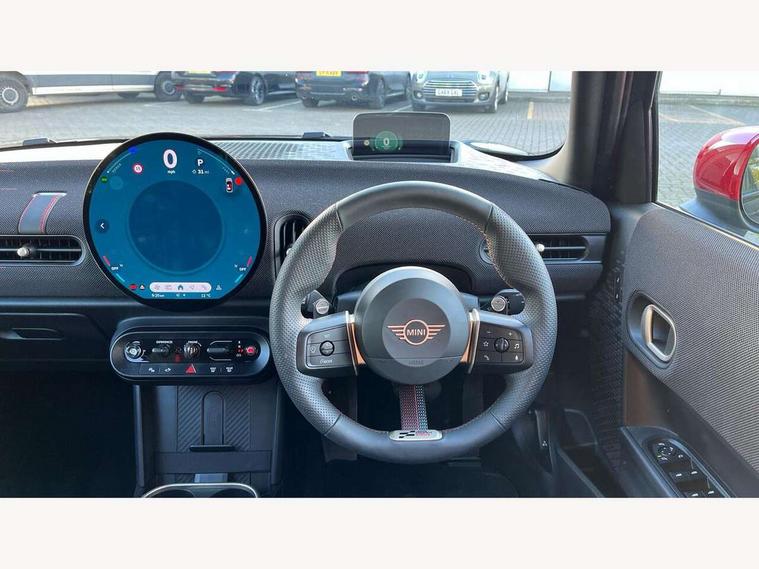 Central toggle bar, Circular OLED Screen, Compatible mobile phone bluetooth with audio streaming, Cruise control, Digital instrument cluster, Electro-mechanical speed dependant steering assistance, Emergency call service, MINI Experience Modes, Mini navigation system, On board computer, Service interval indicator, 7 speed steptronic sport transmission with double clutch, Adaptive suspension, DAB Digital radio, Personal eSim, Auto headlights, Electric adjustable heated door mirrors, Electric front+rear windows, Front and rear apron, Heated rear window, Heated windscreen washer jets, High gloss hexagonal patterned grille surround, LED daytime running lights, LED Headlights, LED indicator lights, LED rear lights, Rain sensor window wipers, Rear fog lights, Rear roof spoiler with airblades, Rear side wing doors, Rear window wiper, 2 zone automatic air conditioning, 3 seat bench in 2nd row, 60/40 rear seat bench, Ambient lighting, Black lower band in high gloss, Cupholders, Dark headliner, Floor mats, Front and rear head restraints, Front compact armrest, Heated steering wheel, Height adjustable passenger seat, Lidded storage box in Black/Red knit, Luggage compartment lighting, Partially perforated vescin steering wheel with red accent, black/red decorative strap, Single front passenger seat, Steering wheel paddle shift, Sunvisors with vanity mirrors, Vescin/Cord upholstery, Driving assistant pack - Cooper Hatchback, Park assistant pack - Cooper Hatchback, 3 point seatbelts on all five seats, 6 Airbags - front, side, head and seat belt tensioners, Acoustic pedestrian protection, Anti-lock braking system (ABS), Brake caliper in Black with JCW badge, Child locks on rear doors, DSC - Dynamic Stability Control, Electronic parking brake, Front and rear disc brakes, Front ISOFIX (iSize), Front passenger airbag deactivation, JCW Sport Brakes, Traction control, Tyre pressure monitoring system, Alarm, Immobiliser, Remote central locking, Black/Red decorative dash strap, JCW Black/Red dashboard knit, Tyre repair kit,