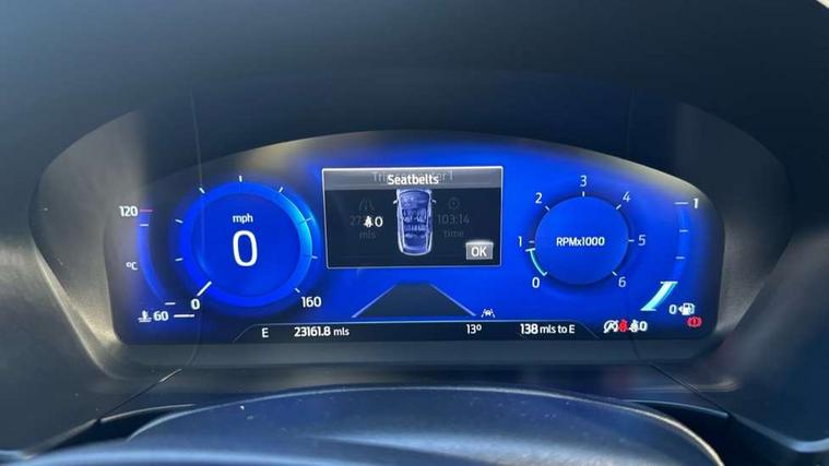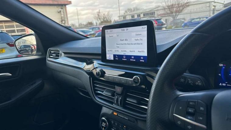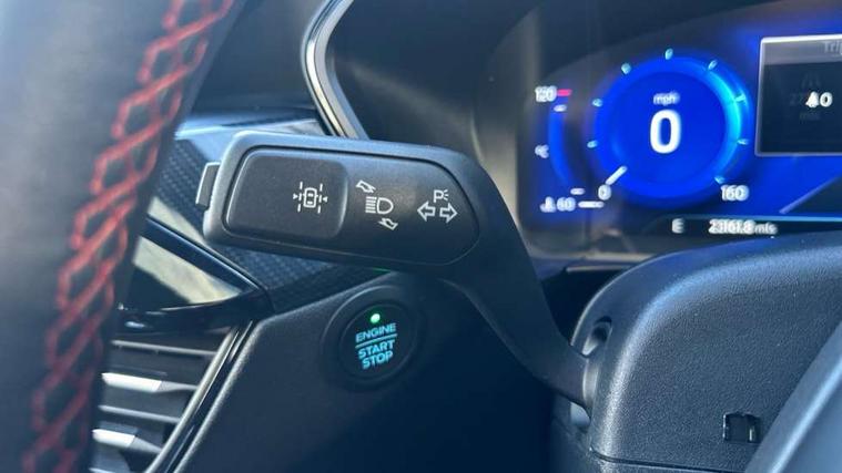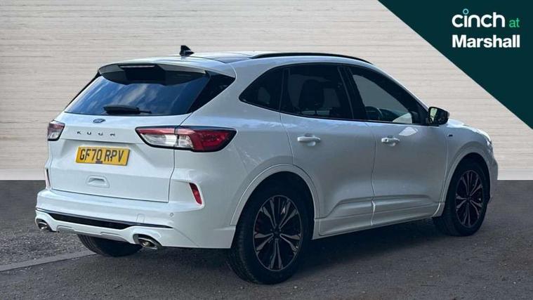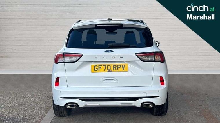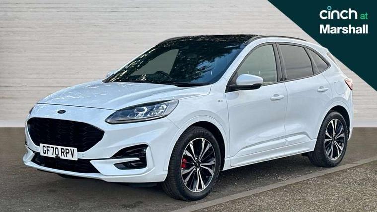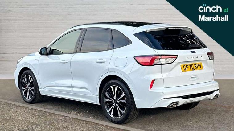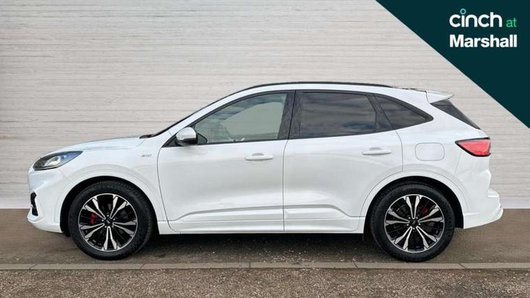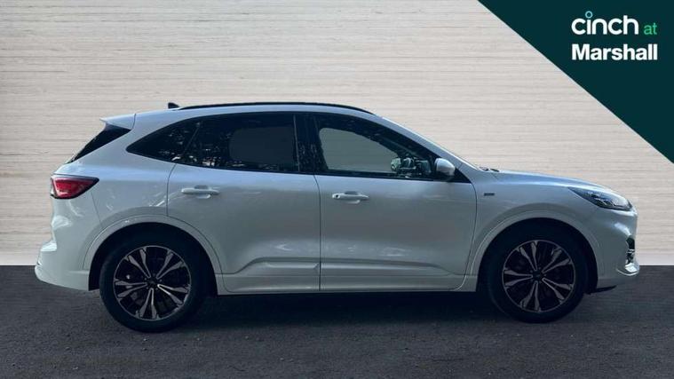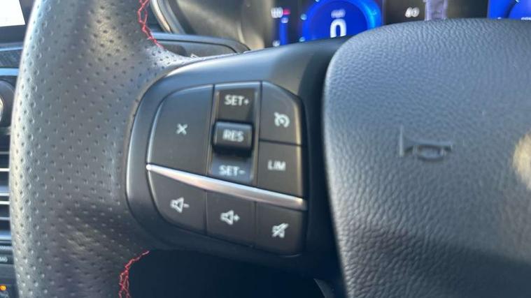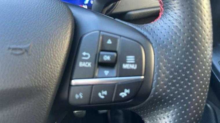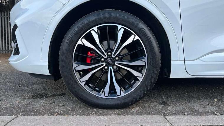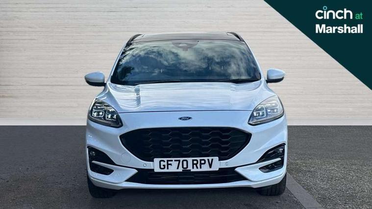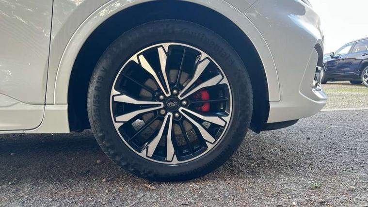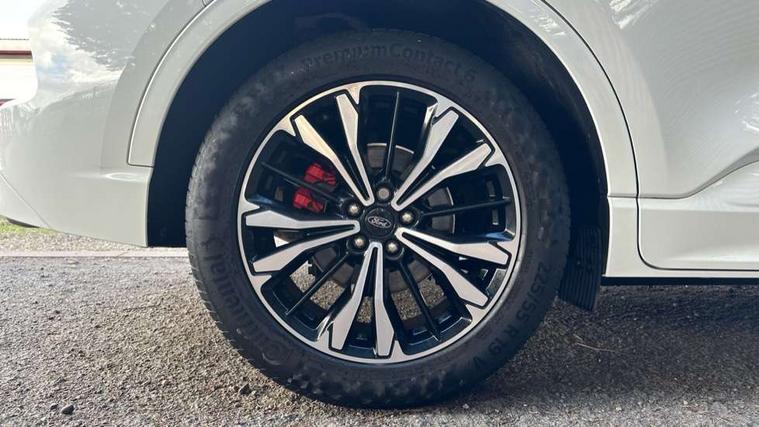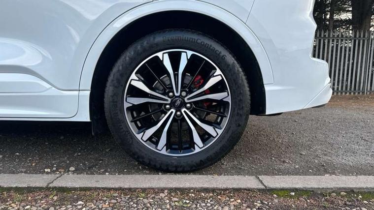 Driver impairment monitor, Ford easy fuel, Ford SYNC 3 with 8" colour touchscreen, App Link, andriod auto/apple carPlay and navigation with Ford pass connect, Front and rear parking sensors, Hands free power tailgate, Intelligent speed assist, Lane keeping aid with lane departure warning, Mobile phone wireless charging pad, Power assist steering, Selectable drive modes, Sports suspension, Auto dimming rear view mirror, Auto headlamps with high and low beam, Auto wipers, Black roof rails, Front LED fog lights with cornering function, Full LED headlamps, Large rear spoiler, LED daytime running lights, LED rear lights, Power folding heated door mirrors with puddle lights, Power front/rear windows with global close, Power opening panoramic roof, Privacy glass, Quickclear heated windscreen, ST Line body styling kit with unique front and rear fascia and bumper, rear painted diffuser, front painted skid plates, dark mesh upper grille, ST Line front scuff plates, Twin exhausts, 10 way power adjustable drivers seat, 2nd row sliding seats, 8 way manual passenger seat including lumbar support and height adjust, Alloy pedals, Ambient lighting, Centre console with electronic parking brake, Dark headlining and pillars, Dual electronic automatic temperature control, Flat bottomed leather steering wheel in sensico with red stitching, Front and rear head restraints, Heated passenger and driver seats, Rear charging point, Sensico partial premium leather upholstery, Sports seats, ST Line front and rear floor mats, Unique ST Line leather gear knob, B&O with large instrument cluster pack - Kuga, 3x3 point rear seatbelts, Airbags - front driver/passenger, front and rear curtain, Drivers knee airbag, Electronic stability control (ESC) and ABS, Ford MyKey Gen 2 safety system, Post collision braking, Powered child proof rear door locks, Pre collision assist with autonomous emergency braking, Red brake calipers, Tyre pressure monitoring system, Engine immobiliser, Keyless entry, Keyless start with 'Ford Power' starter button, Locking wheel nuts, Remote powered central double locking doors, Thatcham category 1 alarm,