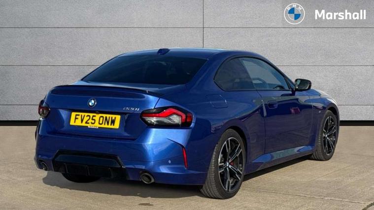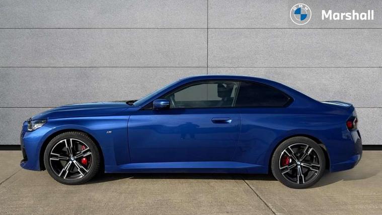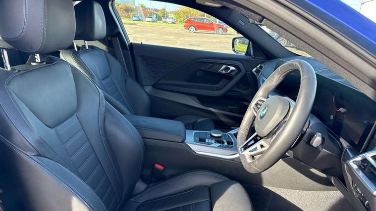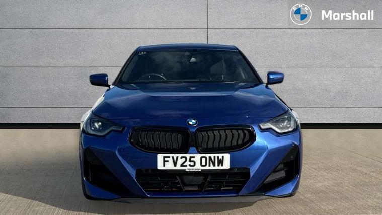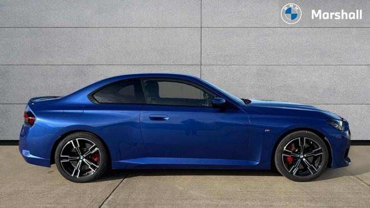 2 USB connections for charging and transferring data, Active guard plus, Attentiveness assist, Bluetooth with USB, BMW ConnectedDrive online services, BMW Intelligent Personal Assistant, BMW Live cockpit plus, BMW operating system 8 with variable, configurable widgets display information in real time, BMW Teleservices, Check Control warning system for monitoring of lights and door/luggage compartment open warning, Control Infotainment, Direct selection buttons, Drive off assistant, Eco pro mode, Electric power steering, eSim with 5G connectivity, Front and rear parking sensors, iDrive controller with turn and press function, Integrated owners handbook, Intelligent functions, Oil sensor for level and grade, Optimum shift indicator, Personal Profile, Smartphone integration, Touch operation on control display, Variable sport steering, Widescreen multi-media display, WiFi interface for wireless connection of mobile terminal devices, Aluminium lightweight construction, Balancer shaft, BMW TwinPower Turbo four-cylinder petrol engine, Double VANOS, Drive performance control with ECO PRO comfort + sport mode, Electronic differential lock, High precision injection, M sport suspension, Petrol Particulate Filter, Steptronic transmission with gearshift paddles, Twin scroll turbocharger with Valvetronic, DAB tuner, Acoustic windscreen wipers for reduced driving noise, Automatic windscreen wipers and automatic headlight, Body colour door handles flush with door surface, Body colour door mirrors, Body colour front and rear bumpers, Daytime running lights, Electric windows - front and rear, with open/close fingertip control and trap release, Exhaust tailpipes x2 - 90mm in left and right, Fading support, Front and rear bumper system with replaceable deformation elements, Front door sill finishers in black plastic with BMW designation, Front windscreen wipers with integrated washer jets, Green tinted heat protection glazing, High beam assistant, High gloss black sill, bumper trim sides and diffuser insert, High level third brake light, Indicators integrated int mirror housing, Interior rear-view mirror with automatic anti-dazzle function, LED registration plate light, LED technology rear tail lights, brake lights and turn indicators, Lightweight engineering, M high gloss shadowline, One piece kidney grille with hight gloss chrome surround, Rear boot, Rear fog lights, Reversing light in rear light cluster, Shark fin antenna, Single part LED rear lights with smoked glass components, Trailer stabilisation logic, Visible VIN plate, 12V power socket in front centre console with blanking plug, 2 cupholders in front centre console, 2 zone automatic air conditioning, Ambient lighting, Compartment in front of cupholder, Conditioned based service, English handbook, Folding rear seat head rests, Front and rear side armrests integrated into door trim, Front armrest, Front door pockets, Front head restraints, Heated front seats, Illuminated glove compartment with separate small compartment, M headliner Anthracite, M sport leather steering wheel, Manually adjustment steering wheel column, Rear seat backrest with manual 40:20:40 split folding, Rear seat centre foldable armrest with integrated cup holder, Single front passenger seat, Storage compartment between rear seats, Storage tray and compartment with cover in centre console, Sun visors with vanity mirrors and insert tab, Through loading system with 40/20/40 split folding 2 rear seat in 2nd row, Velour floor mats, Additional storage compartment pack without USB - 2 Series Coupe, Connected pack professional - 2 Series Coupe, 2 tone horn, Anti lock braking system (ABS) with cornering brake control, Automatic Stability Control (ASC), BMW emergency call, Brake drying, Child seat ISOFIX attachment for the two outer rear seats, Crash sensor activating of airbags, Unlocking doors, hazard warning lights, interior light, safety battery terminal, Deactivation of fuel pump in the event of a crash, Driver and front passenger airbags, Driver and front passenger side airbags, integrated in the door side seat backrest bolsters for all seat variants, Dynamic brake control, Dynamic stability control + (DSC+), Dynamic Traction Control - DTC, Electrically operated hand brake including automatic hold function and automatic release when driving off, Front and rear disc brakes, Front centre airbag between driver and front passenger seats, Front passenger airbag deactivation, Head airbags for all 4 outer seats, PC iBrake (Post crash approach control warning with light braking function), Seat belt security check for driver and front passenger, Seatbelt warning, Side impact protection, Three point seat belts on 4 seats including front belt stopper, pyrotechnic belt tensioners and belt force limiters, Tyre pressure monitoring system, Warning triangle and first aid kit, Alarm system (Thatcham 1) with remote control and electronic engine immobiliser, Central locking switch for all doors, fuel filler cap and luggage compartment, Deadlocking function system to all doors, Drive away locking system on all doors and luggage compartment, Locking wheel bolts, Start/Stop button (illuminated) in centre console with keyless engine start and Auto Start-Stop deactivation button, Two remote control key with integrated key - one button for open and close doors/fuel flap/tailgate and separate button for unlock luggage compartment, Electrically powered 12V compressor, Reduced rolling resistance tyres, Tyre repair kit,