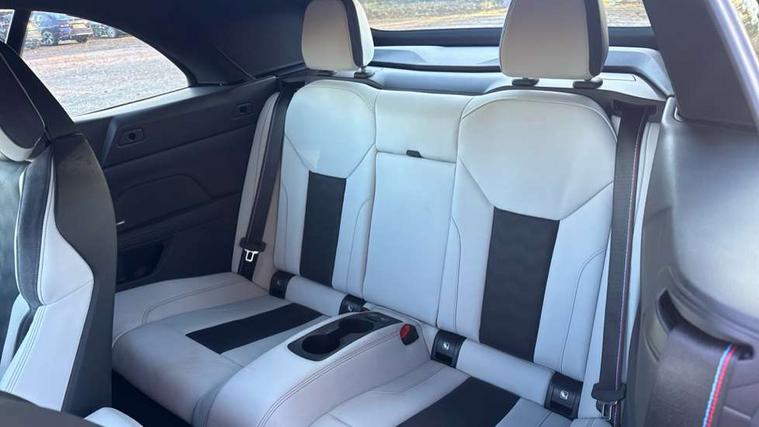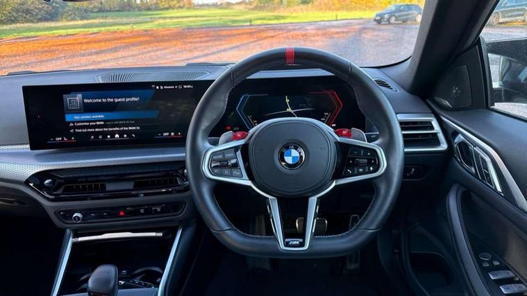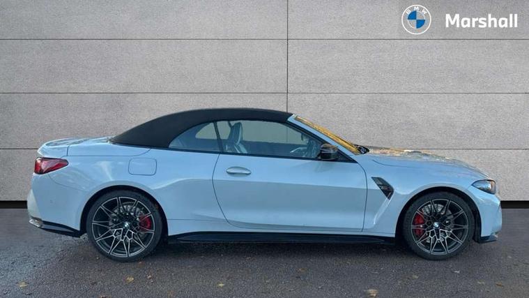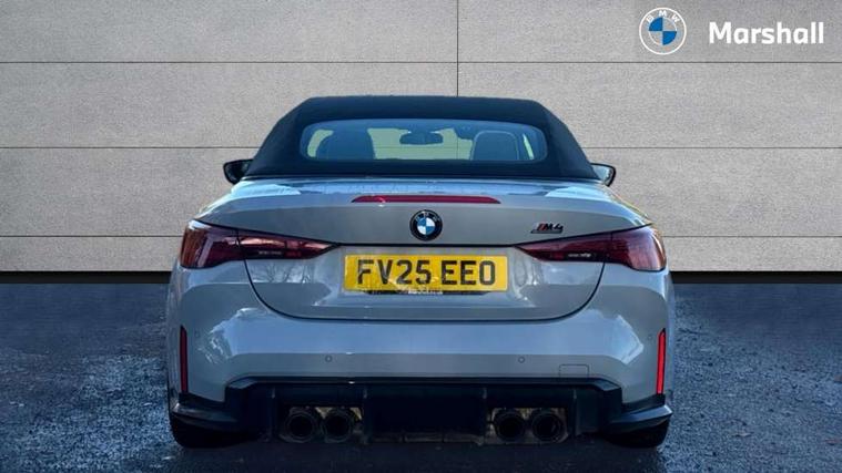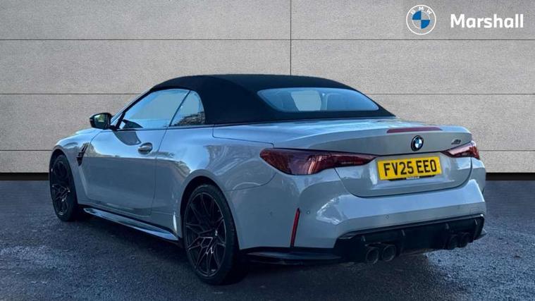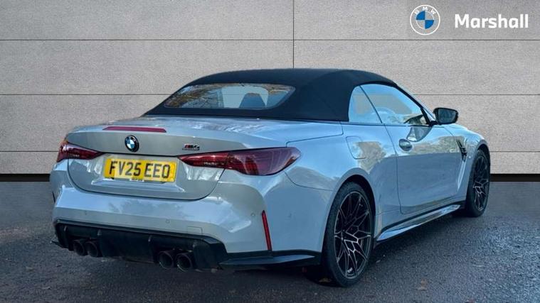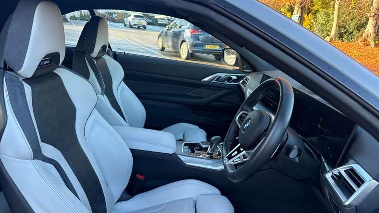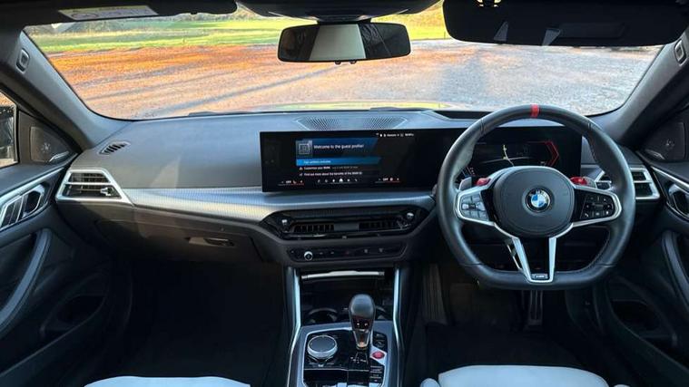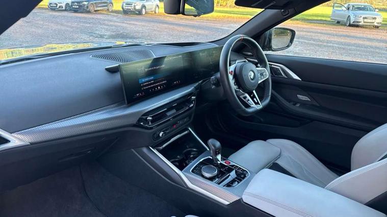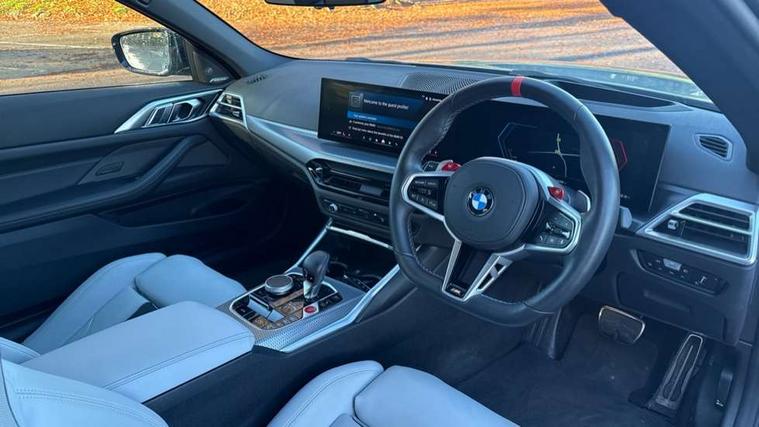 Active Guard, Automatic start/stop system, BMW ConnectedDrive online services, BMW legal emergency call, BMW Live Cockpit Pro with Head up display including 12.3" instrument display and 14.9" high resolution control display with navigation function, BMW Teleservices, Brake pad wear indicator warning light, Condition based service, Cruise control with braking function, Door/boot open warning light, Electric Power Steering (EPS) with Servotronic, Language version English, Lights on warning, M drive buttons, Oil sensor for level and grade, warning by check control system, Oil temperature gauge, On board computer, On board diagnostics, Optimum shift indicator, Outside temperature display, Park distance control, Pull away assistant, Run flat indicator, Service interval indicator, Shifting point display, Smartphone integration, Speed limiter, Start/stop button in red, Variable sport steering, Double joint spring strut front axle, M Adaptive suspension, M Drive Professional including track mode, laptimer, traction control & Drift analyser, M Sport differential, Safety battery terminal clamp, Sport automatic transmission with gearshift paddles, Auxiliary point for auxiliary devices, DAB radio with bluetooth music capability, Harman kardon surround sound audio system, Personal eSim, Acoustic laminated side glass, Auto dimming driver's door mirror, Automatic headlights + automatic windscreen wipers, Automatic parking function on front passenger's exterior mirror, Black chrome exhaust tailpipes, Black model designation badges, BMW high gloss shadow line with extended contents, BMW radiator grille, frameless, with horizontal double blind slats, black high-gloss, with model badge, Body colour bumpers, Bonnet and tailgate badge, Carbon fibre reinforced plastic (CFRP) roof, Day time running light, Door mirror integrated indicators, Dynamic brake lights, Electric adjustable heated door mirrors, Electric folding door mirrors, Electrochromic exterior driver side mirror, Electrochromic interior rear view mirror with automatic anti-dazzle function, Entry sills with aluminium inserts and model badge, Extended Stroage, Follow me home headlights, Front and rear bumper system, Front and rear plastic apron in vehicle colour, Front door sill strips in aluminium inlays with M4 inscription, Front electric windows with open and close fingertip control, anti trap facility and comfort closing, Headlight beam throw control, Heated washer jets, High gloss black lower bumper edges, side sills and diffuser edge binding, LED tail lights with 3D L-shaped LED light design, M designation, Mirror glass aspheric on driver's side, convex on passenger side, Rain sensor, Rear boot, Rear fog lights, Rear reflectors, Reversing light, Roof fin and roof trim strips in Black high-gloss, Shark fin roof aerial, Strakes in front side panel, black matt/high-gloss black, with model badge, Third brake light, Visible VIN plate, Welcome lighting, 2 cupholders in front centre console, 2 cupholders in rear armrest, 2 rear head restraints, 2 x 12 V Power sockets (luggage compartment and front centre console), 2 x USB Type C ports for charging and data transmission in front centre console, 40:20:40 split folding rear 2 seat bench with loading system, Ambient inside door handle light, Ambient lighting for storage compartment, Ambient lighting front and rear, Anthracite headlining, Battery in luggage compartment, Centre console armrest with storage compartment, Contour lighting for door trim, Driver/passenger sunvisors with ticket holders + illuminated vanity mirrors, Driving experience mode switch, Dual zone automatic air conditioning, Dynamic ambient interior lighting, Electric front seats + driver memory, English handbook, Floor mats in velour, Front and rear door exit lights, Front door storage bins with bottle holder, Front footwell ambient lighting, Front interior light, Front isofix attachment + airbag deactivation, Front reading light, Front seat backrest width adjustment, Front/rear door armrests, Heated front seats, Height adjustable front headrests, Illuminated bow-type door handles in vehicle colour, driver's side with door lock, Interior mirror lighting, Isofix on 2nd row seats, Lockable/illuminated glovebox, Luggage compartment lighting, Multifunction steering wheel, Rake/reach adjustable steering wheel, Single front passenger seat, Storage compartment in rear doors, Storage tray and compartment with cover in centre console, Through loading system, Toolkit located in luggage compartment, Waterfall lighting for central air vent, Wireless charging tray, Connected package professional - M4, Extended storage pack - M3/M4, High gloss shadowline exterior trim pack - M4, 4 x 3 point seatbelts, ABS/EBD, Automatic Stability Control (ASC), Brake energy regeneration, Brake fade compensation, Compound structure brake discs, Cornering brake control (CBC), Crash sensor, Curtain airbags, Driver/Front Passenger airbags, Dry braking, Dynamic brake control, Dynamic stability control + (DSC+), Dynamic Traction Control - DTC, Electromechanical parking brake, Electronic differential lock control (EDLC), Front and rear head airbags, Front seat side impact airbags, Front seatbelt pretensioners + load limiters, Hill start assist, M Sport seat belts, Seat occupancy detection for driver and passenger side, Seatbelt warning, Side impact protection, Two tone horn, Tyre pressure sensor, Warning triangle and first aid kit, Centre lock switch, Closing system with central locking, Electronic immobiliser, Locking wheel bolts, Remote central locking, Thatcham cat 1 remote alarm, Vehicle Key with 4 buttons including the integrated key, Galvanic embellisher for controls, Tyre repair kit,