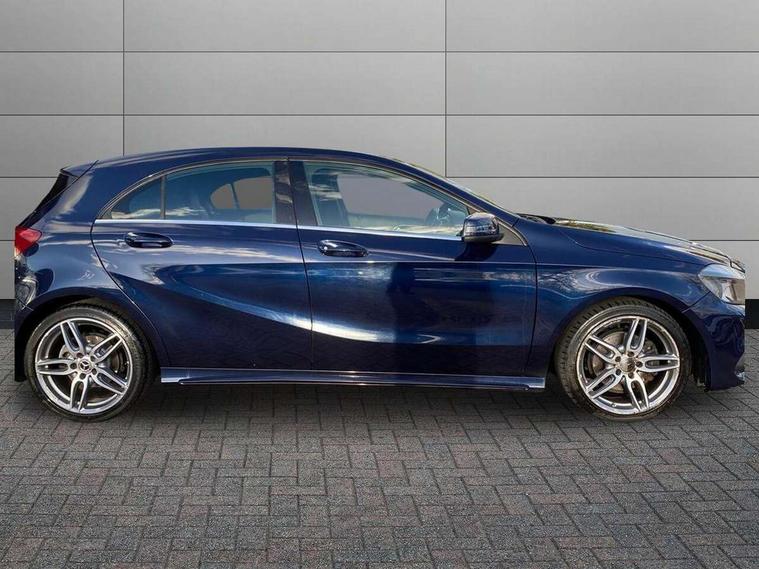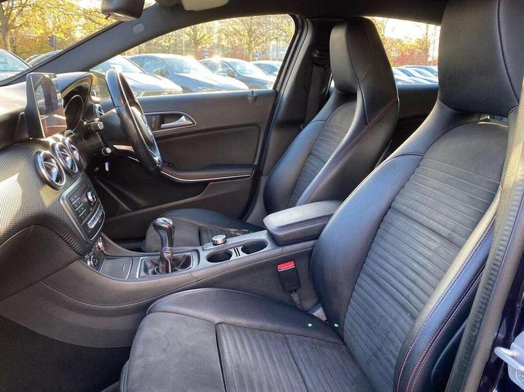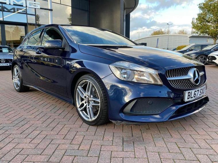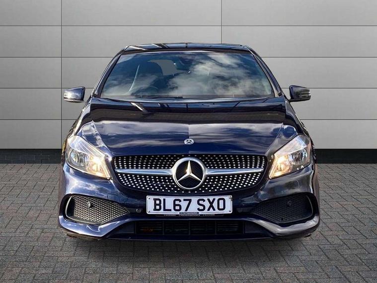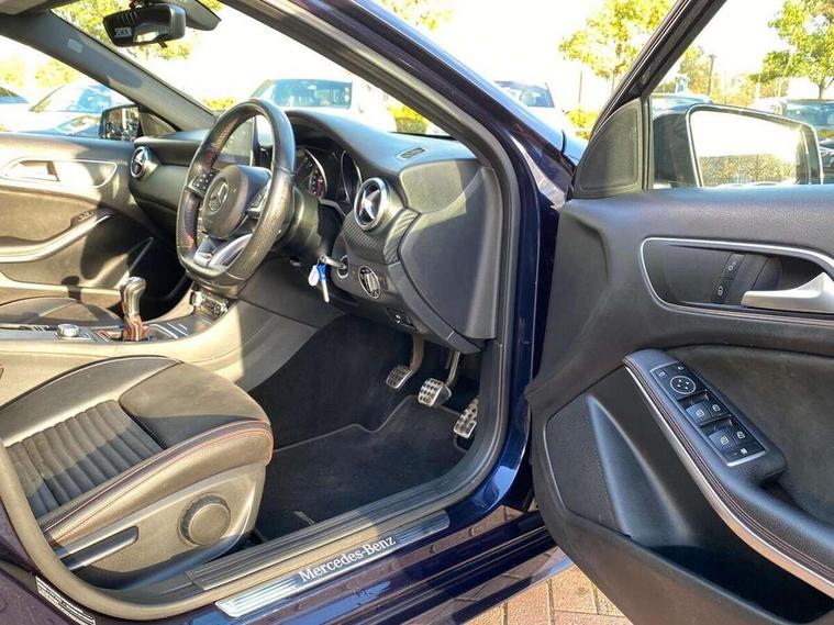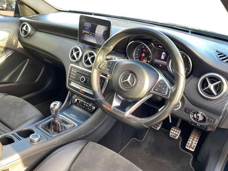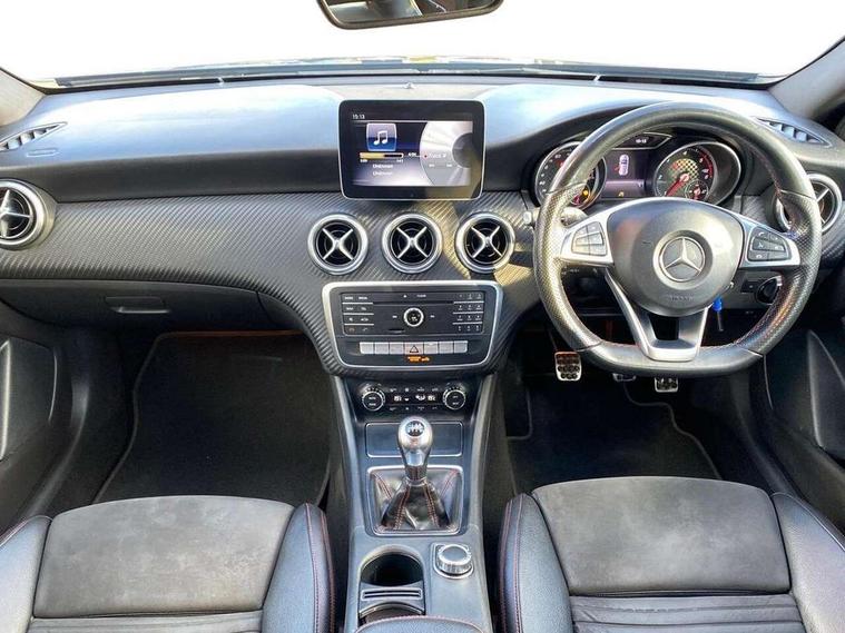 8" colour display screen, Attention assist, Bluetooth interface for hands free telephone, Bulb failure indicator, Collision prevention assist plus, DYNAMIC SELECT with a choice of driving modes (ECO, Comfort, Sport, Sport+ and Individual), External temperature gauge, Low fluid warning light, Reversing camera, Service indicator (ASSYST PLUS), Smartphone integration with Apple CarPlay, Speed dependent sports steering system, Speedtronic cruise control, Trip computer, Lowered suspension, Media interface, Mercedes Audio 20 radio/single CD + telephone keypad, USB port, Adaptive brake lights, AMG body styling, Body colour bumpers, Body colour door handles, Body colour side skirt, Daytime running lights, Diamond radiator grille with chrome pins and silver louvre + chrome insert, Electric adjustable heated door mirrors, Electric front windows, Electric rear windows, Headlamp assist, Heated rear window with timer, LED tail lights, Rain sensor windscreen wipers, Rear wiper, Twin Trapezoidal tailpipes, 1/3 to 2/3 split folding rear seats, 12V socket, 3 Spoke sports multifunction flat bottomed leather steering wheel, Ambient lighting, AMG floor mats with red stitching, Artico man-made leather/Dinamica upholstery, Auto Mercedes-Benz child seat recognition sensor, Black headlining, Brushed stainless steel sports pedals, Dual zone automatic climate control, Footwell lights, Front and rear reading lights, Front centre armrest with storage compartment, Front head restraints, Front sport seats, Height adjustable front seats, Height/reach adjustable steering column, Illuminated door sills, Illuminated glovebox, Illuminated storage compartment, Isofix rear child seat preparation, Leather gearshift, Load securing rings in luggage compartment, Luggage compartment cover, Rear head restraints, Storage compartment under load area floor, Sunvisors with illuminated vanity mirrors, Twin front cupholders, Seat comfort pack - A Class, 3 rear 3 point seatbelts, ABS with Brake Assist, Active bonnet, Adaptive brake system, Brake calipers with Mercedes-Benz lettering + perforated brake discs, Child proof door locks, Crash responsive emergency lighting, Drivers knee airbag, Dual stage driver/passenger airbags, Electronic parking brake, ESP with ASR, Front and rear seatbelt reminder, Front head airbags, Front passenger seat occupancy sensor, Front side airbags, Hill start assist, Tyre pressure monitoring system, Warning triangle and first aid kit, Window airbags, Alarm system/interior protection/immobiliser, Remote central locking, Carbon effect trim, Chrome air vent surrounds, Tirefit sealant with electric air pump,