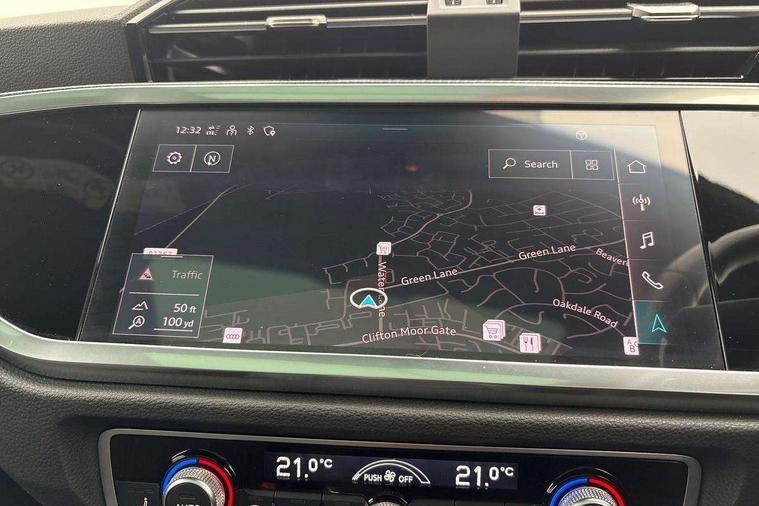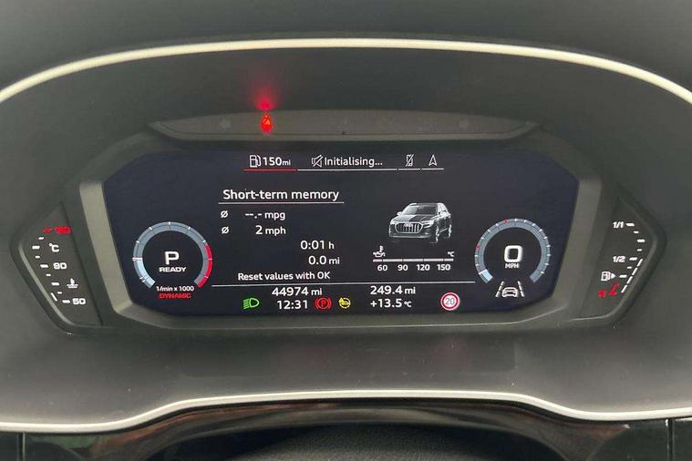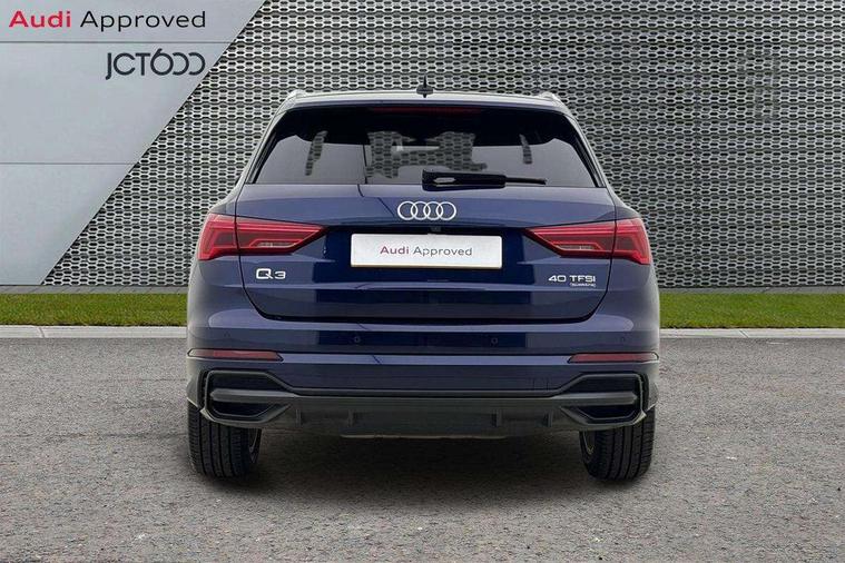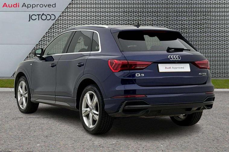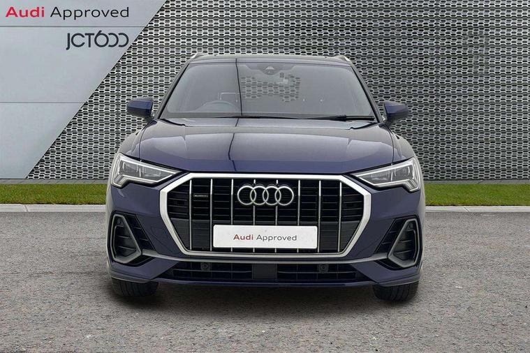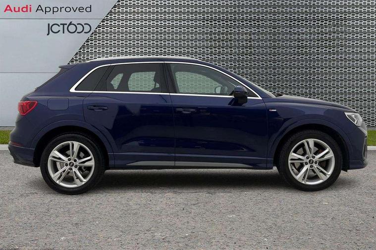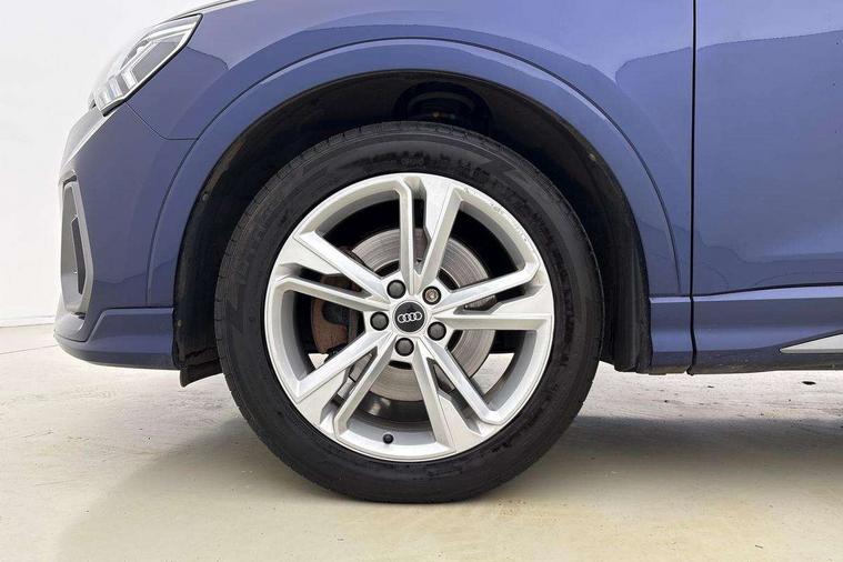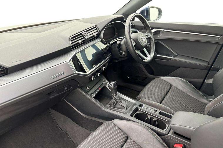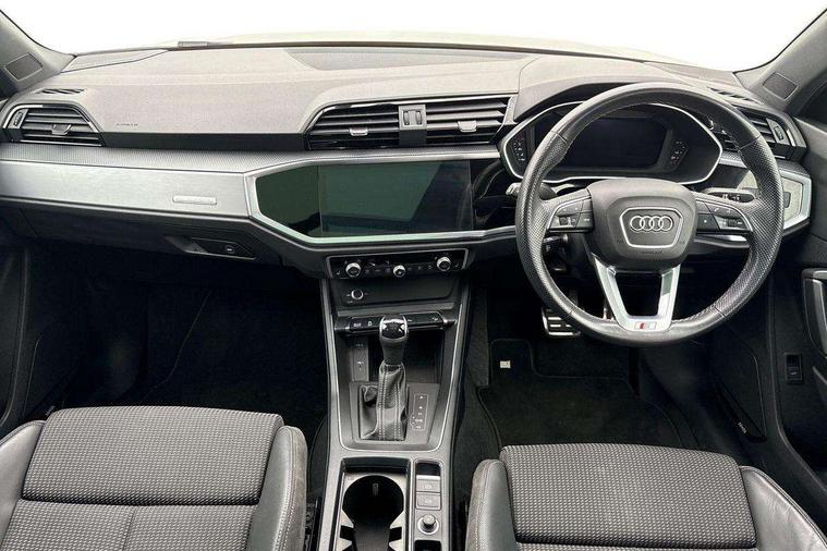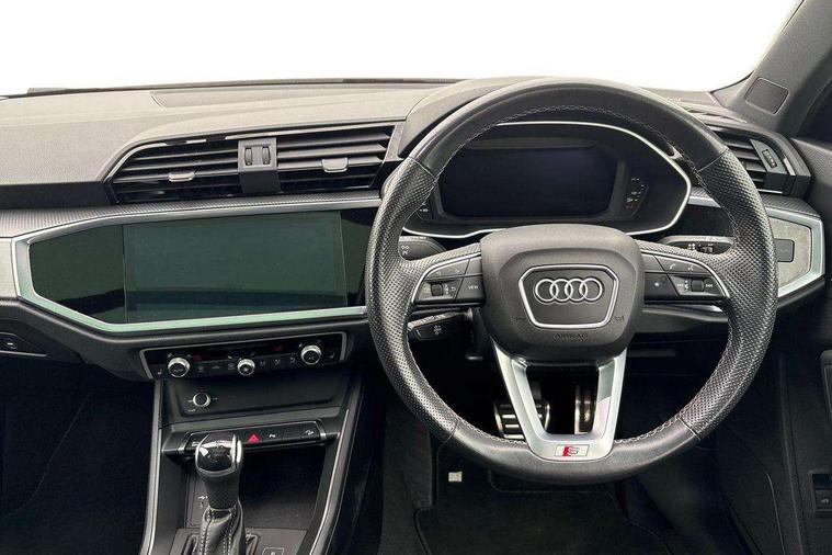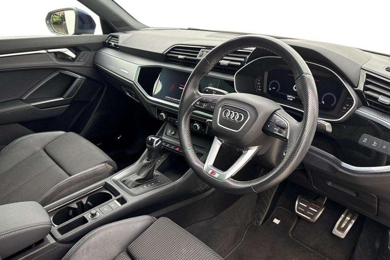Amazon alexa Integration, Audi connect safety and service (e-call), Audi drive select, Audi lane departure warning, Audi Virtual Cockpit - 10.25" display, Bluetooth interface, Camera based traffic sign recognition, Cruise control + speed limiter, MMI Navigation Plus with high resolution 10.1 inch touchscreen colour display, Power operated tailgate, Progressive steering, Rear parking sensors, Service interval indicator, Smartphone interface includes wireless Apple carplay/Android Auto, Start stop system with recuperation, Voice control system with natural language interaction, Sports suspension, 2 USB-C ports with charge and data functions, 6 passive loudspeakers, DAB digital radio module, Acoustic windscreen, Aluminium roof rails, Aluminium window trim, Auto dimming frameless rear view mirror, Body coloured bumpers, Electrically folding, adjustable and heated door mirrors with integrated LED side indicators and kerb view function for passenger side, Front and rear electric windows, Front fog lights, Front side air inlets in matt platinum grey, Front spoiler blade in matt platinum grey, Grille vertical bars in aluminium silver/Matt, High gloss black finish B and C pillars, LED headlights with LED daytime running lights and dynamic rear indicator, LED rear lights, Privacy glass dark tinted rear and rear-side windows (from B-pillar backwards), Rain and light sensors, Rear diffuser strip in matt titanium black, S line badges on front wings, S Line front and rear bumpers, Side skirt insert in matt Platinium grey, Silver chrome grille surround, Titanium black radiator grille, 12V socket in rear centre console, 40:20:40 folding with manual adjustment for 60:40 forwards/backwards position and backrest angle, Adjustable rear seat bench/backrest with centre armrest and cupholder, Black cloth headlining, Dual zone electronic climate control, Front and rear black floor mats with contrast stitching in rock grey, Front and rear headrests, Front and rear roof module including reading lights, Front centre armrest, Glove compartment lighting, Height and reach adjustable steering wheel, Illuminated door sill trims with S logo, ISOFIX child seat mounting for front passenger with airbag deactivation and outer rear seat including top tether attachment point for outer rear seats, Luggage compartment light, Manual front seats with height adjustment, Perforated leather gearknob, Stainless steel luggage compartment sill finisher, Stainless steel pedals, Non smoking pack - Q3, 3x3 point rear seatbelts, 6 airbags - Driver, front passenger, curtain and side windows, Audi pre-sense front with pedestrain and cyclist recognition, Electrically operated child locks on rear doors, Electromechanical parking brake, Electronic stabilisation control including ABS, ASR and EDL, Hill descent control, Hill hold assist, Pre sense basic, Seatbelt monitoring, Tyre pressure warning, Warning triangle and first aid kit, Anti theft alarm, Anti theft wheel bolts, Remote central locking, Dark matt brushed aluminium inlay, Detail dashboard around MMI touch colour display in glass look, black with surround in aluminium look, Leatherette door armrest,