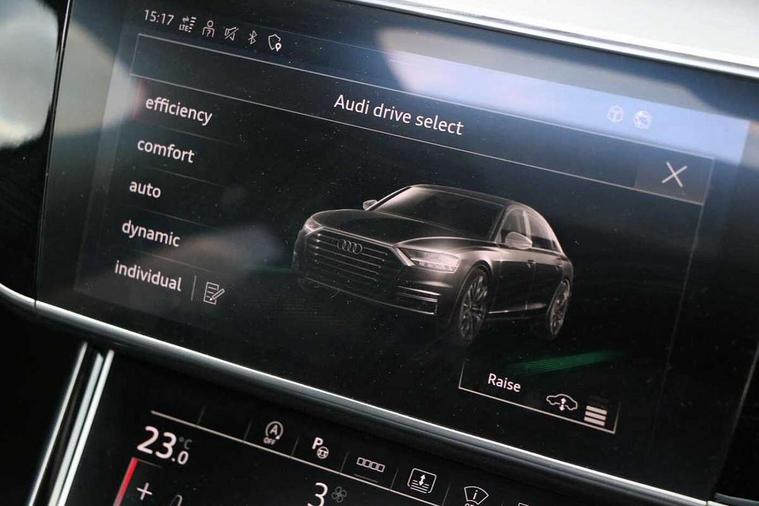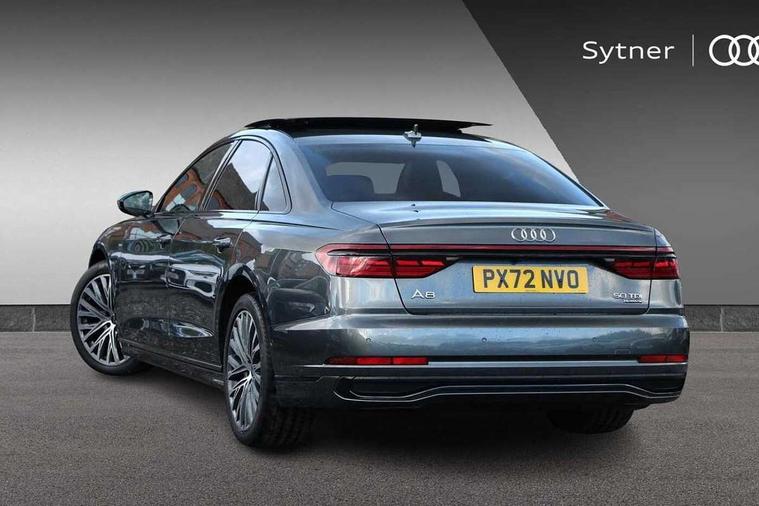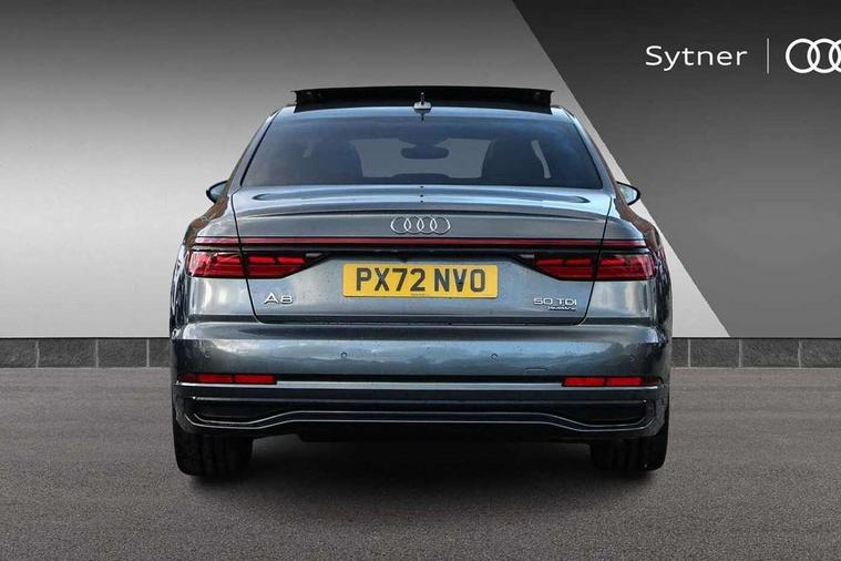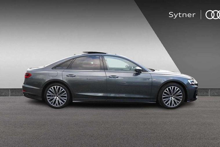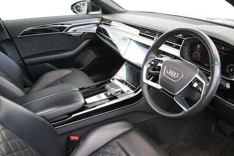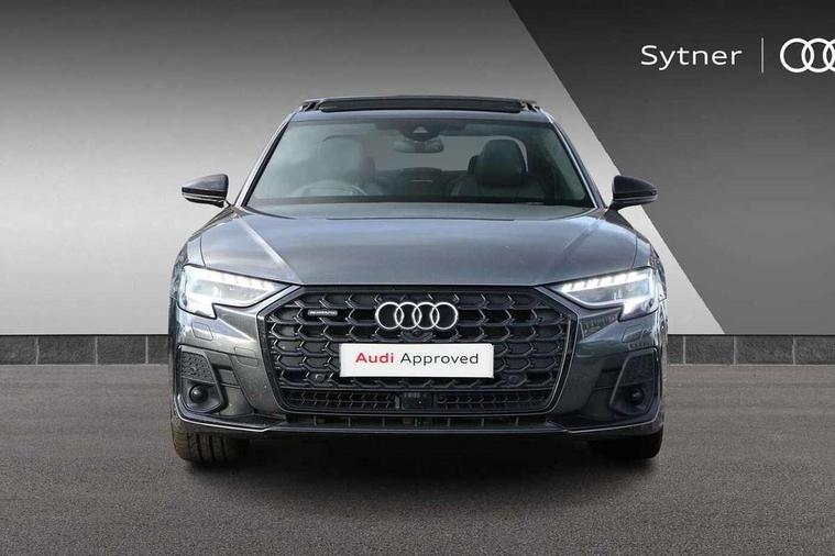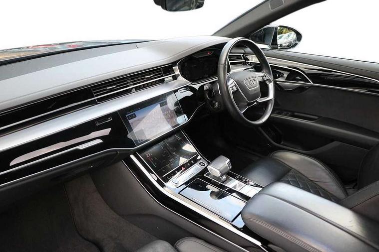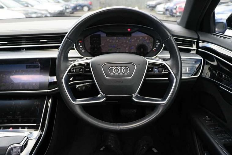 'Lights On' Reminder warning buzzer, Adaptive cruise control with cruise assist, emergency assist, efficiency assist, swerve assist, turn assist and speed limiter, Audi connect safety and service (e-call), Audi drive select, Audi parking system plus with front and rear sensors, Audi phone box with wireless charging, Audi virtual cockpit, Audi wireless smartphone interface, Bluetooth interface, Camera based traffic sign recognition, Convenience key, Electro - mechanical power assisted steering, Head up Display, MMI navigation plus with MMI touch + Twin touch screens with haptic feedback, Operating buttons in black, glass look with haptic feedback including extended aluminium look, Power door closure, Power operated tailgate, Rear view camera, Remote fuel filler release, Service interval indicator, 24 litre AdBlue tank, 48V Mild hybrid technology, 8 speed transmission with hill hold assist, 82 litre fuel tank, Adaptive air suspension, Diesel particulate filter, Quattro all wheel drive with self locking centre differential, Audi music interface, Audi sound system, DAB digital radio module, DVD System, MMI radio plus, USB connection, Acoustic double glazing, Audi space frame, Auto dimming rear view mirror, Body colour bumpers, Body colour door handles, Body colour side protection with aluminium trim strips, Electric front windows, Electric rear windows with isolation switch, Electrically adjustable heated folding + automatically dimming exterior mirrors with memory function and integrated LED indicators, Headlight cleaning system, Heat insulating glass in side and rear windows, Heat insulating glass windscreen, Heated rear window, Heated windscreen washer jets, High beam assist, LED brake lights, LED daytime running lights, OLED rear lights with changeable rear light signature, Privacy glass, Rear boot, Rear side wing doors, Side skirts, Third brake light, 12V socket, 2 zone automatic air conditioning, 3 seat rear bench with centre armrest in 2nd row, 4 way electric lumbar support for driver and front passenger, Black cloth headlining, Centre console with cupholders, Comfort centre armrest, Door pockets with bottle holder, Driver and front passenger side sunvisors with illuminated vanity mirrors, Dust/pollen filters, Electric front seats with memory function, Electric sunblinds for rear window and rear door windows, Front floor mats, Glove compartment cooling, Heated front seats, Height/reach electric steering column with easy exit function, Isofix child seat mounting points on outer rear seats, Leather gearknob, Passenger footwell storage net, Reading lights, Rear floor mats, Rear headrests, Roof mounted sunglasses holder, Single front passenger seat, Valcona leather upholstery with front sports seats in diamond quilted, Black exterior styling pack - A8 Black Edition, Chrome exterior pack - A8, LED interior lighting pack - A8, 3 point seatbelts on all rear seats, ABS/EBD, Active front headrest system, ASR traction control, Audi pre sense basic, Audi pre sense front, Black brake calipers, Driver/Front Passenger airbags, EDL traction control, Electromechanical parking brake, ESP, Extended pedestrian protection measures, Front and rear disc brakes, Front and rear side airbags with head airbag system, Front passenger airbag deactivation, Rear child proof door locks, Seatbelt reminder + electric contact in buckle + advanced safety equipment, Tyre pressure loss indicator, Warning triangle and first aid kit, Anti theft alarm tow away protection, Anti-theft wheel bolts and wheel loosening detection, Remote central locking, Dark matt brushed aluminium lower inlays,