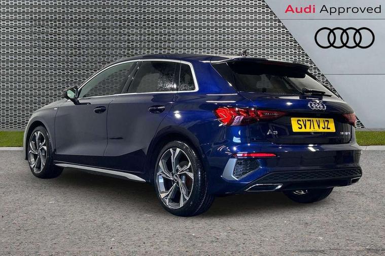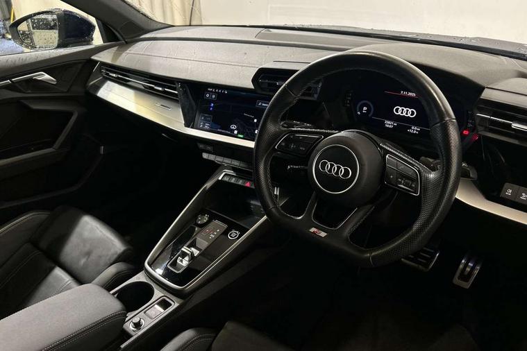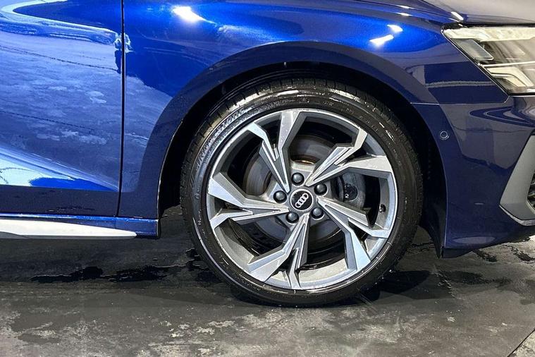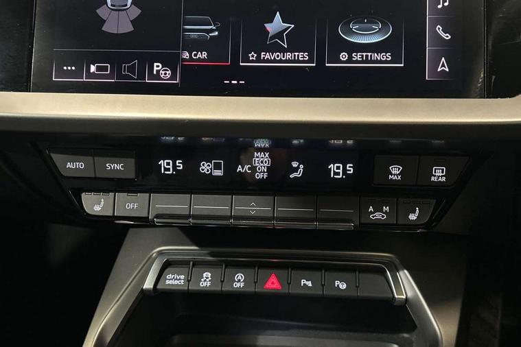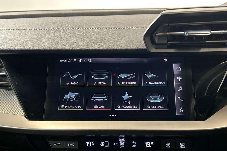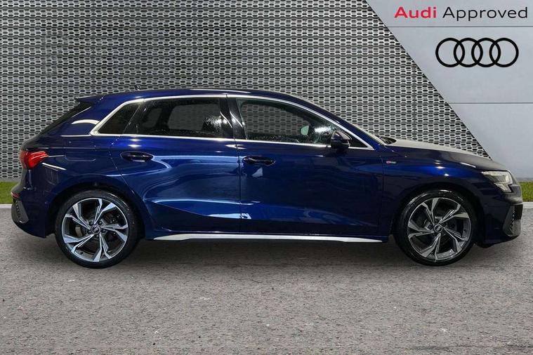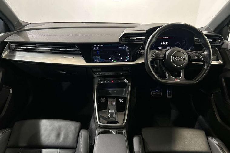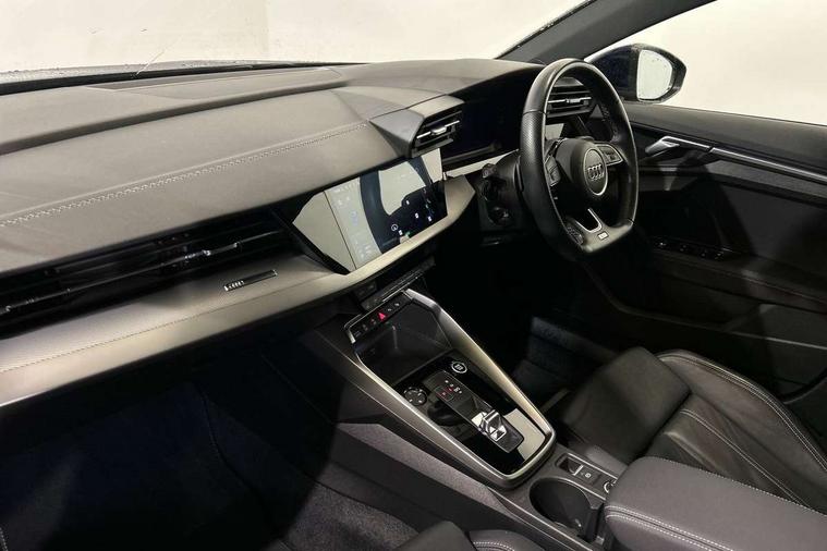 Audi connect emergency call and service, Audi drive select (Auto, Comfort, Dynamic, Efficiency and Individual), Audi smartphone interface, Audi Virtual Cockpit - 10.25" digital and colour instrument cluster, Automatic start/stop system with recuperation, Bluetooth interface, Collision avoidance assistant, Electromechanical power speed sensitive steering, Lane departure warning system, MMI Navigation Plus with high resolution 10.1" colour touch screen display, Service indicator, Trip computer, Voice control system with natural language interaction, 2xUSB-C connection with data and charging functions, 6 passive loudspeakers, DAB Digital radio, 3rd brake light, Acoustic glass windscreen, Aluminium window trim, Auto dimming frameless rear view mirror, Electrically adjustable/heated/folding/auto dimming door mirrors with integrated LED indications + kerb view function for passenger side, Front electric windows, Illuminated aluminium inserts front door sills with S logo, LED daytime running lights, LED headlights with LED rear lights and dynamic rear indicators, Light and rain sensors, Privacy glass - dark tinted rear window, rear door and side windows, Rear electric windows, Rear side air outlets in grained matt black, Rear wiper, S line bumpers, S roof spoiler, 12V socket and storage compartment in front centre console, 40/20/40 split folding rear seat bench with cupholder, Black cloth headlining, Dual zone electronic climate control, Front and rear centre armrest in leather, Front and rear headrests, Front/rear floor mats, Height and reach adjustable steering wheel, Interior lighting - glove compartment light and right hand side, Luggage compartment floor covering, Manual boot compartment lid, Manually adjustable front seats, Seat side bolsters, Stainless steel pedals and front footrest, Twin leather upholstery with front sports seats S embossed logo, Aluminium interior elements pack - A3 Sportback, S line styling pack - A3 Sportback, 3x3 point rear seat belts, Driver and front passenger airbag with passenger airbag deactivation, Electronic Stabilisation Control (ESC) including ABS, ASR and EDL, First aid kit with warning triangle and 2 safety vests, Front side airbags with head airbags and interaction airbag, Hill hold assist, Pre-sense front with pedestrian and cyclist detection, Seatbelt monitoring, Tyre pressure loss indicator, Anti theft alarm, Anti-theft wheel bolts, Electronically operated child lock, Immobiliser, Remote control central locking, Accent surfaces in the dashboard and centre console in platinum grey silk effect paint finish, Dark spectrum aluminium inlays,