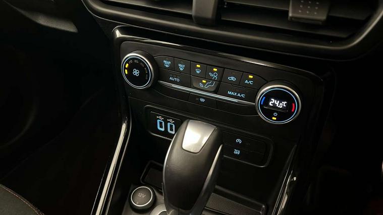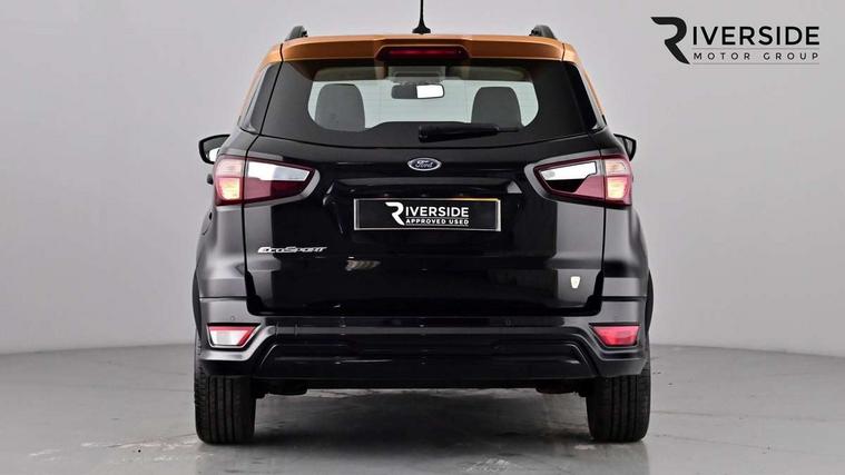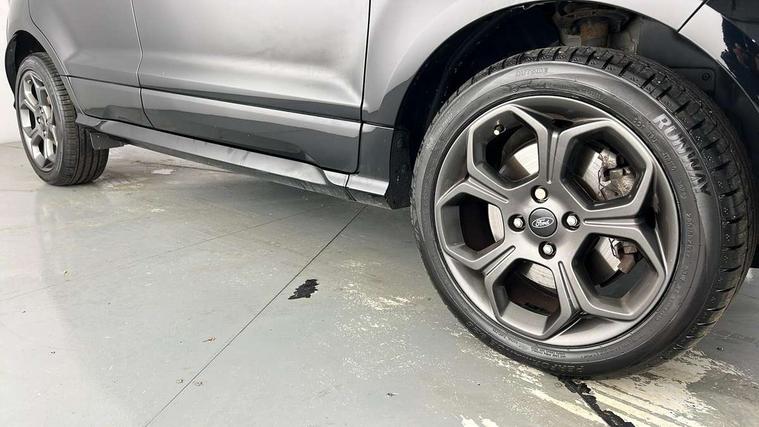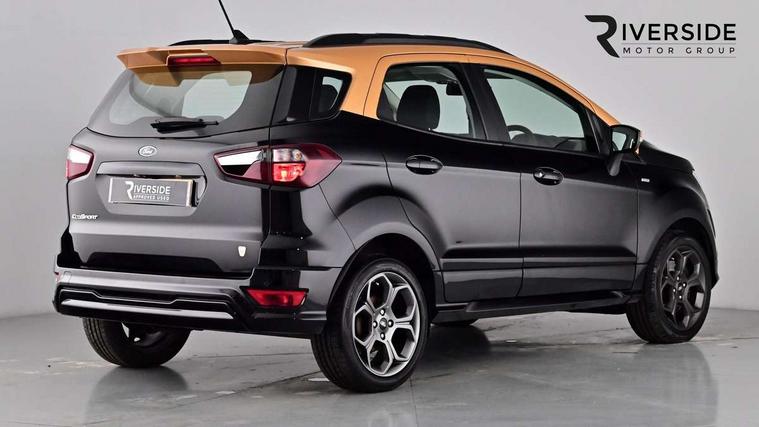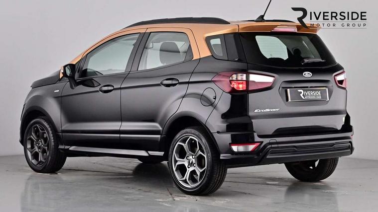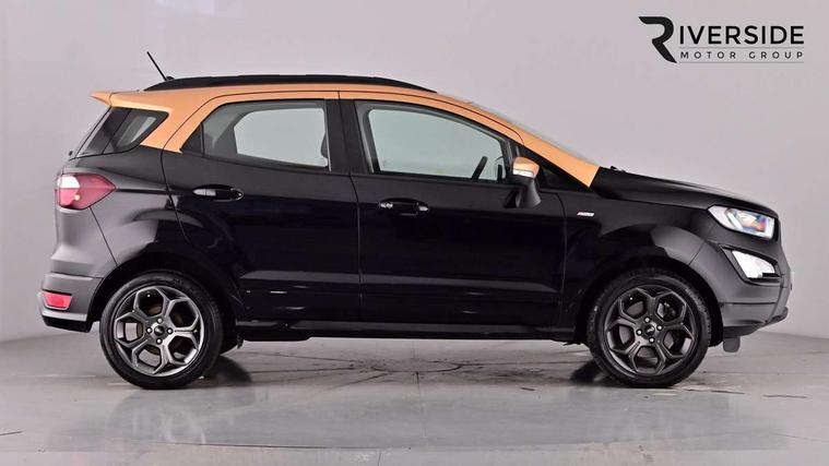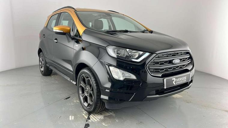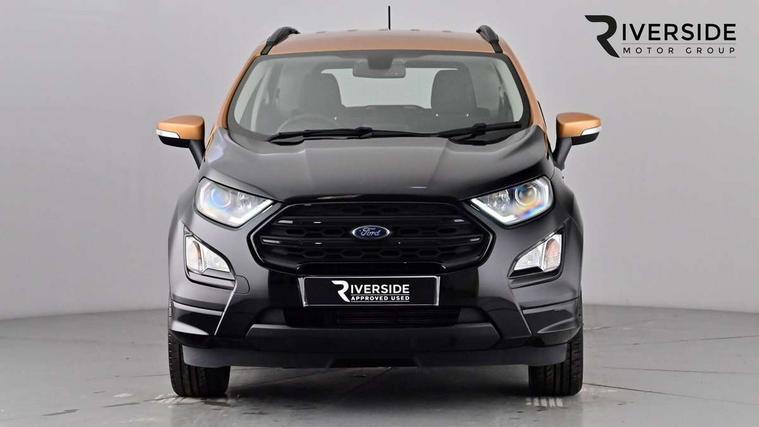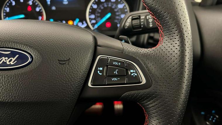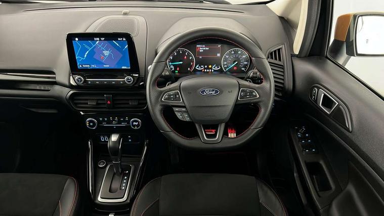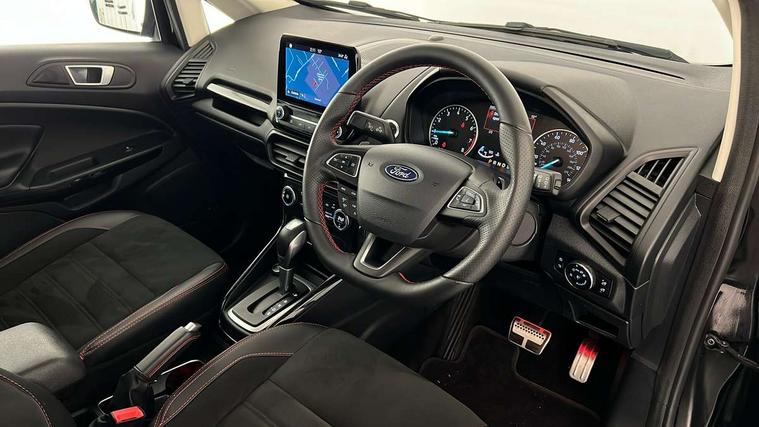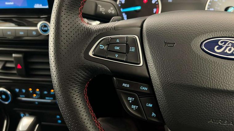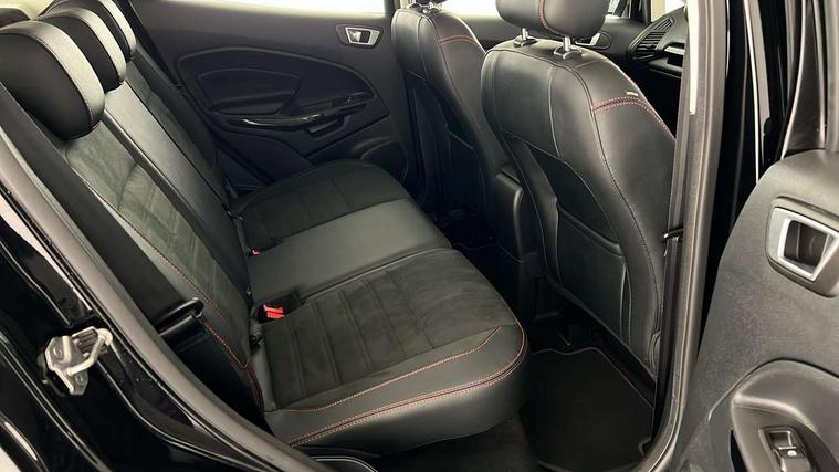 Cruise control, Easy fuel capless refuelling system, PAS, SYNC 3 nav system with DAB radio, 8" screen, voice control, emergency assistance, Apple car play/Android auto, 2x USB, Ford pass connect, Trip computer, Sports suspension, Steering wheel mounted audio controls, 'Quickclear' heated windscreen/heated washer jets, Auto dimming rear view mirror, Automatic headlights, Black roof rails, Body colour door handles, Body coloured bumpers, Electrically adjustable and heated door mirrors, Front door threshold plates with ST-Line logo, Front fog lights, Headlight levelling control, Large rear spoiler, Power foldable door mirrors with puddle lights, Power front and rear windows with global opening/closing, Rain sensing front wipers, Rear wiper, ST-Line body styling kit, ST-Line front grille, 12V socket in front and rear, 60/40 split rear seats, 7 shade adjustable ambient lighting, Centre console with sliding front armrest, Cooled glovebox, Courtesy lights with map reading light, Driver seat height/lumbar adjust, Driver's side glovebox, Driver/passenger sunvisors and lidded vanity mirrors, EATC - Electronic Auto Temperature control, Folding grab handles, Footwell ambient lighting, Front head restraints, Front seat back map pockets, Front/rear floor mats, Illuminated glovebox, Illuminated luggage compartment, Isofix system on outer rear seats, Leather steering wheel/gearshift/handbrake lever with red stitching, Luggage compartment carpet, Overhead console with sunglasses holder, Partial leather upholstery, Rake adjustable rear seats, Reach + rake adjustable steering column, Rear headrests, Stainless steel sports pedals, Steering wheel with chrome inserts, Storage drawers under front seats, Tie down hooks, Variable boot floor, Rear view camera pack - Ecosport, 3x3 point rear seatbelts, ABS, Child locks on rear doors, Curtain airbags, Driver airbag, Drivers knee airbag, Electronic Stability Programme with hill launch assist, Emergency brake assist, Front passenger airbag deactivation, Front side airbags, Passenger airbag, Seatbelt reminder for driver and front passenger, Traction control, Tyre pressure monitoring system, Immobiliser, MyKey system, Remote central locking, Thatcham 1 volume sensing alarm, Tyre inflation kit,