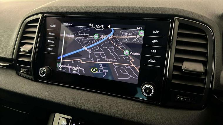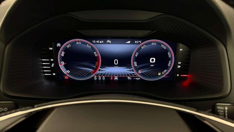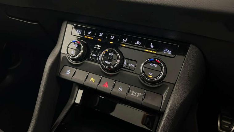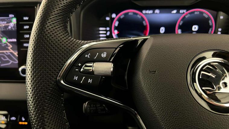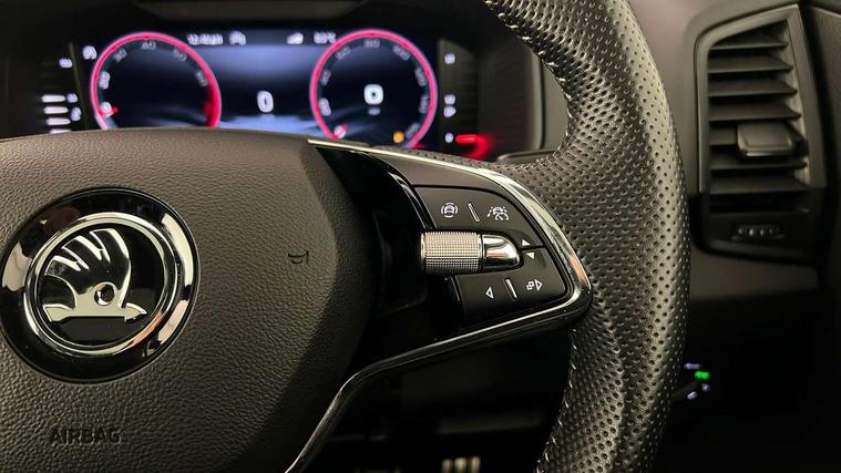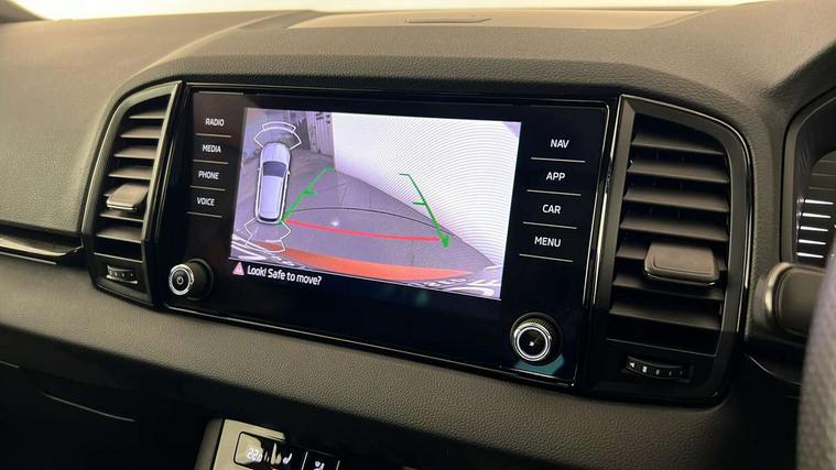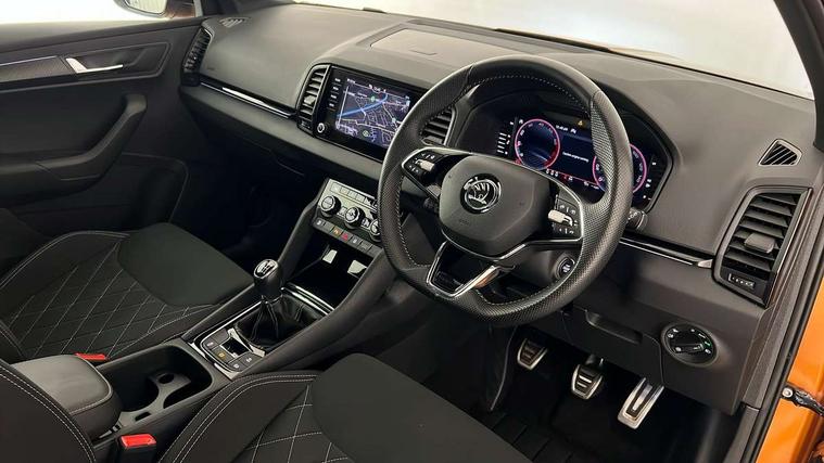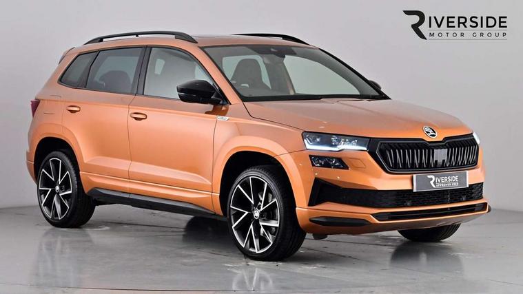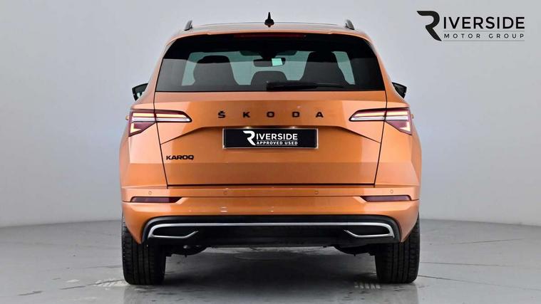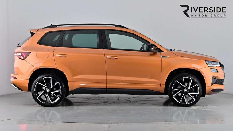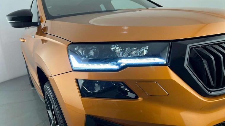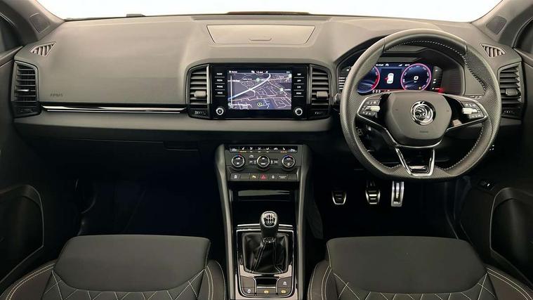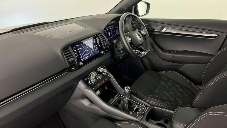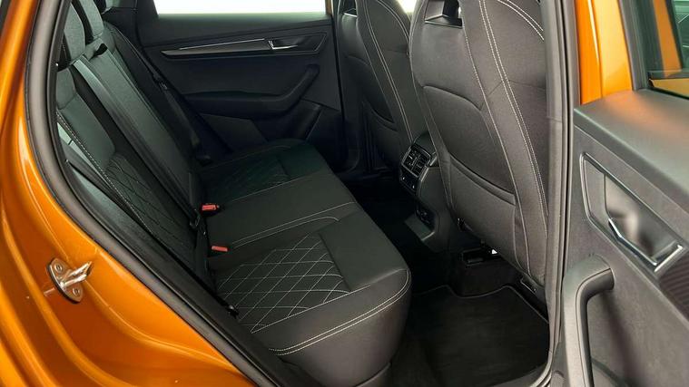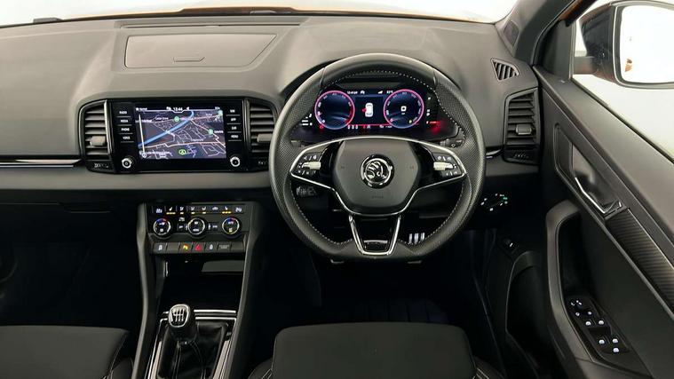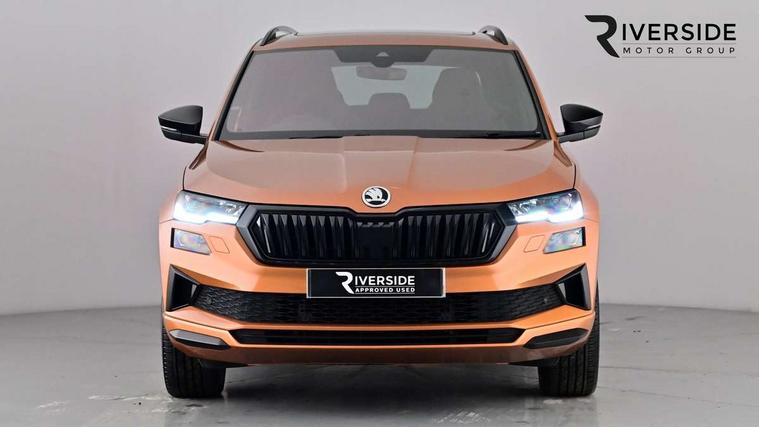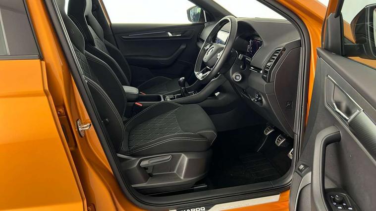 8" Digital display, Care connect, Driver fatigue sensor, Emergency services call system, Outside temperature gauge, Service interval indicator, SmartLink wireless for Apple and wired for Android, Start/stop system with regenerative braking, USB C Port x 2 in front centre console, Virtual cockpit, Virtual pedal with electrically operated boot door, 8 Speakers, DAB radio with Bluetooth, USB connection, Wireless charging without wireless aerial connection, Acoustic glass, Aero front windscreen wipers with intermittent function, Auto dimming rear view mirror with light and rain sensors, Black door mirrors, Black electric window control buttons, Black radiator grille, Black roof rails, Body colour door handles, Electric front and rear windows with child proof lock, Front door steps with SportLine logo, Heated rear windscreen, LED daytime running lights, LED rear lights with high functionality welcome effect and dynamic indicators, Light assistant (coming/leaving home/tunnel light), Panoramic sliding sunroof, Plastic scuff plates, Privacy glass, Protective door side sills in body colour, Rear diffuser, Rear side wing doors, Rear spoiler, Rear window wiper with washer system and intermittent control, Safety reflectors on front doors, Skoda lettering on tailgate in black, Sportline badge on front fender, Sportline decorative inserts with badging, Sports front and rear bumpers, 1.5 litre bottle holders in driver and front passenger door panels, 12V socket in boot, 12v socket in front centre armrest with storage compartment and rear air vents, 3 rear height adjustable headrests, 3 seat bench in 2nd row, 3 spoke leather sports multifunction steering wheel and silver stitching, 4 foldable roof handles with rear coat hooks, Black floor carpet, Black roof headlining, Chrome inner door handles, Double sided boot floor, Foldable hooks in the boot, Front head restraints, Height adjustable front three point seats belts with tensioners, Height/reach adjust steering wheel, Ice scraper, Illuminated glovebox, Illuminated luggage compartment, Isofix child seat preparation outer rear, Manual lumbar support for front seats, Pen holder, Pollen filter, Rear boot cover, Rear reading lights, Rear seats fixed folding and divided 60:40, Rubbish bin door, Safety vest holder, Single front passenger seat, Storage box in upper central dashboard closed, Sunvisors with illuminated vanity mirrors, Textile floor mats, Ticket holder, Titan black interior ceiling, Welcome animation with sportline logo, Boot pack - Karoq, Light Pack - Karoq, Parking pack - Karoq, Automatic door unlocking in case of crash, Automatic fuel cut off in case of crash, Child locks on rear doors, Driver airbag, Electronic parking brake with auto hold function, Emergency rear braking signal, ESC including ABS, MSR, ASR, EDS, HBA, DSR, RBS, MKB and traction control, Front side airbags, Hill hold control, Knee airbags, Passenger airbag with switch-off function, Pedestrian monitor, Seatbelt reminder signalisation and pretensioner for all seats, Three point seatbelts rear, Two tone horn, Tyre pressure display, Tyre pressure monitor, Alarm with interior monitoring, back up horn and tilt sensor with safe function, Electronic engine immobiliser, Keyless entry and start/stop, Remote central locking with 2 remote folding keys, Black air vent surround, Black centre console, Satin black dashboard, Satin black door trim, 19" Sagitarius anthracite alloy wheels with matt black aero inserts, Anti-theft wheel bolts protection, Matt black aero hub caps, Tool kit,